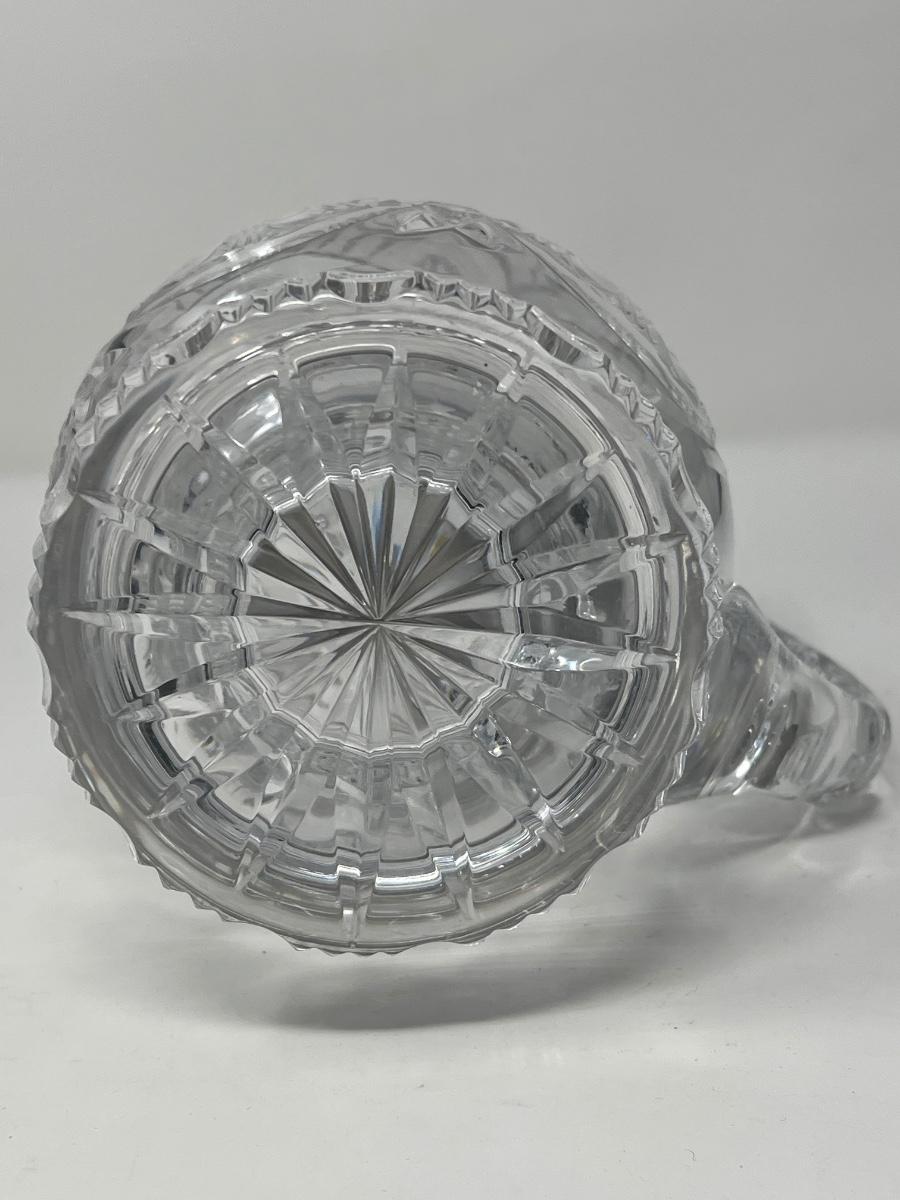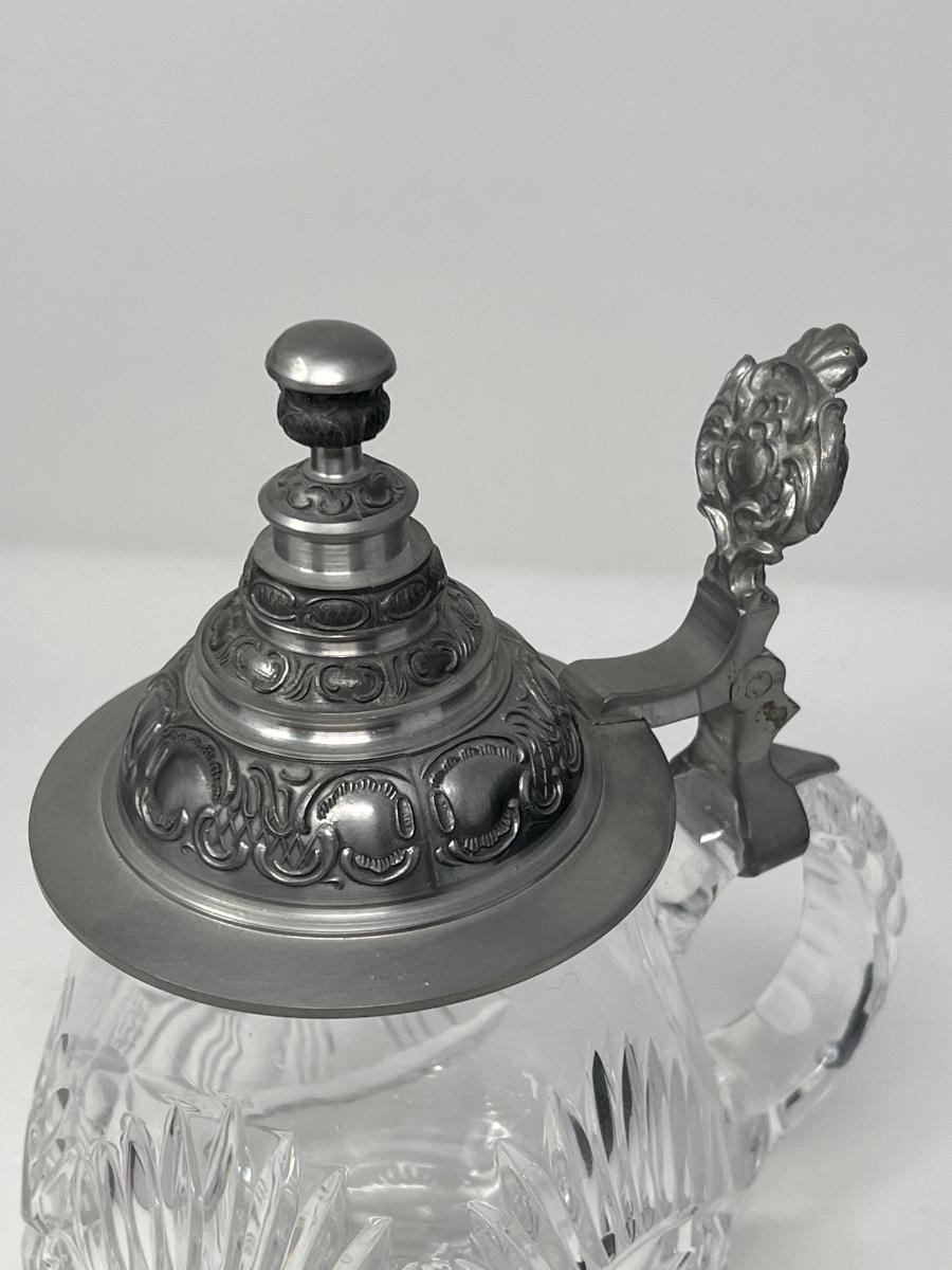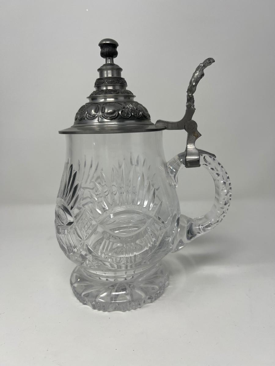 9.5” tall intricately cut crystal stein with hinged pewter lid. 7” wide to handle.