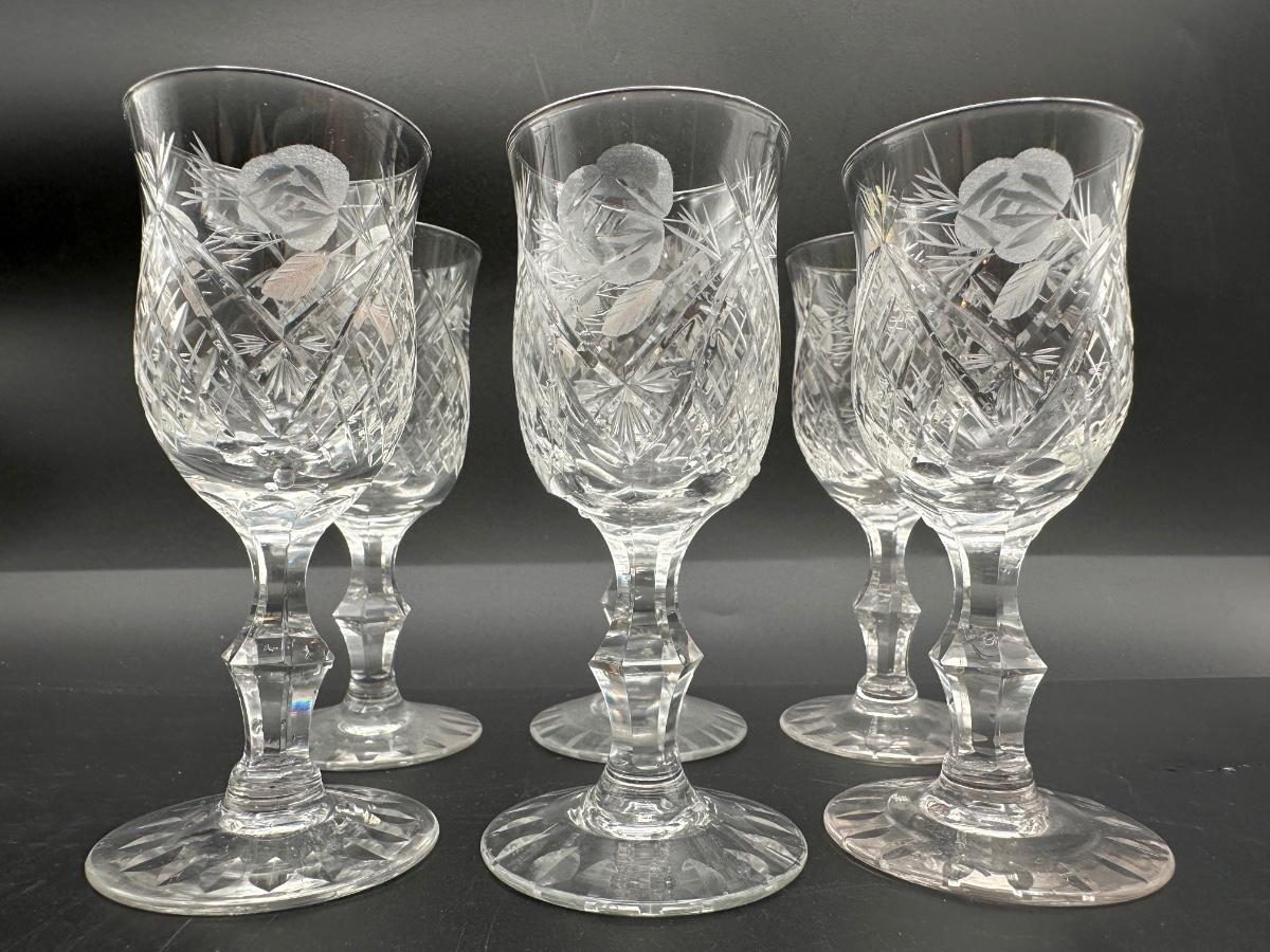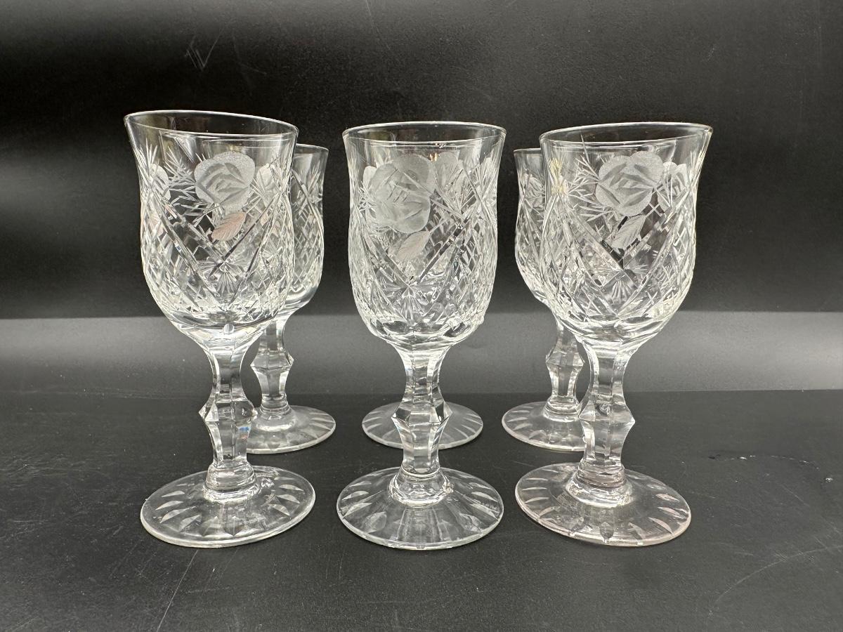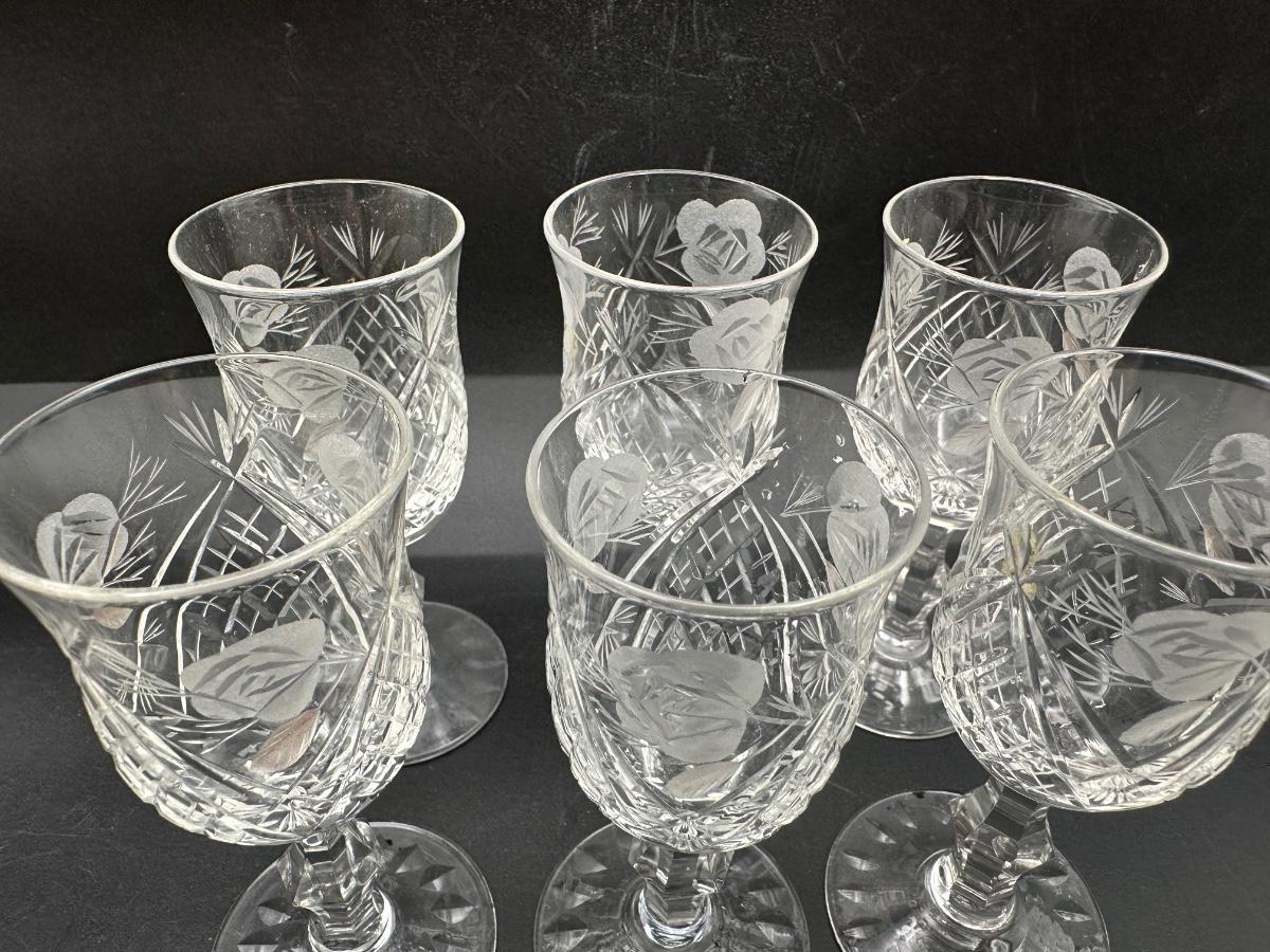 Set of 6 Cut Crystal Wine Glasses with Etched Rose Design