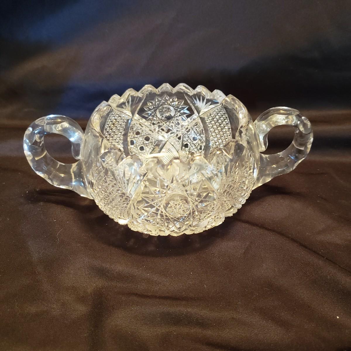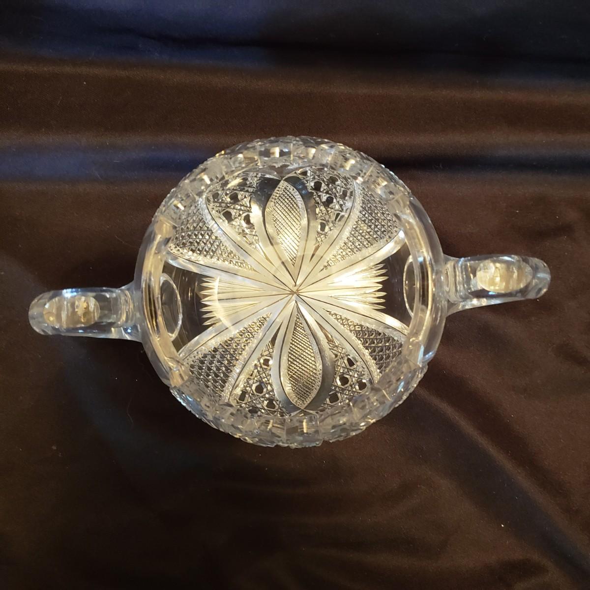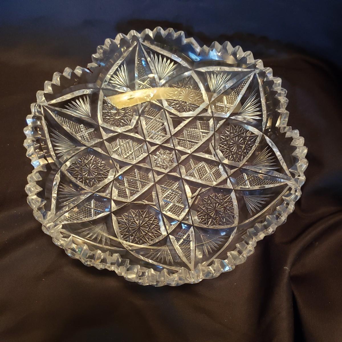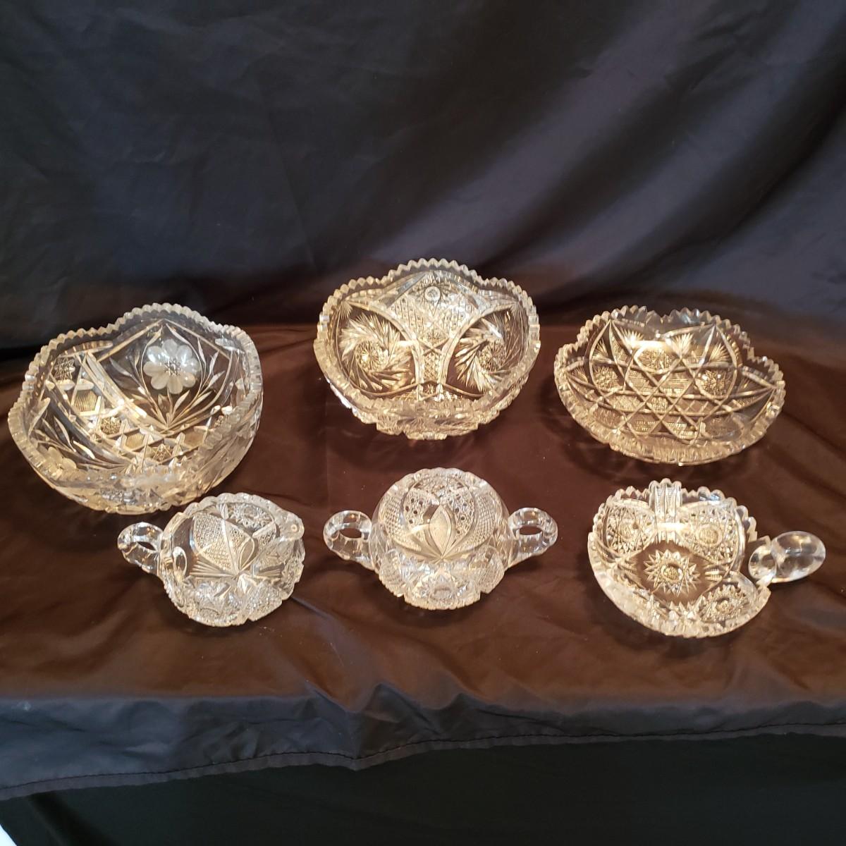 The two cut glass bowls measure approximately 8" x 3" H. The smaller bowl measures 8" x 2" H. The cream and sugar set measure approximately 6" x 2" H. The smaller handled candy dish measures 7" x 1" H. These pieces are heavy. They are all designed with beautiful etching. They appear not to be signed by the manufacturer.