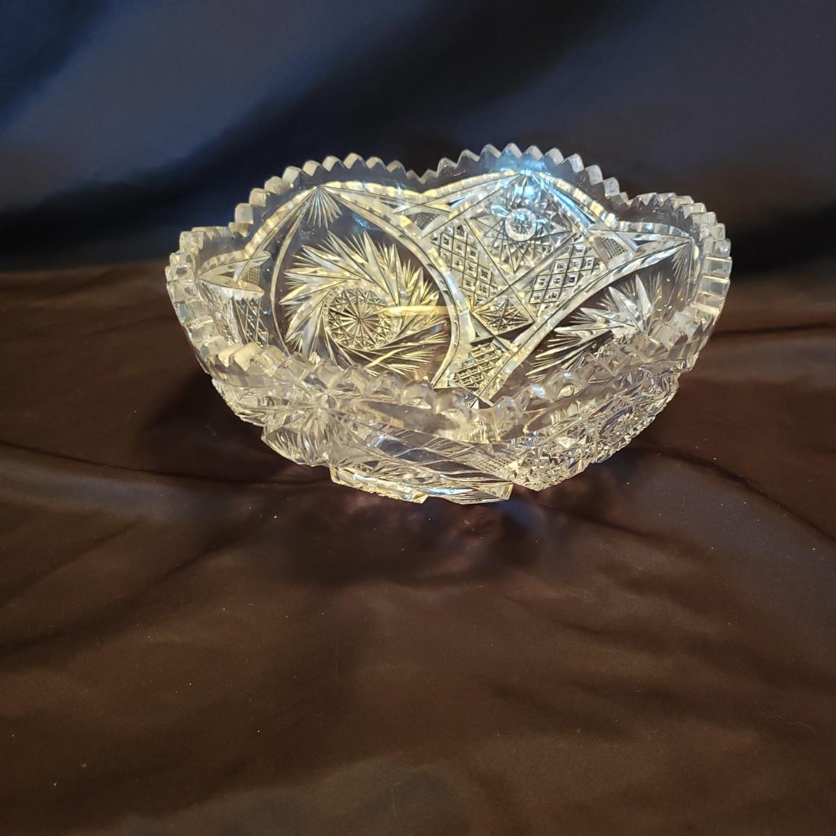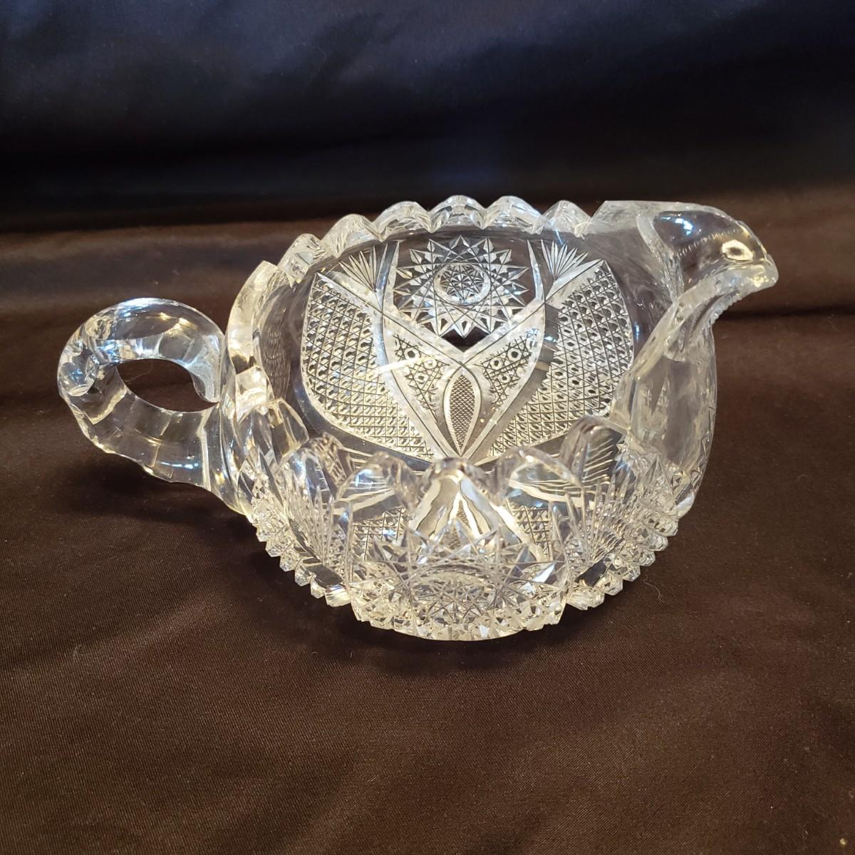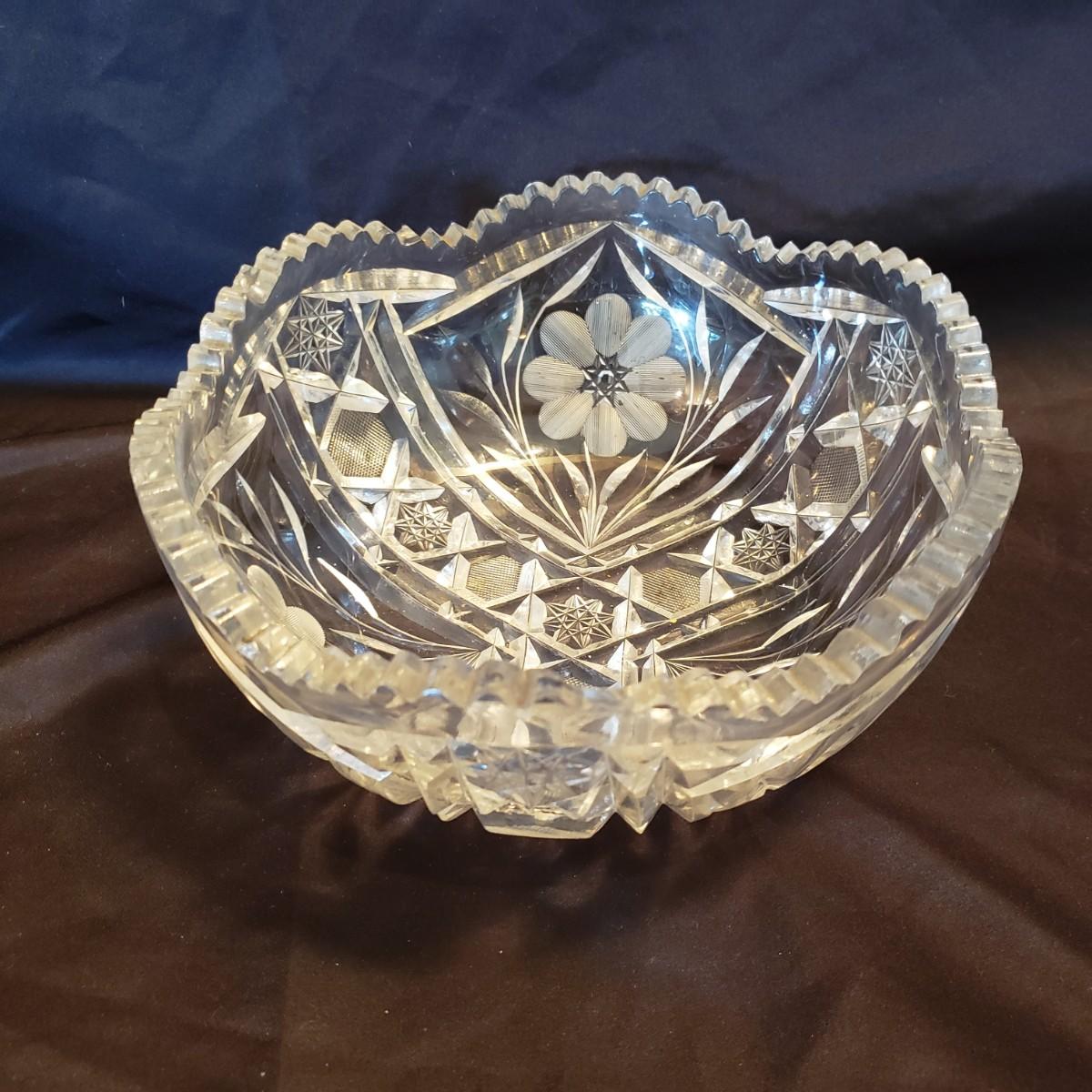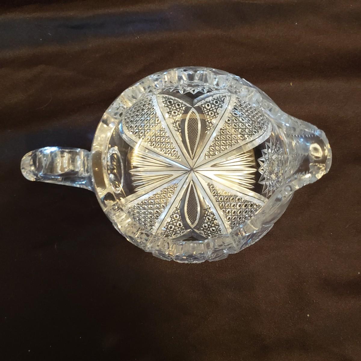 The two cut glass bowls measure approximately 8" x 3" H. The smaller bowl measures 8" x 2" H. The cream and sugar set measure approximately 6" x 2" H. The smaller handled candy dish measures 7" x 1" H. These pieces are heavy. They are all designed with beautiful etching. They appear not to be signed by the manufacturer.