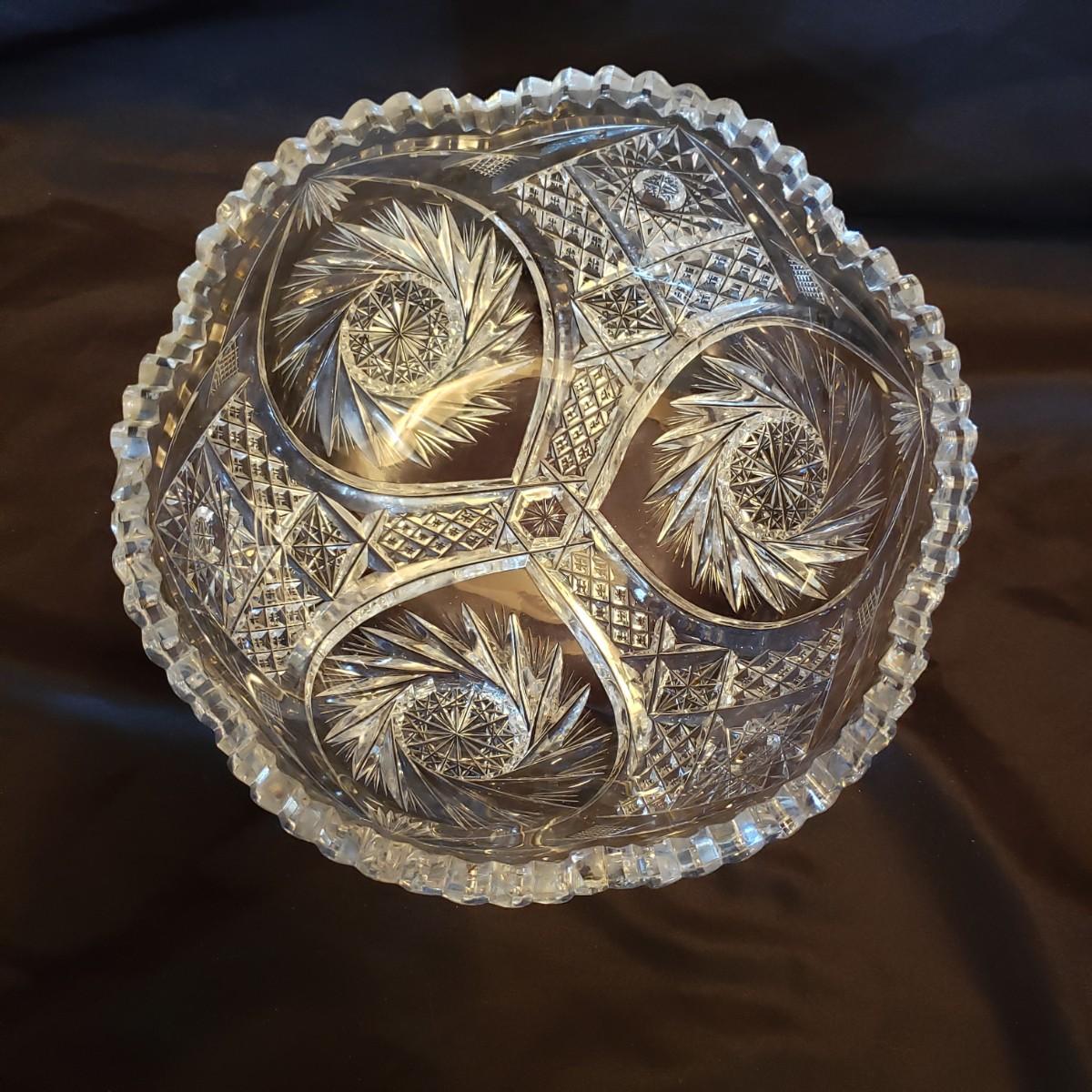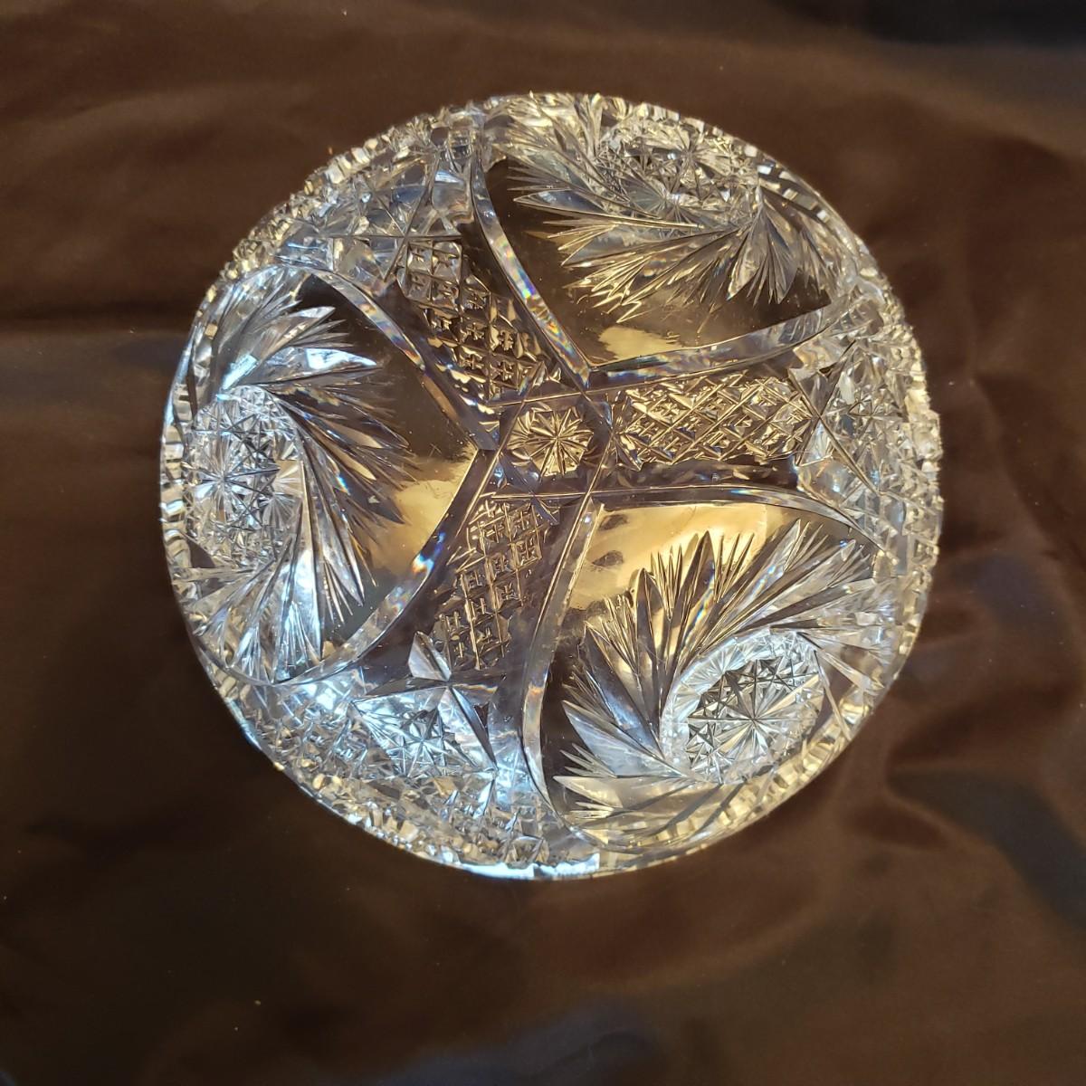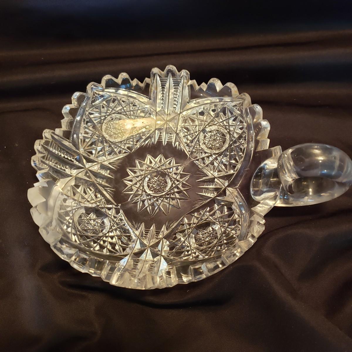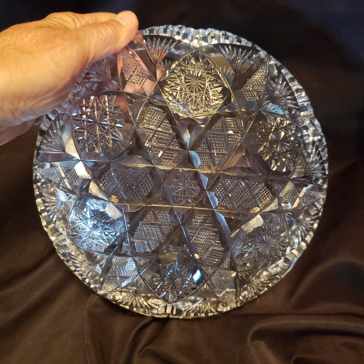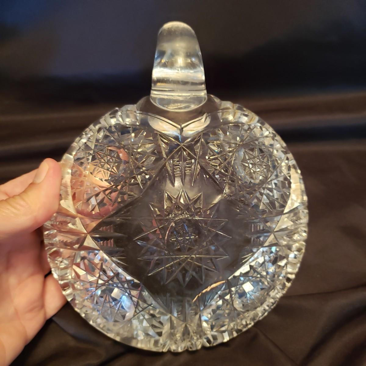 The two cut glass bowls measure approximately 8" x 3" H. The smaller bowl measures 8" x 2" H. The cream and sugar set measure approximately 6" x 2" H. The smaller handled candy dish measures 7" x 1" H. These pieces are heavy. They are all designed with beautiful etching. They appear not to be signed by the manufacturer.
