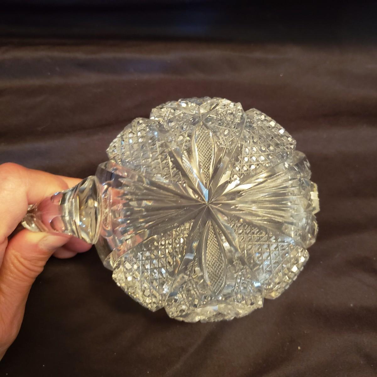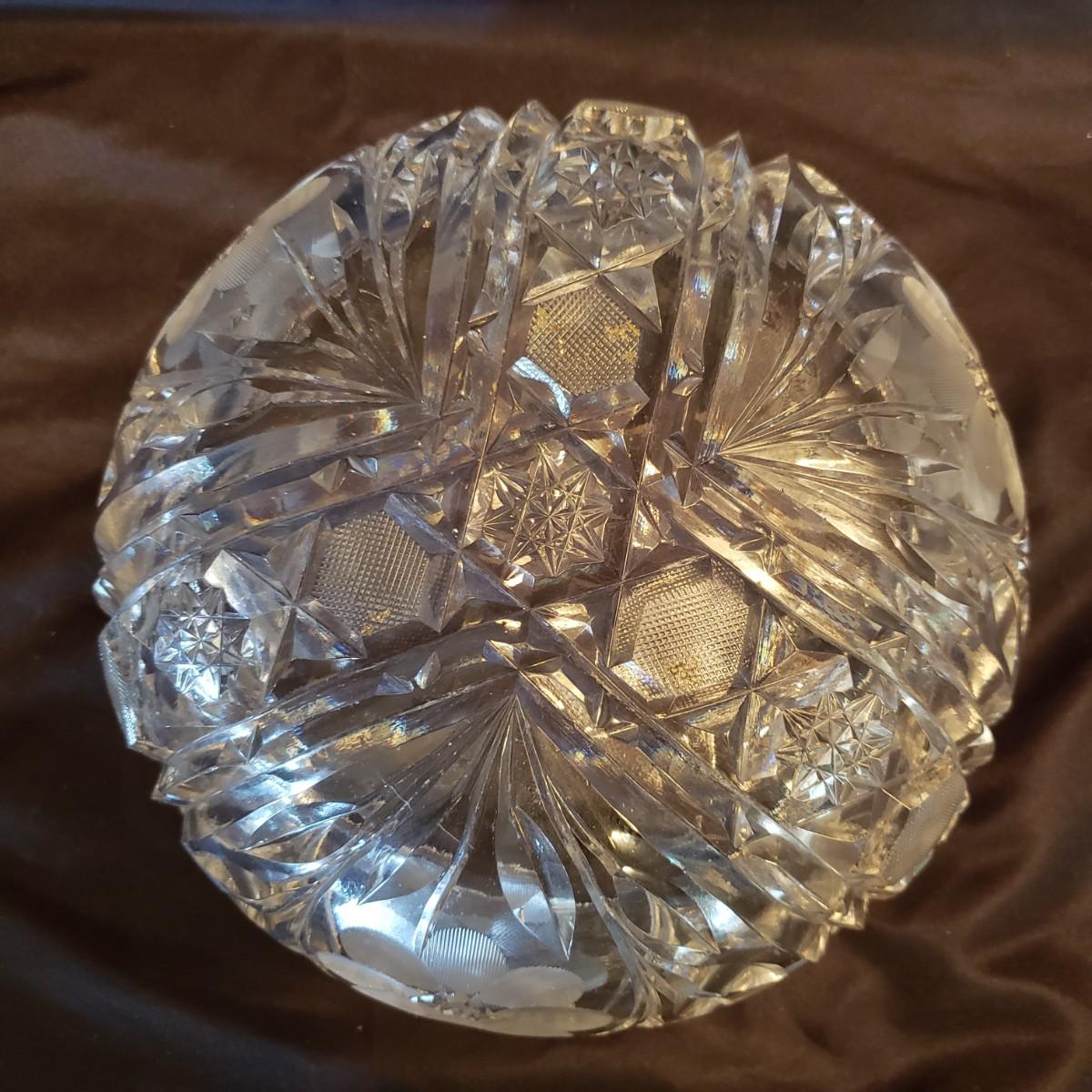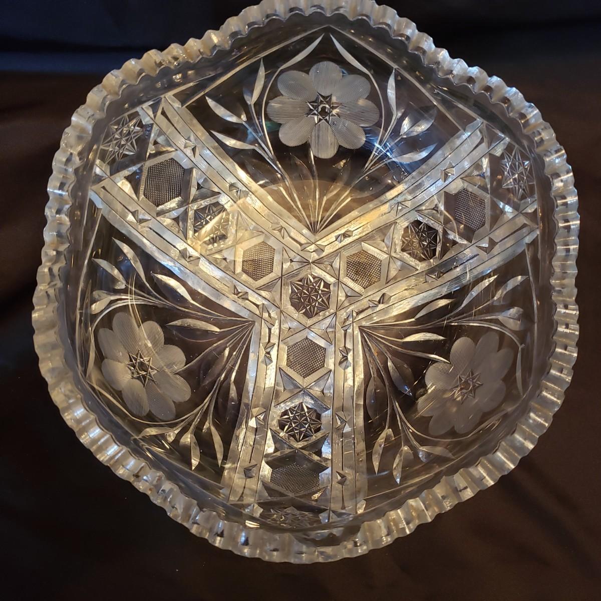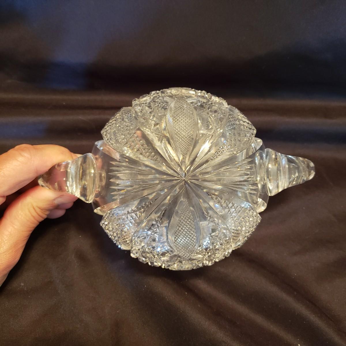 The two cut glass bowls measure approximately 8" x 3" H. The smaller bowl measures 8" x 2" H. The cream and sugar set measure approximately 6" x 2" H. The smaller handled candy dish measures 7" x 1" H. These pieces are heavy. They are all designed with beautiful etching. They appear not to be signed by the manufacturer.