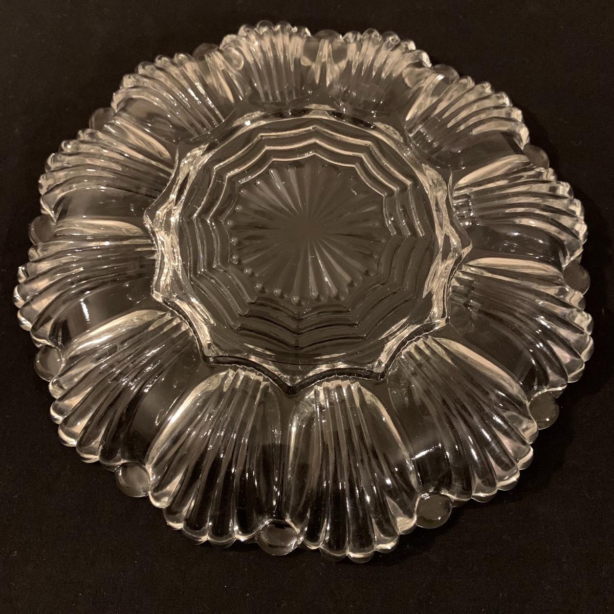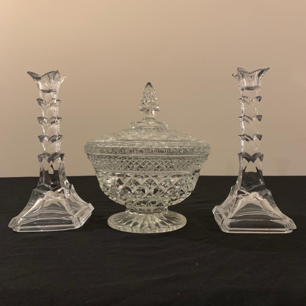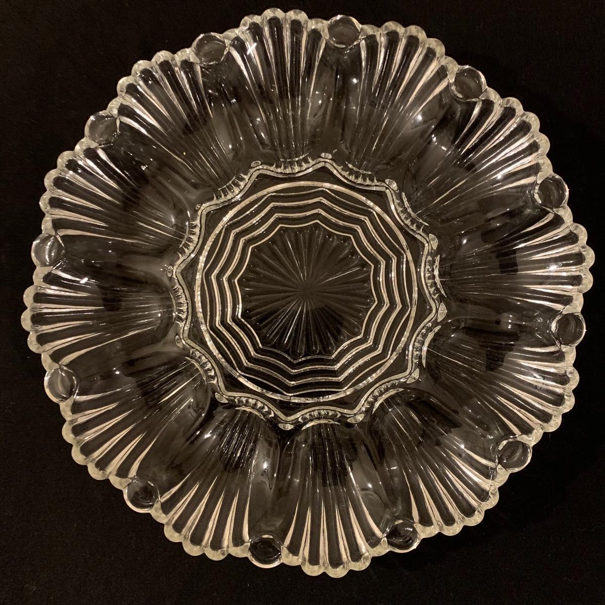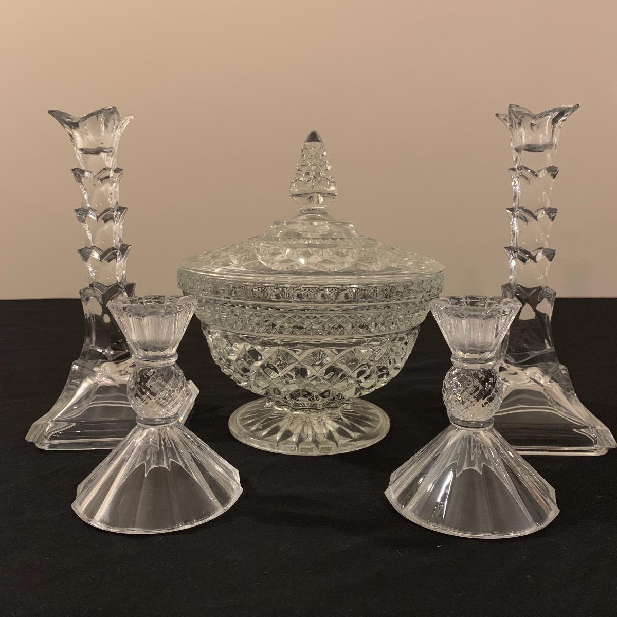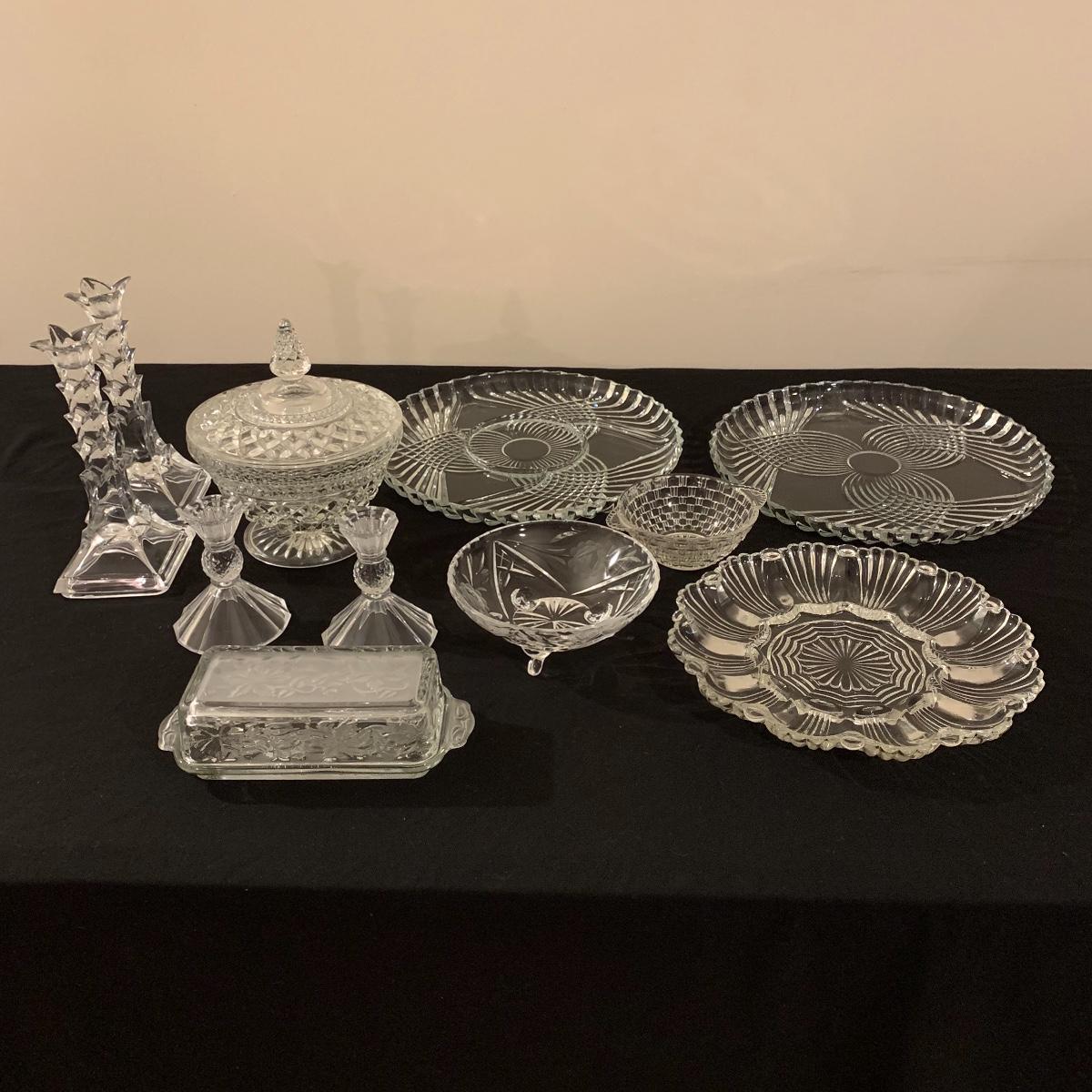 This lot includes 11 ornate glass items, some of which are pressed glass and some are cut glass. There are two pairs of candlestick holders, which have some previous candle residue. There are two smaller bowls, as well as a lidded candy dish and butter dish. There is a deviled egg platter and two larger dishes, one of which have five parts sectioned off. The two platters are the largest items and are 12” in diameter. The smallest bowl is 4.5” in diameter. No chips are apparent and everything appears to be in very good condition. Shipping Available