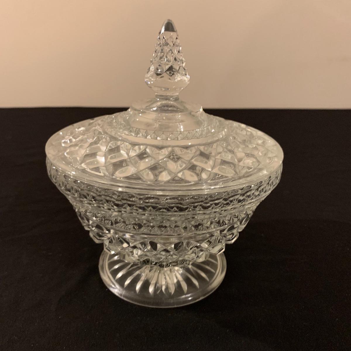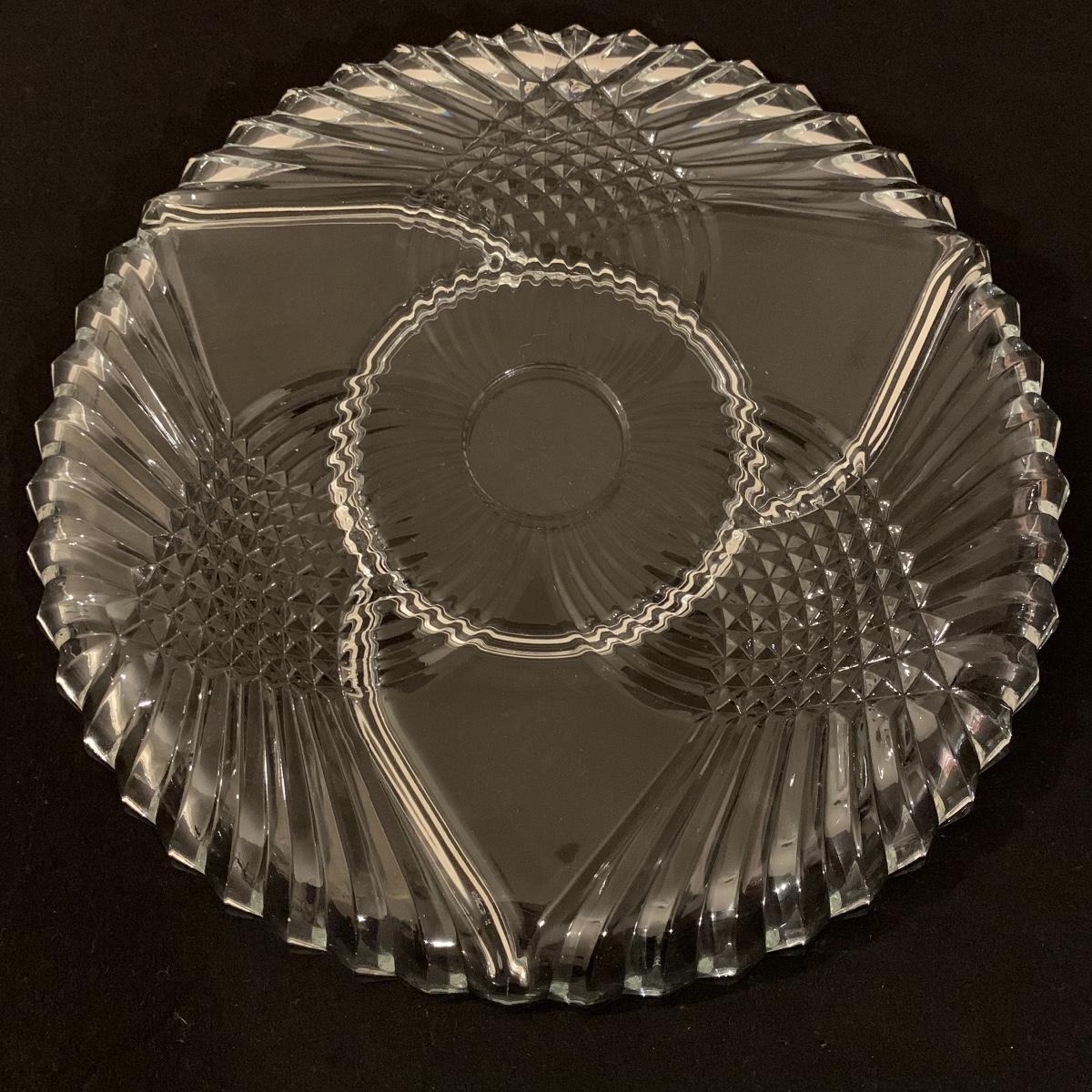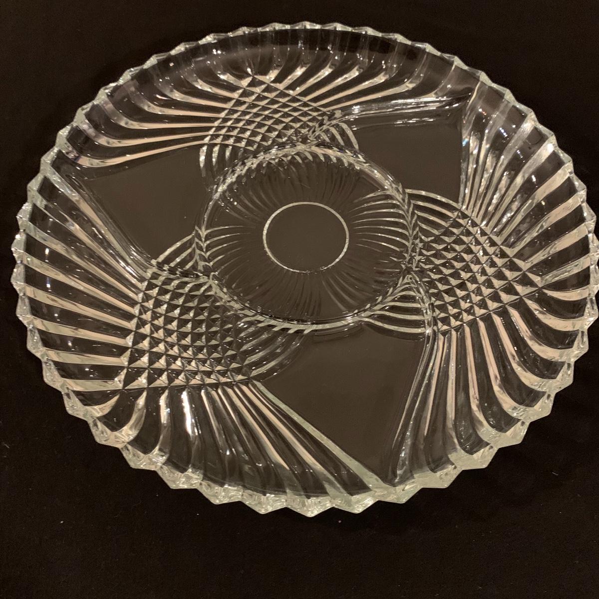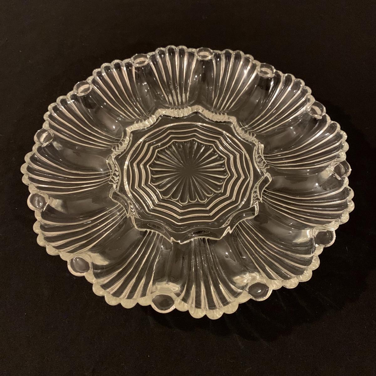 This lot includes 11 ornate glass items, some of which are pressed glass and some are cut glass. There are two pairs of candlestick holders, which have some previous candle residue. There are two smaller bowls, as well as a lidded candy dish and butter dish. There is a deviled egg platter and two larger dishes, one of which have five parts sectioned off. The two platters are the largest items and are 12” in diameter. The smallest bowl is 4.5” in diameter. No chips are apparent and everything appears to be in very good condition. Shipping Available