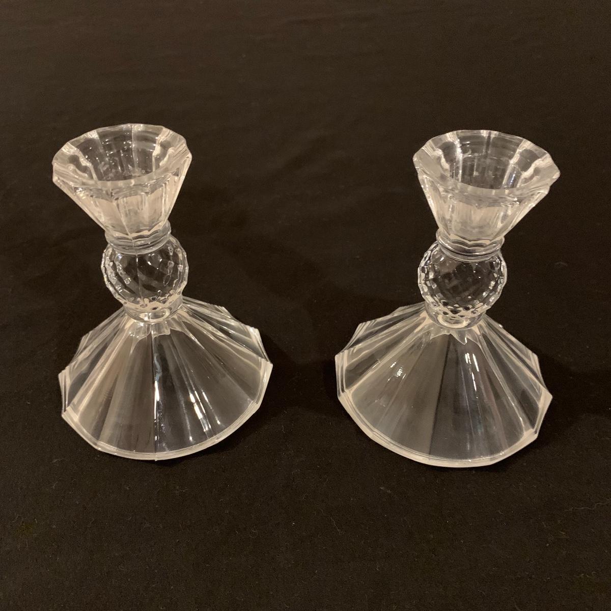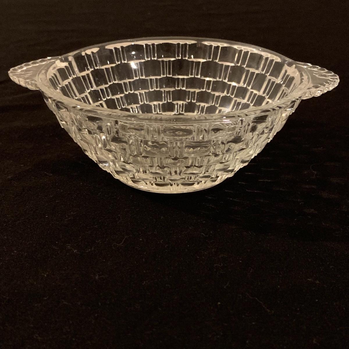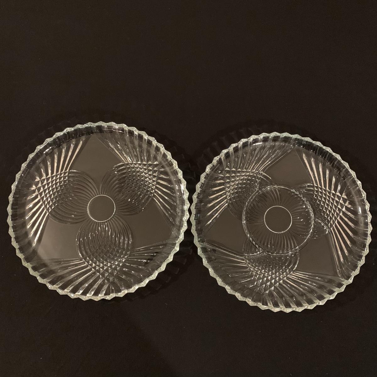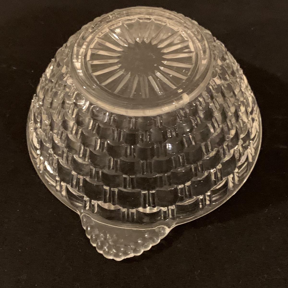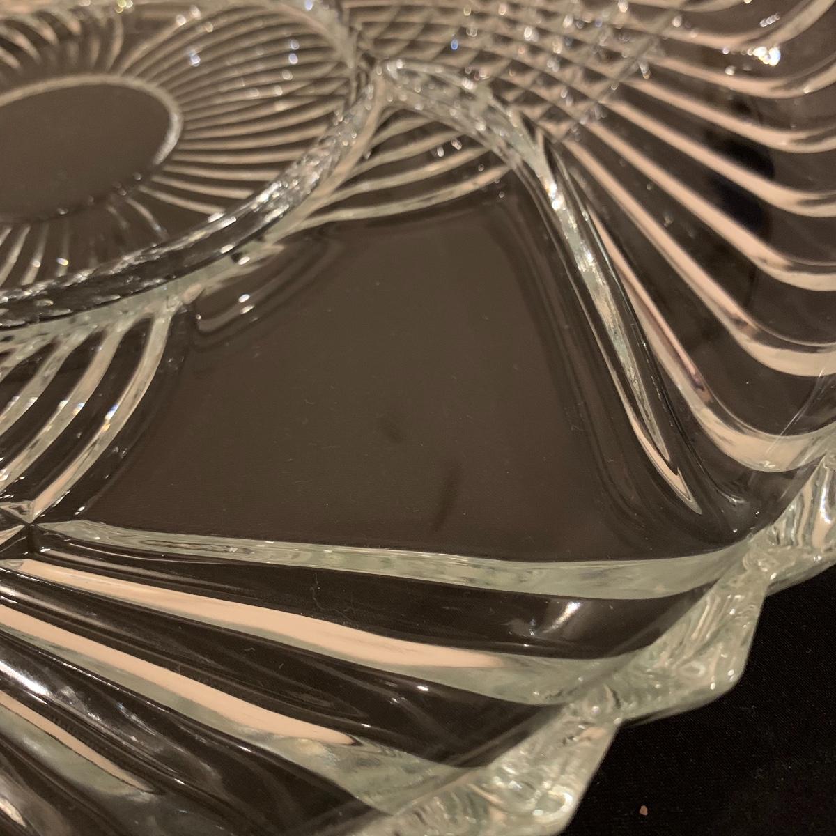 This lot includes 11 ornate glass items, some of which are pressed glass and some are cut glass. There are two pairs of candlestick holders, which have some previous candle residue. There are two smaller bowls, as well as a lidded candy dish and butter dish. There is a deviled egg platter and two larger dishes, one of which have five parts sectioned off. The two platters are the largest items and are 12” in diameter. The smallest bowl is 4.5” in diameter. No chips are apparent and everything appears to be in very good condition. Shipping Available