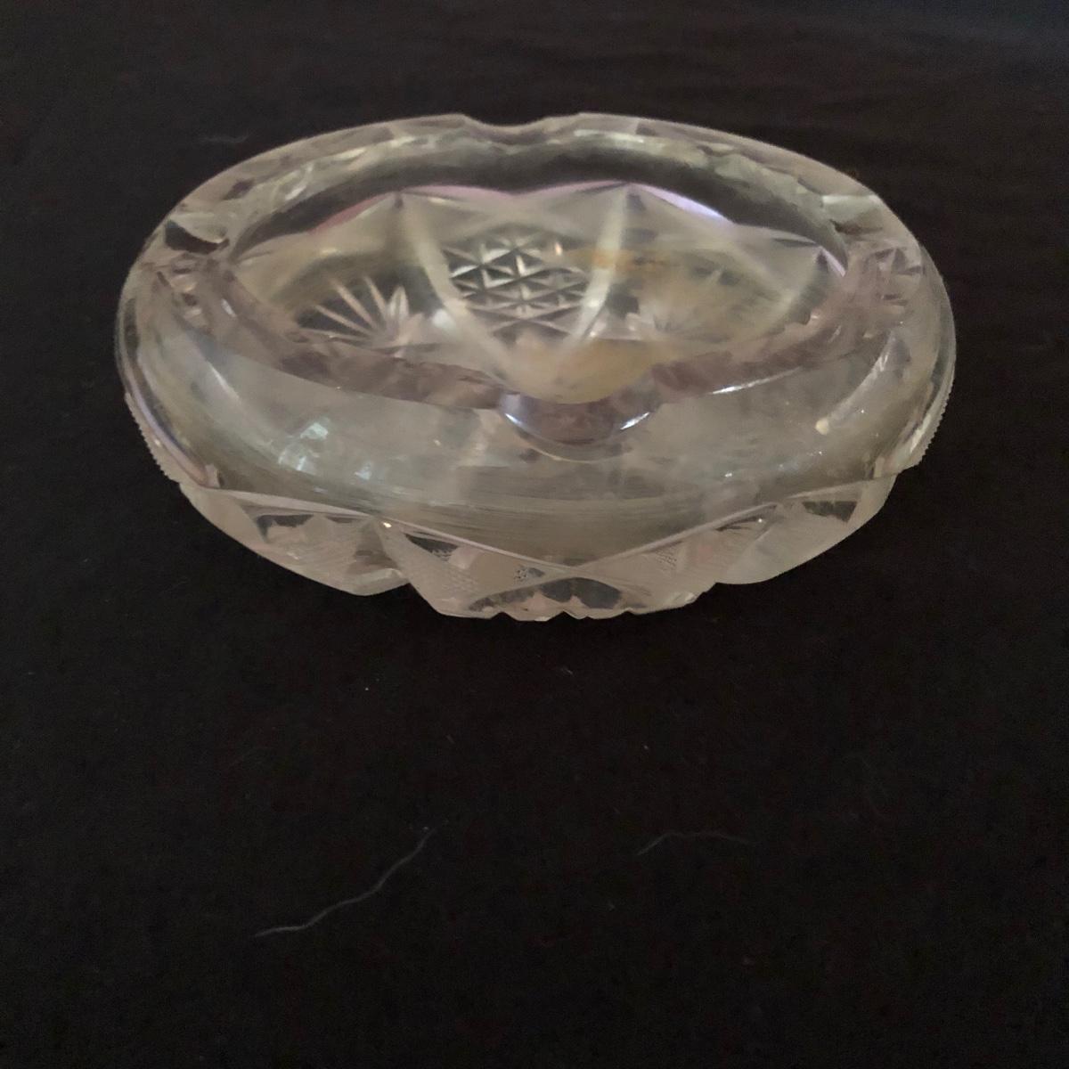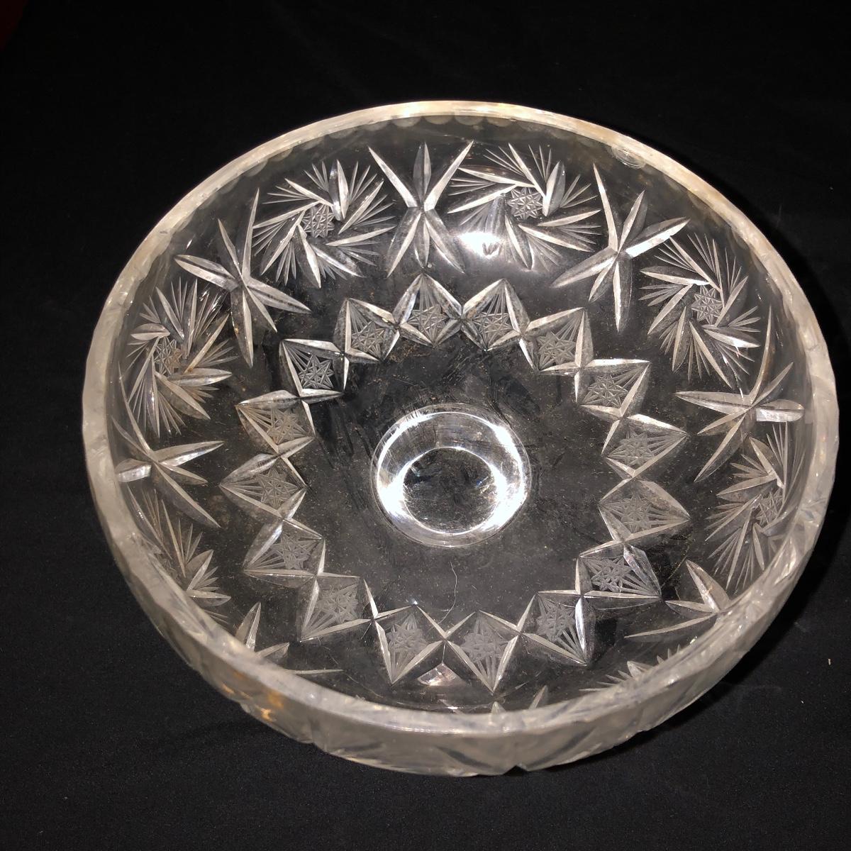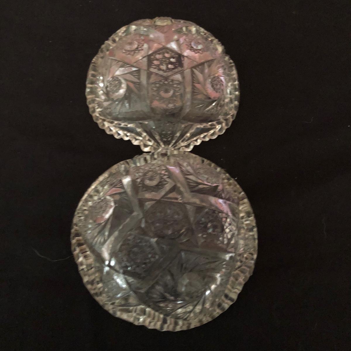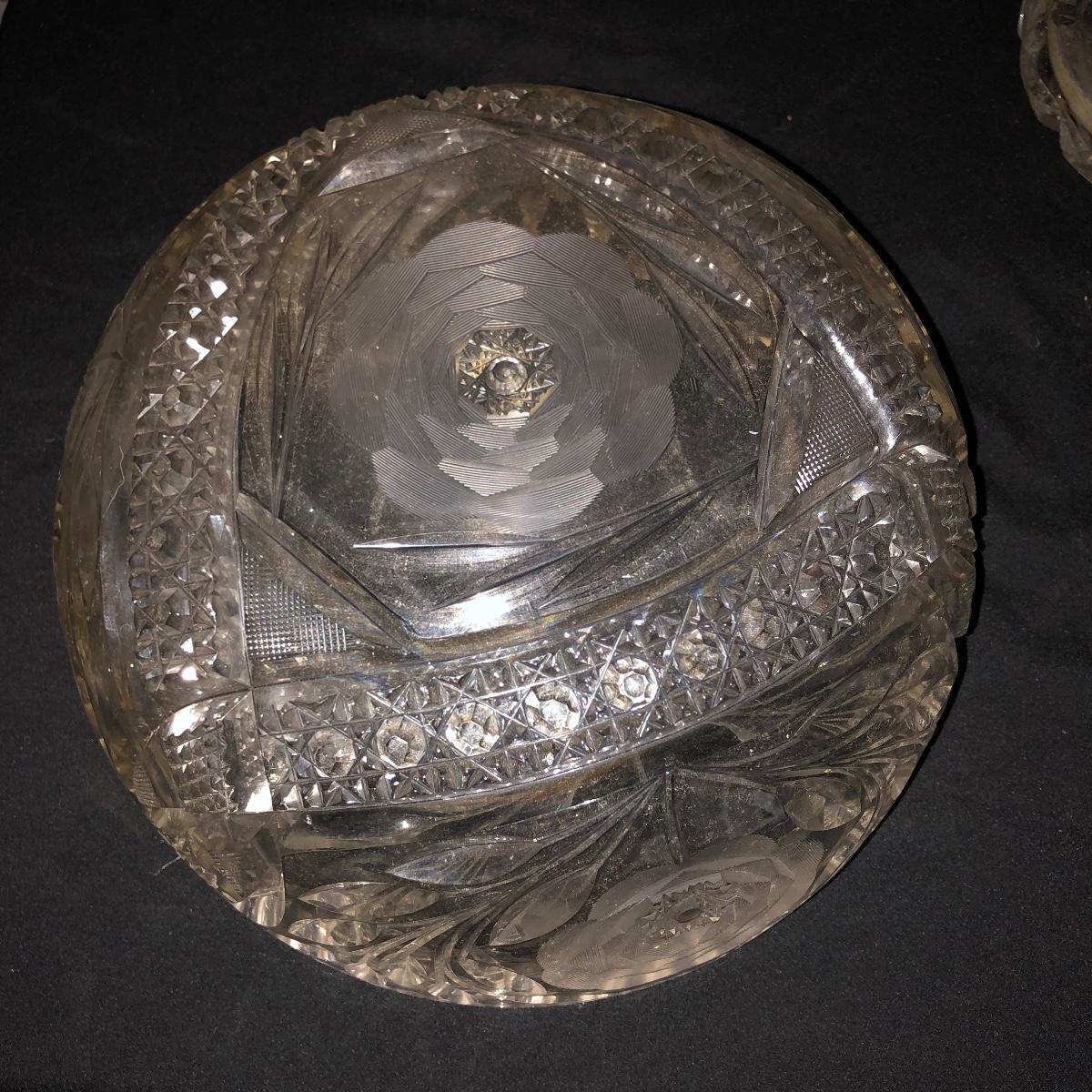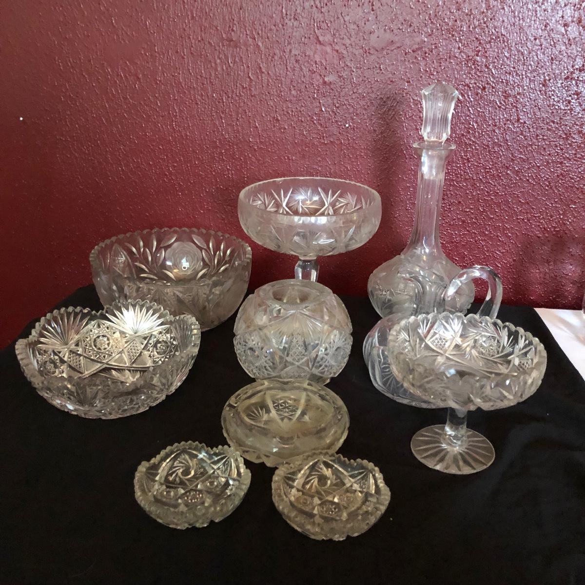 Lot includes two bowls, decanter, two footed dishes, pitcher, two small dishes, ashtray and a ball shaped dish. Smallest footed dish has chip on base, see pictures. Largest bowl measures 9”D x 4.5”. All appear to be cut glass with some weight to most pieces.