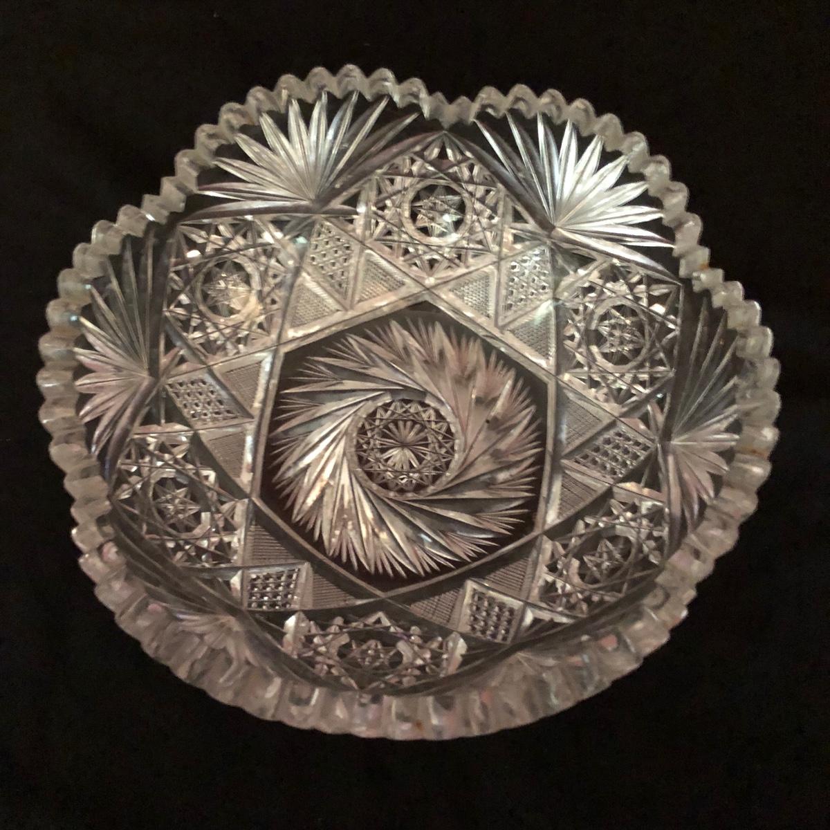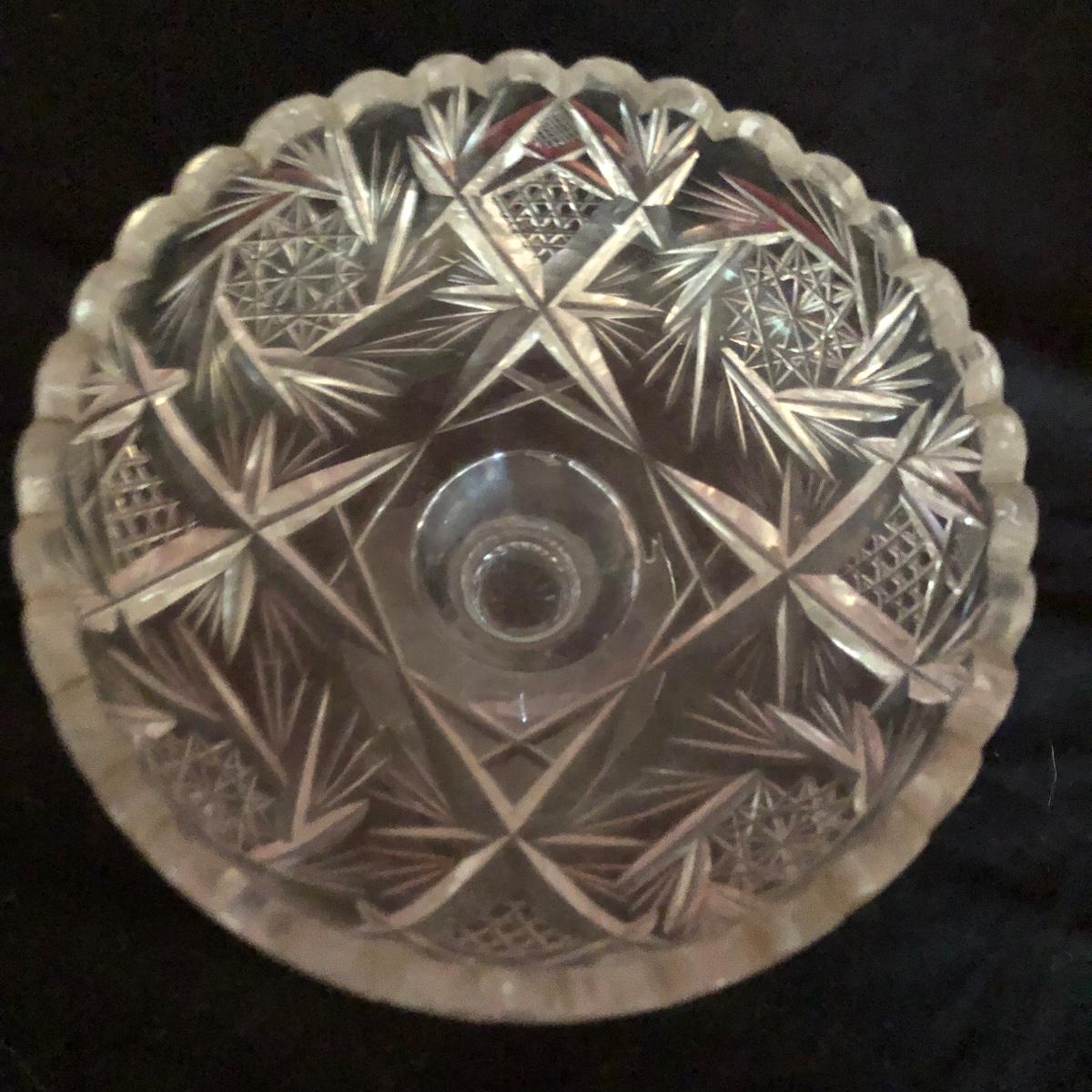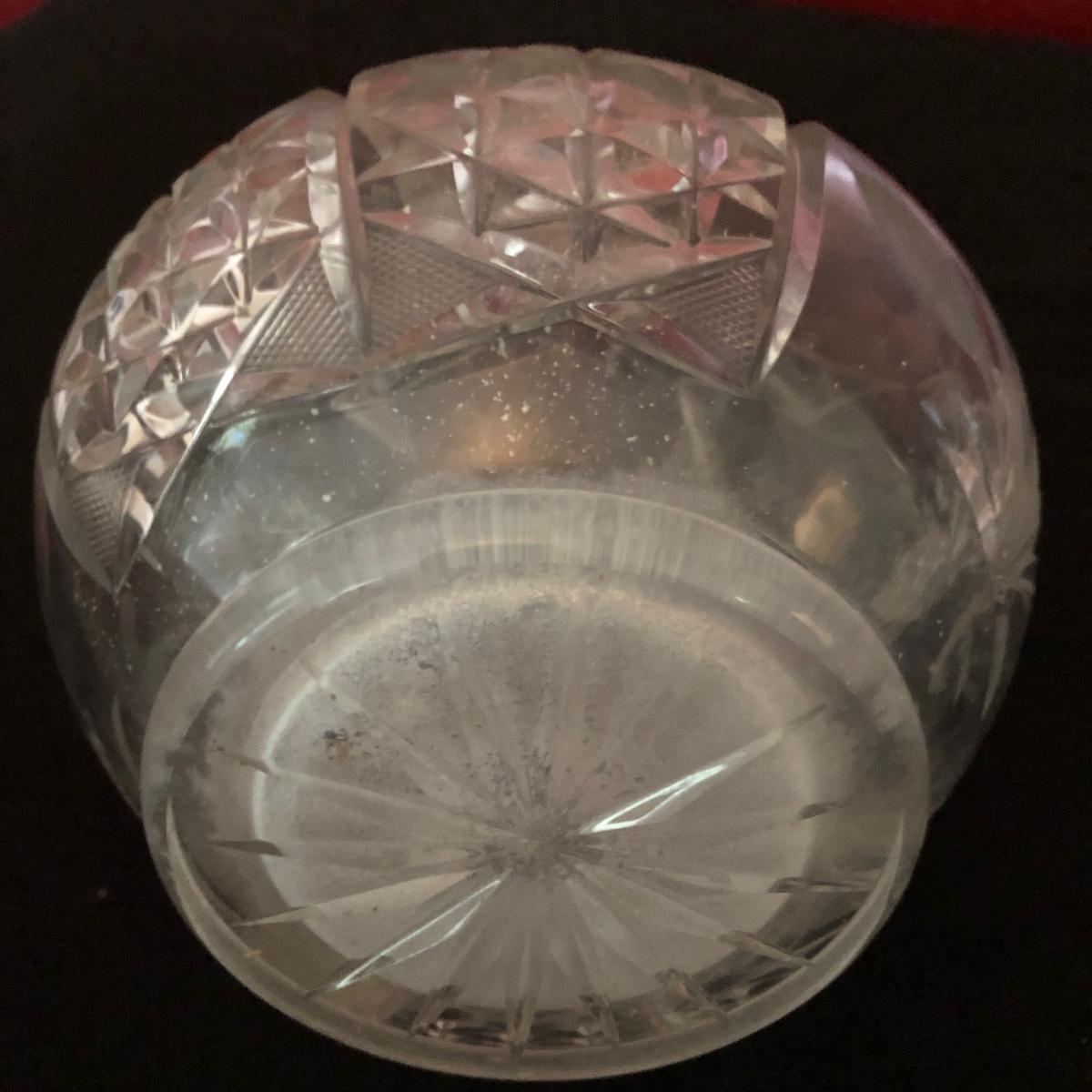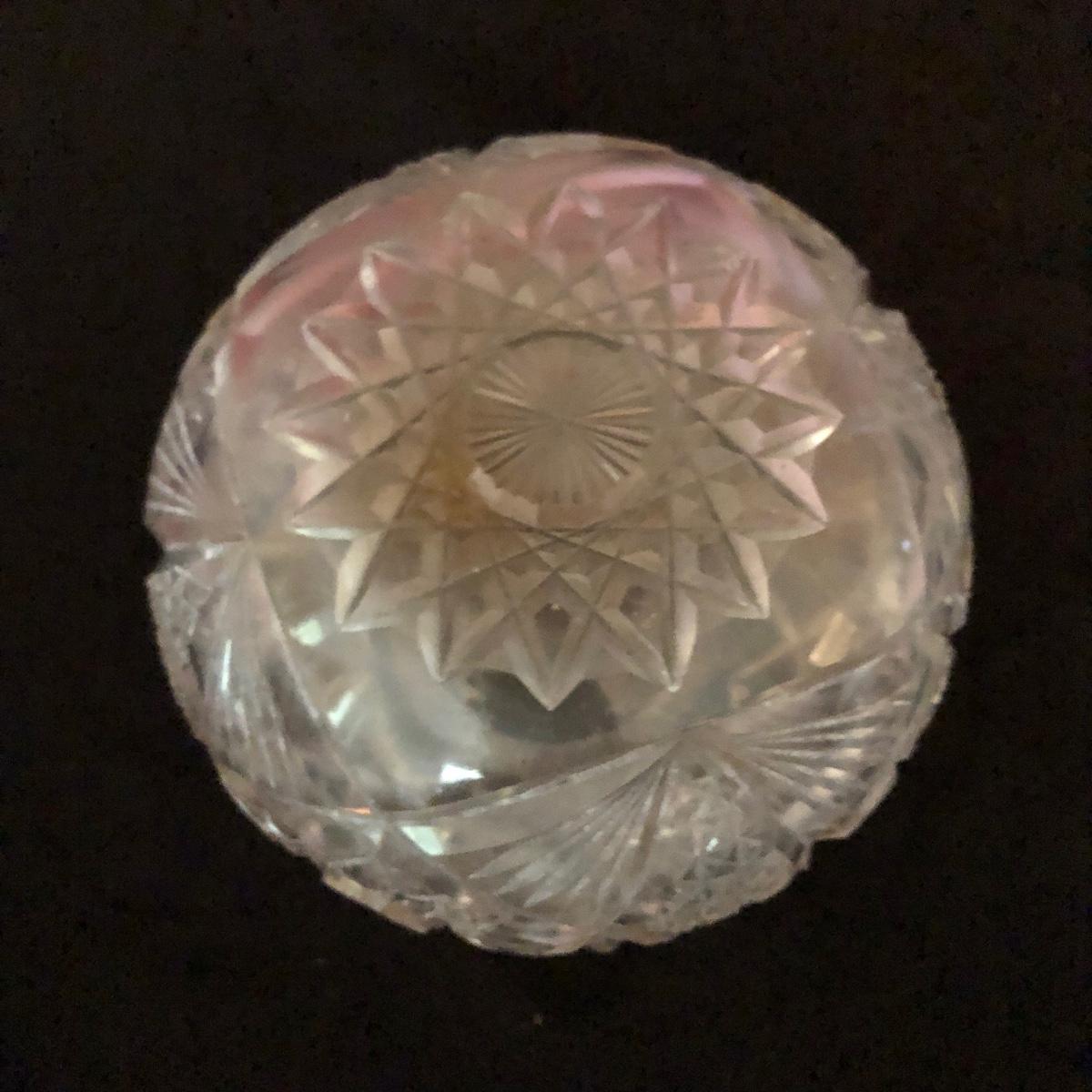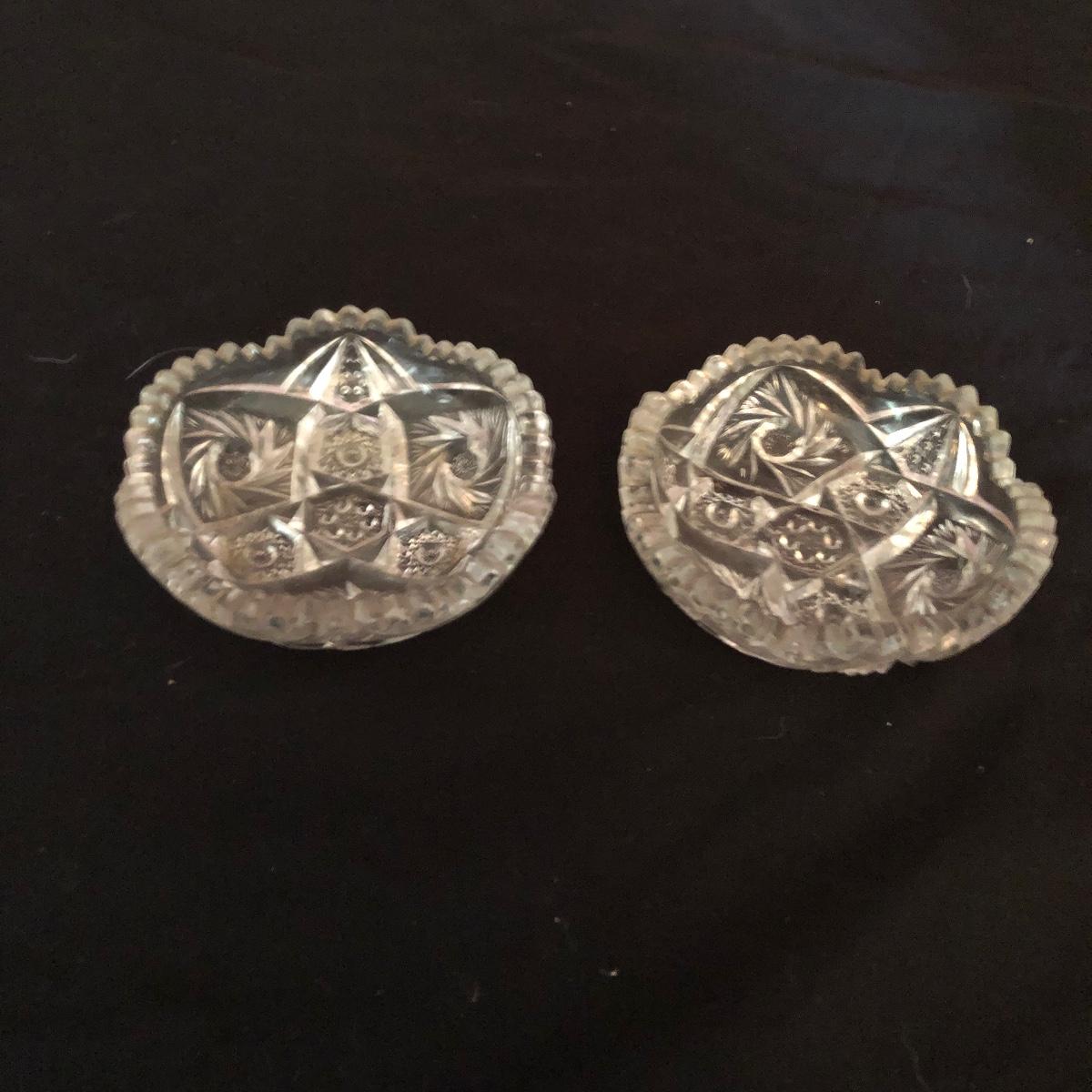 Lot includes two bowls, decanter, two footed dishes, pitcher, two small dishes, ashtray and a ball shaped dish. Smallest footed dish has chip on base, see pictures. Largest bowl measures 9”D x 4.5”. All appear to be cut glass with some weight to most pieces.