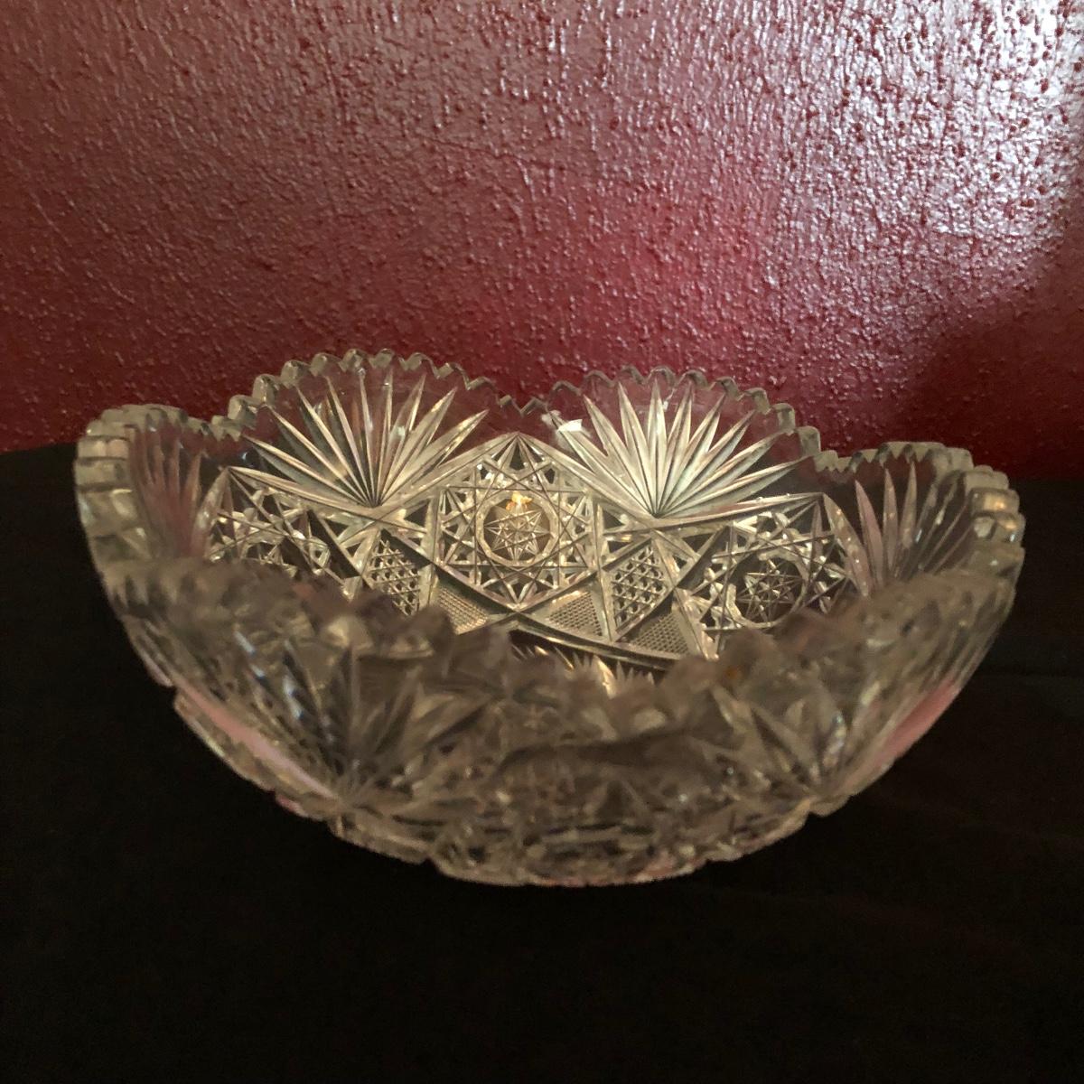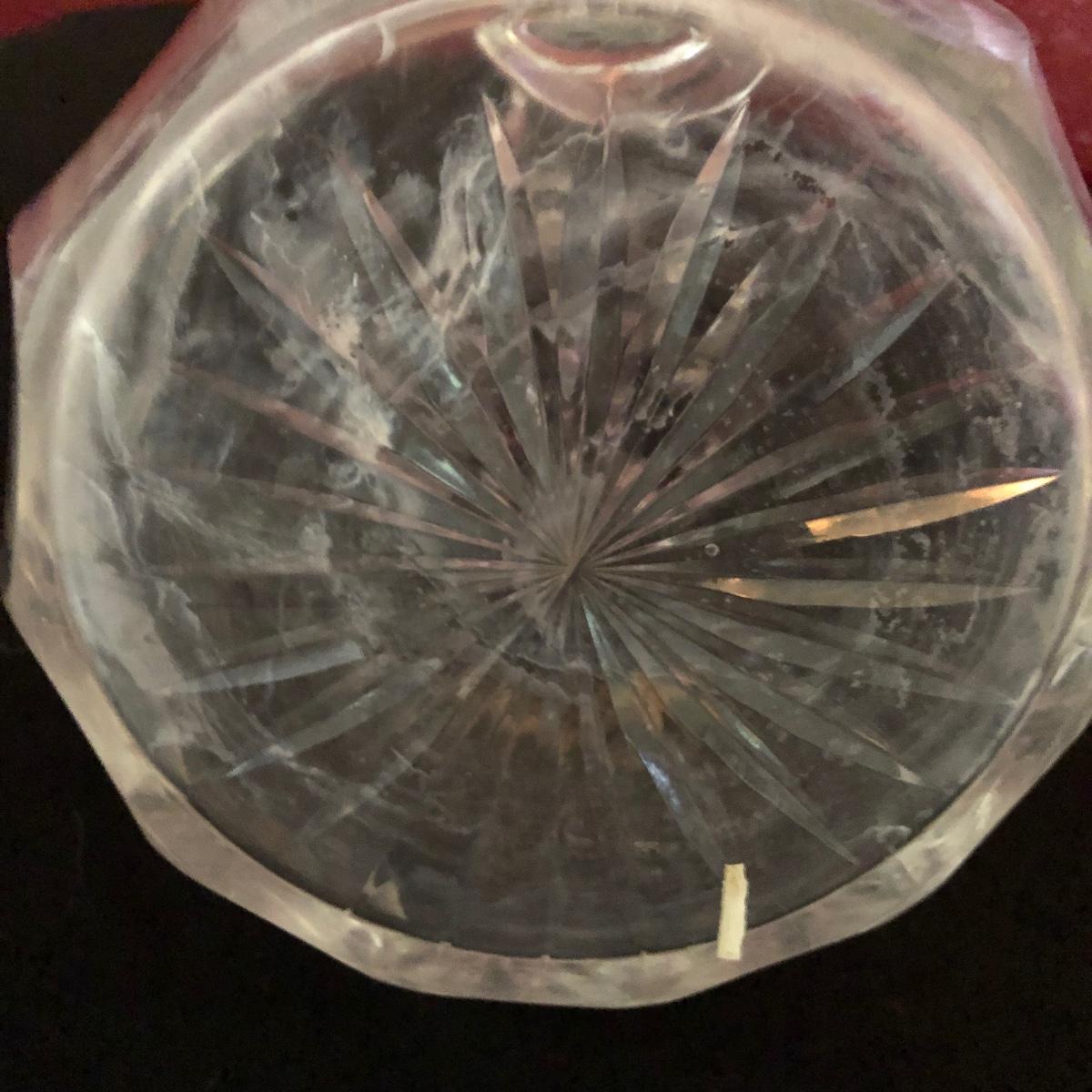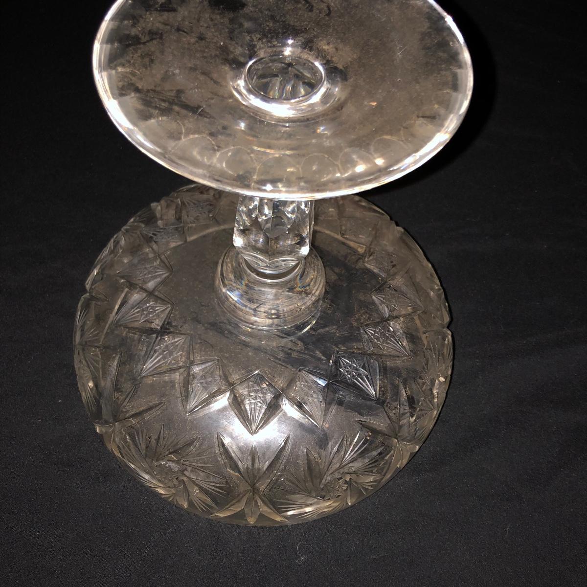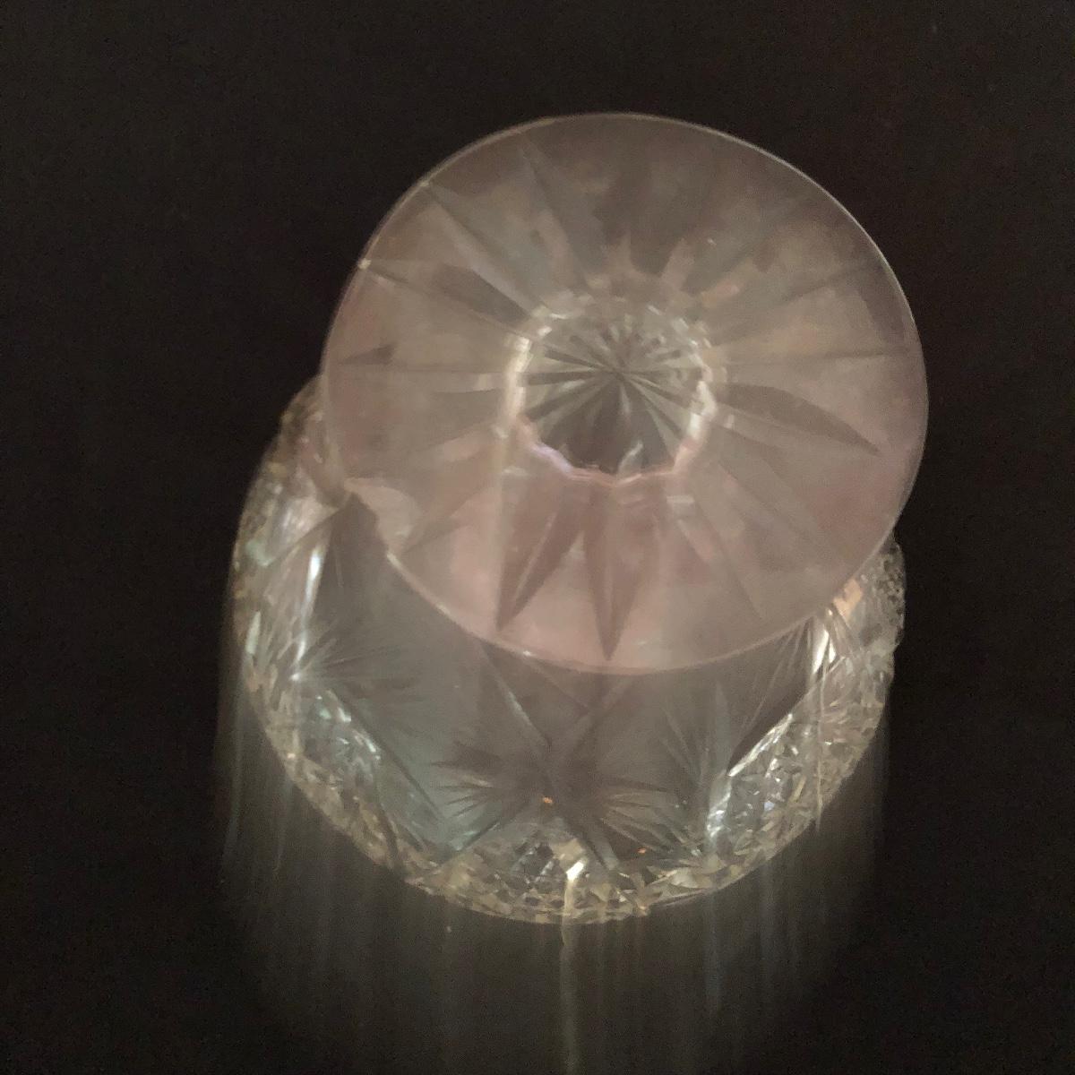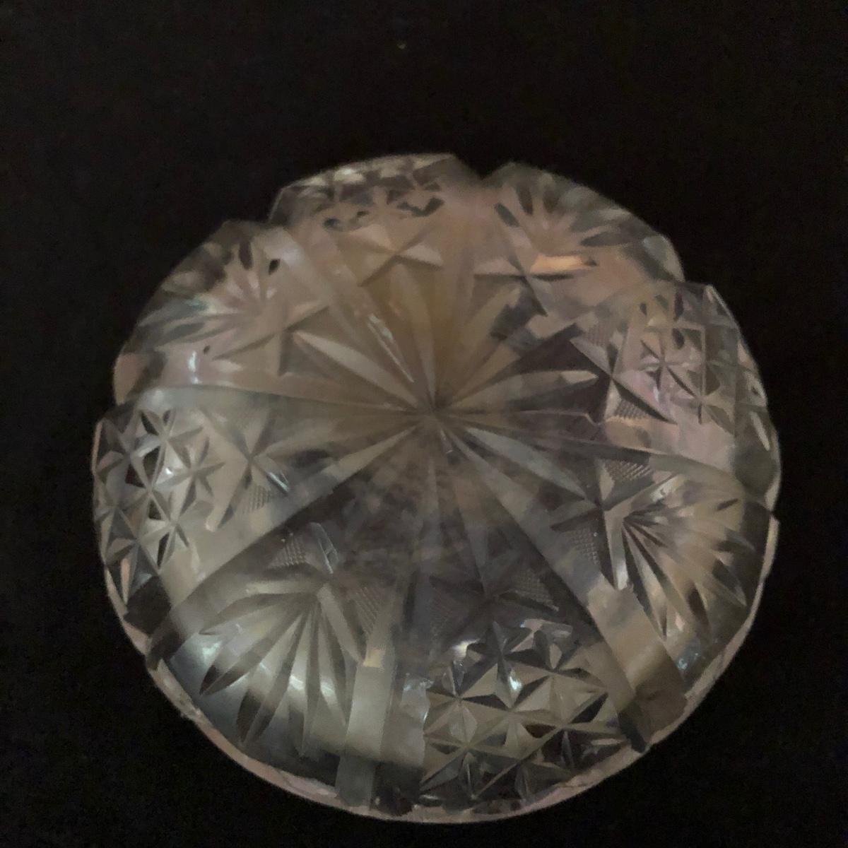 Lot includes two bowls, decanter, two footed dishes, pitcher, two small dishes, ashtray and a ball shaped dish. Smallest footed dish has chip on base, see pictures. Largest bowl measures 9”D x 4.5”. All appear to be cut glass with some weight to most pieces.