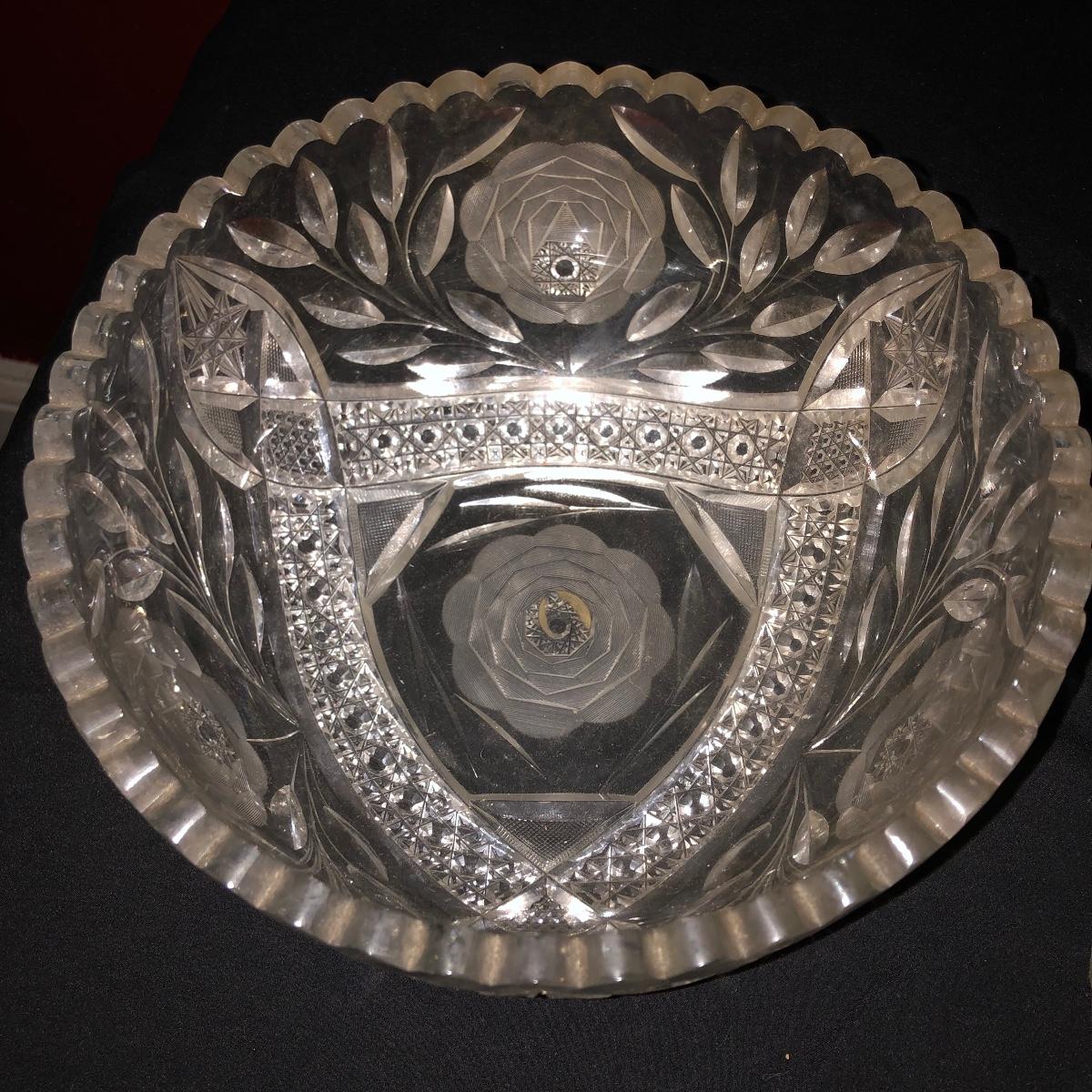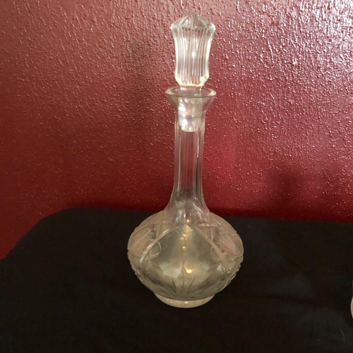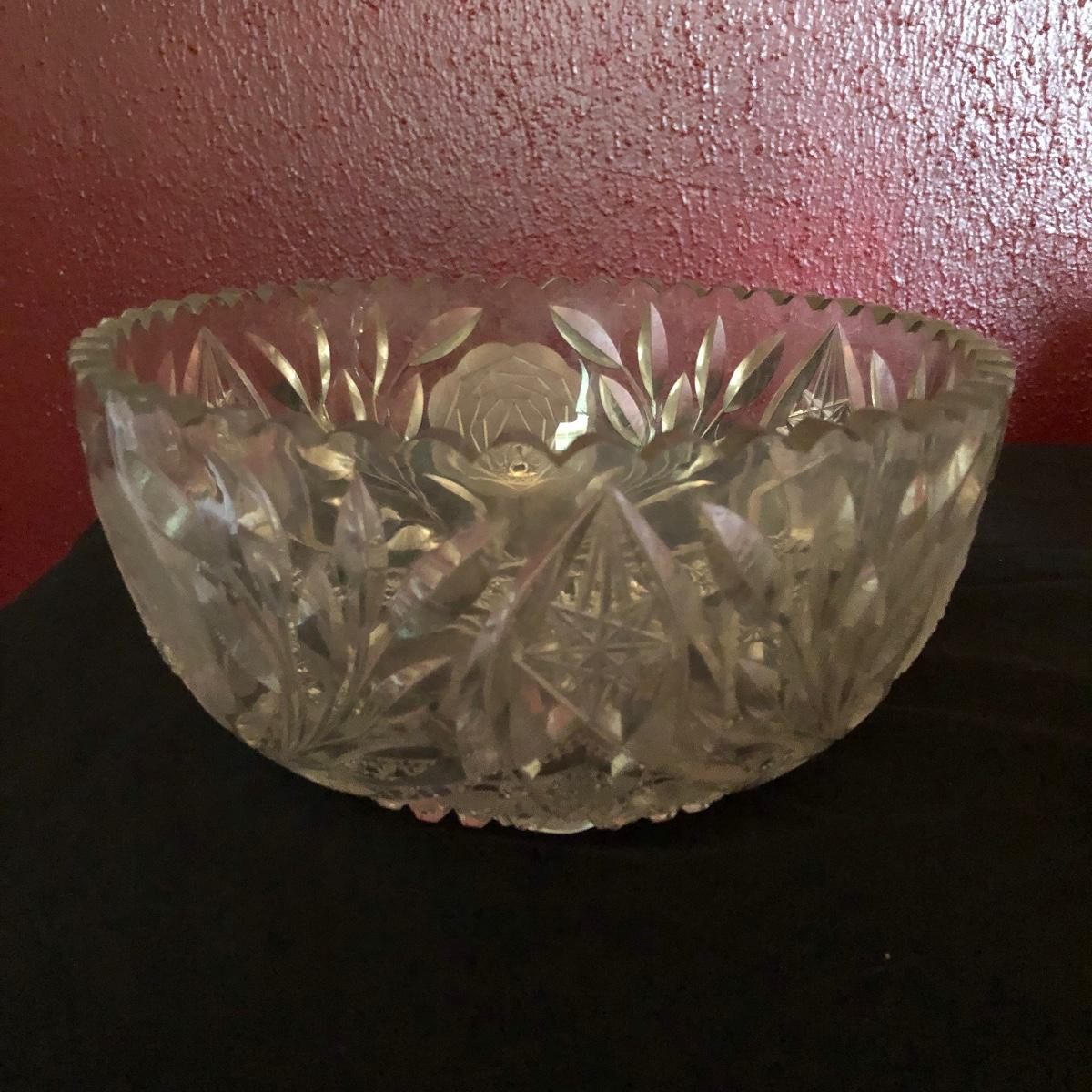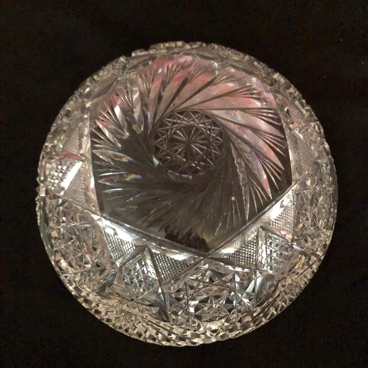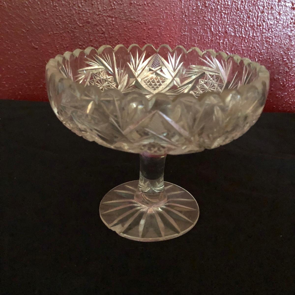 Lot includes two bowls, decanter, two footed dishes, pitcher, two small dishes, ashtray and a ball shaped dish. Smallest footed dish has chip on base, see pictures. Largest bowl measures 9”D x 4.5”. All appear to be cut glass with some weight to most pieces.