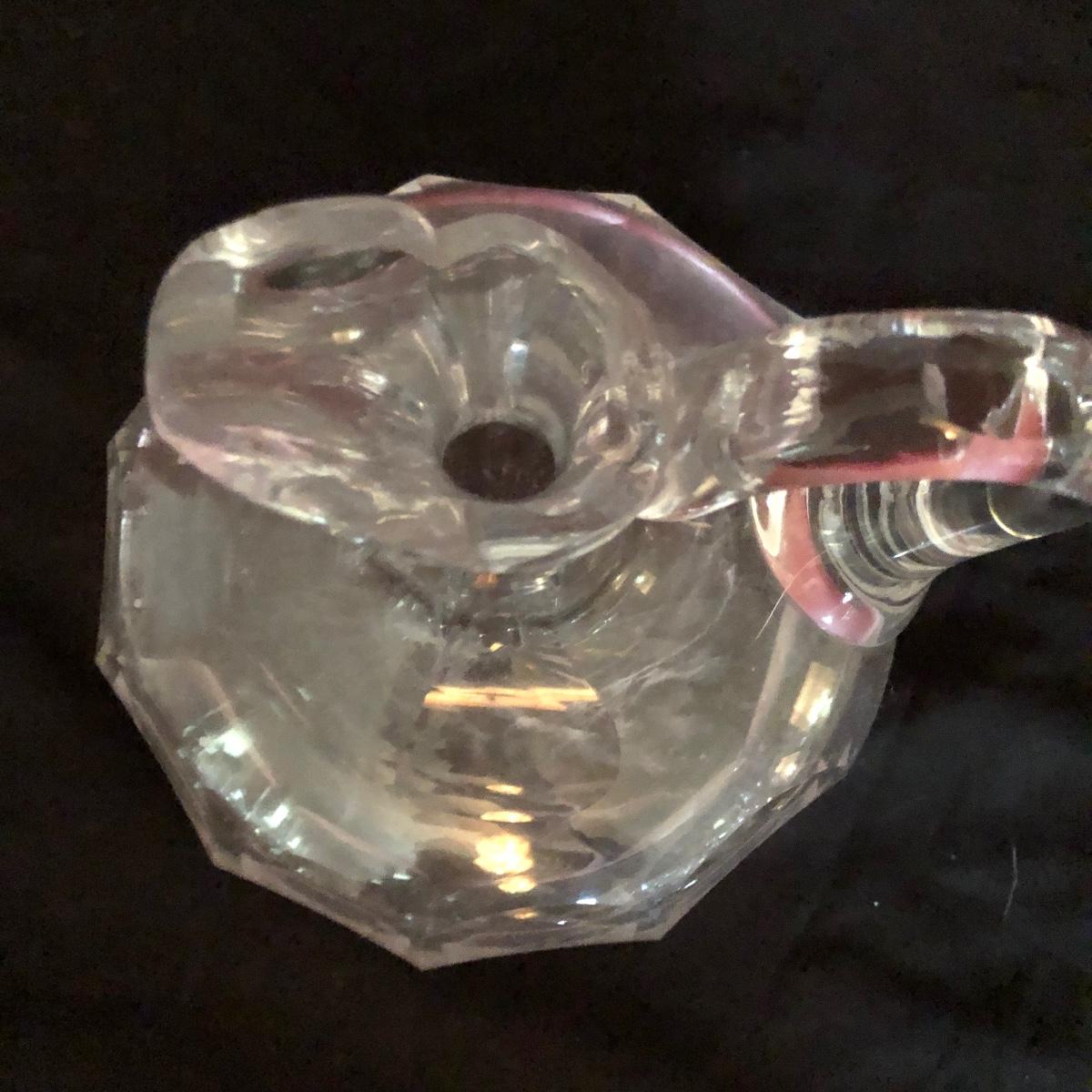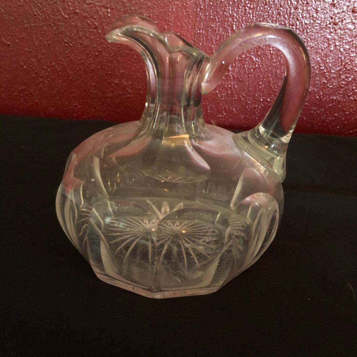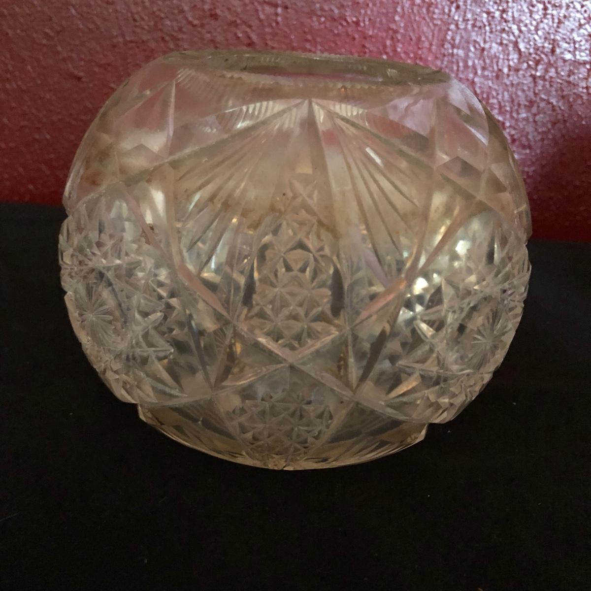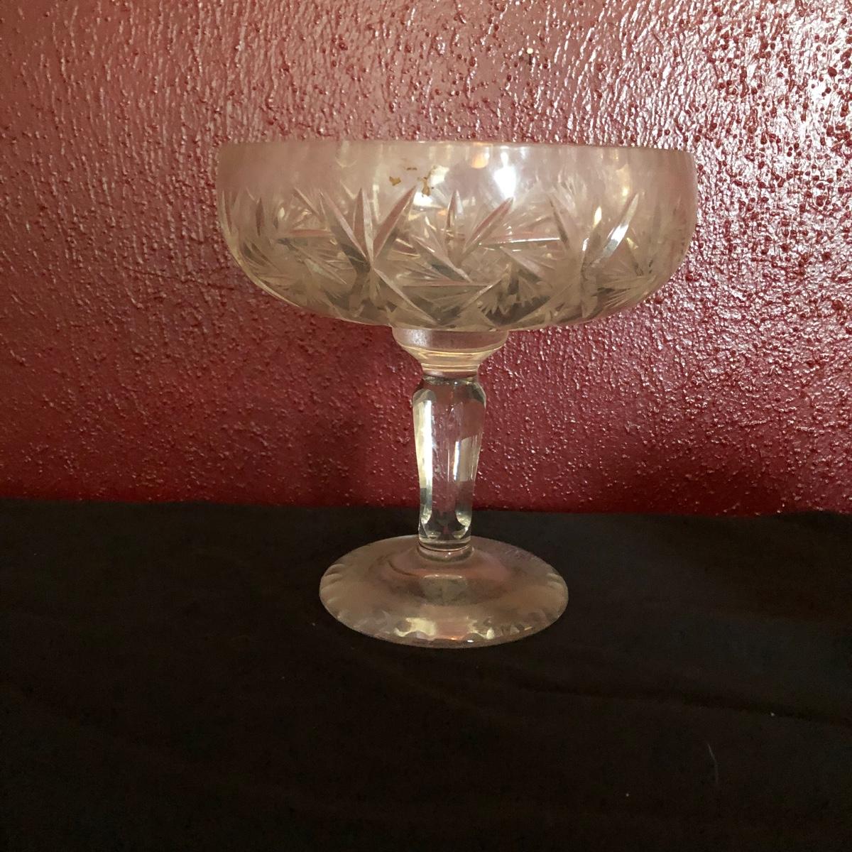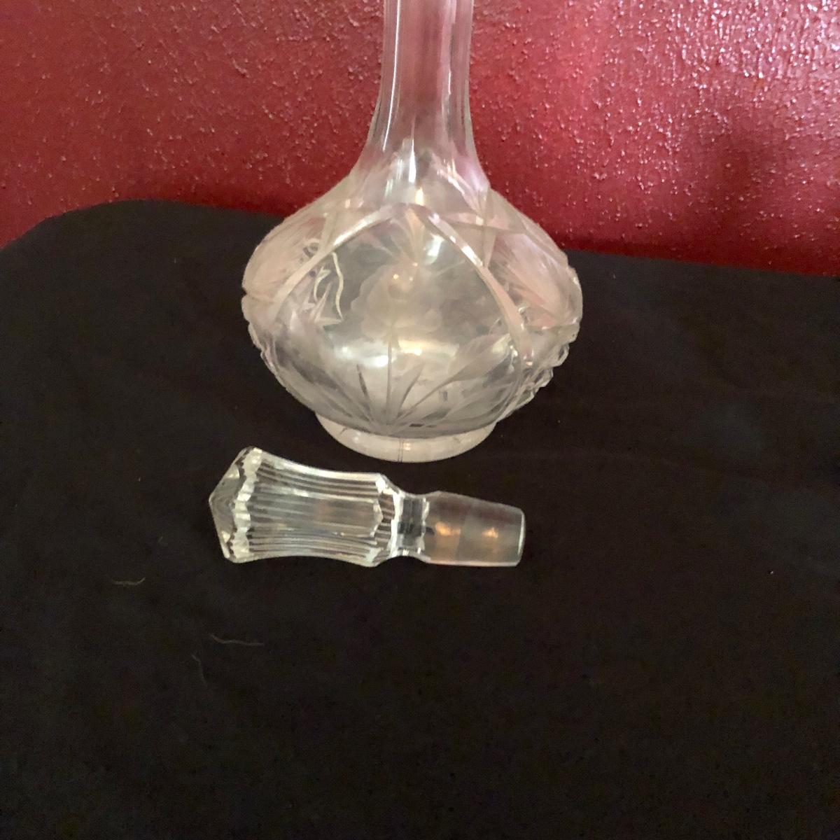 Lot includes two bowls, decanter, two footed dishes, pitcher, two small dishes, ashtray and a ball shaped dish. Smallest footed dish has chip on base, see pictures. Largest bowl measures 9”D x 4.5”. All appear to be cut glass with some weight to most pieces.