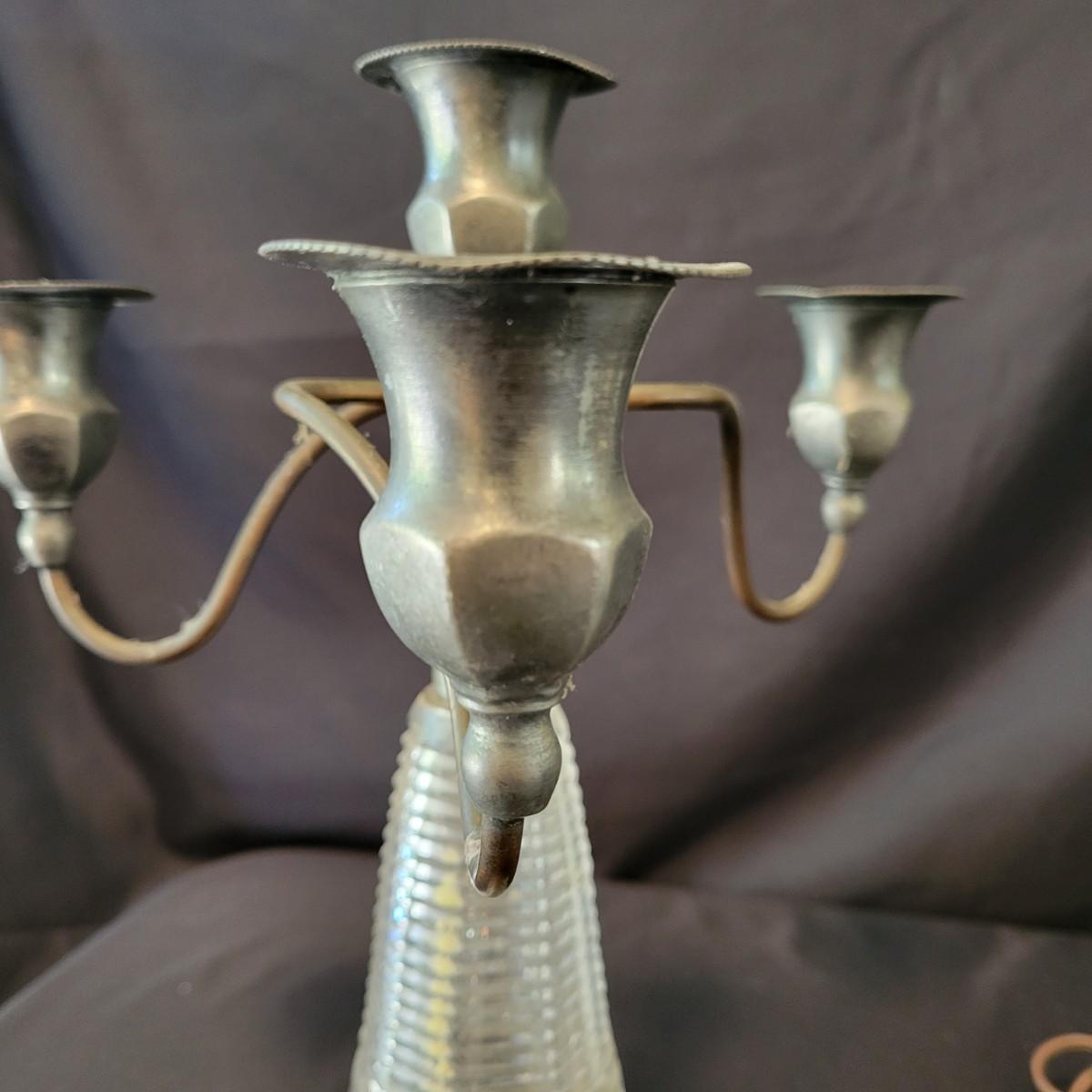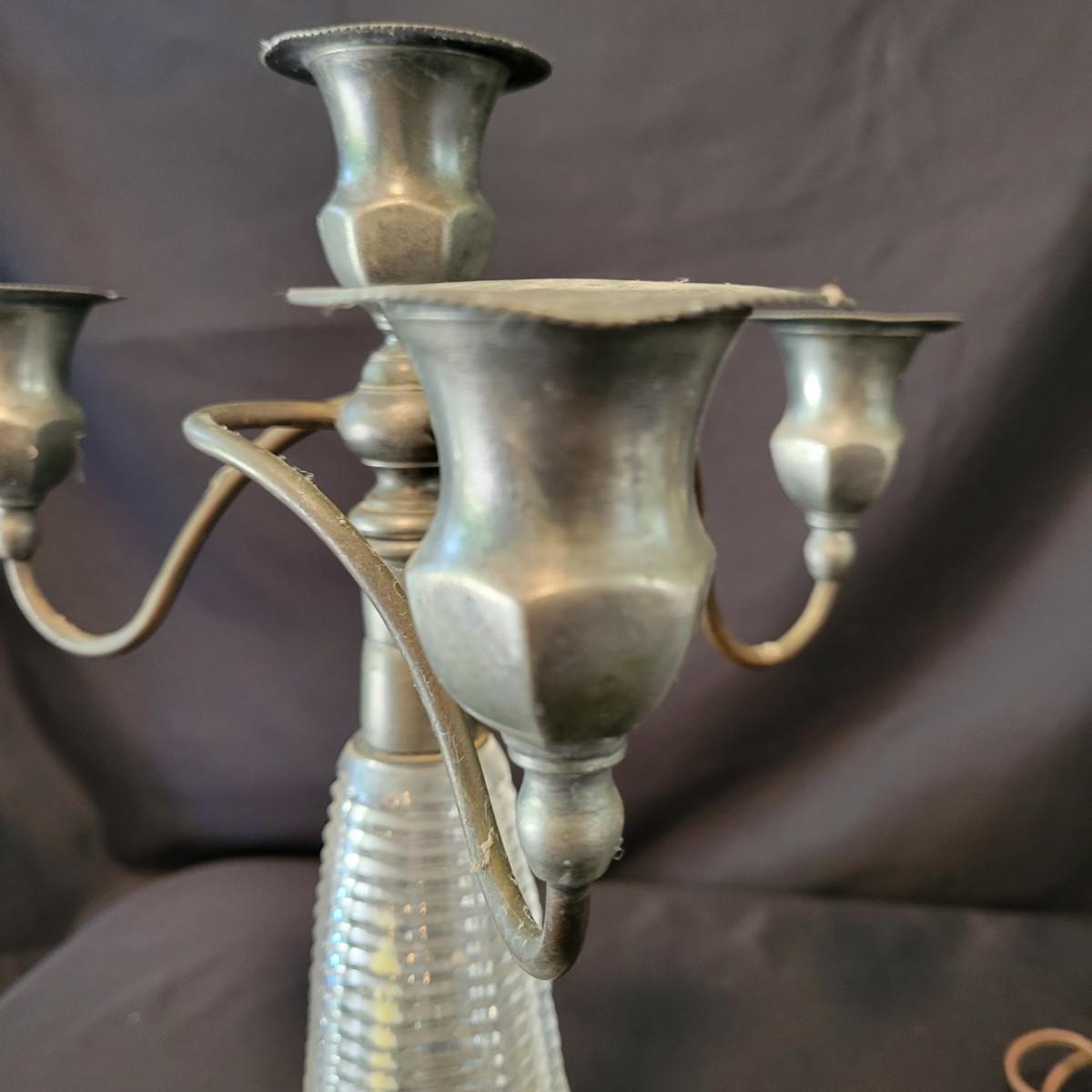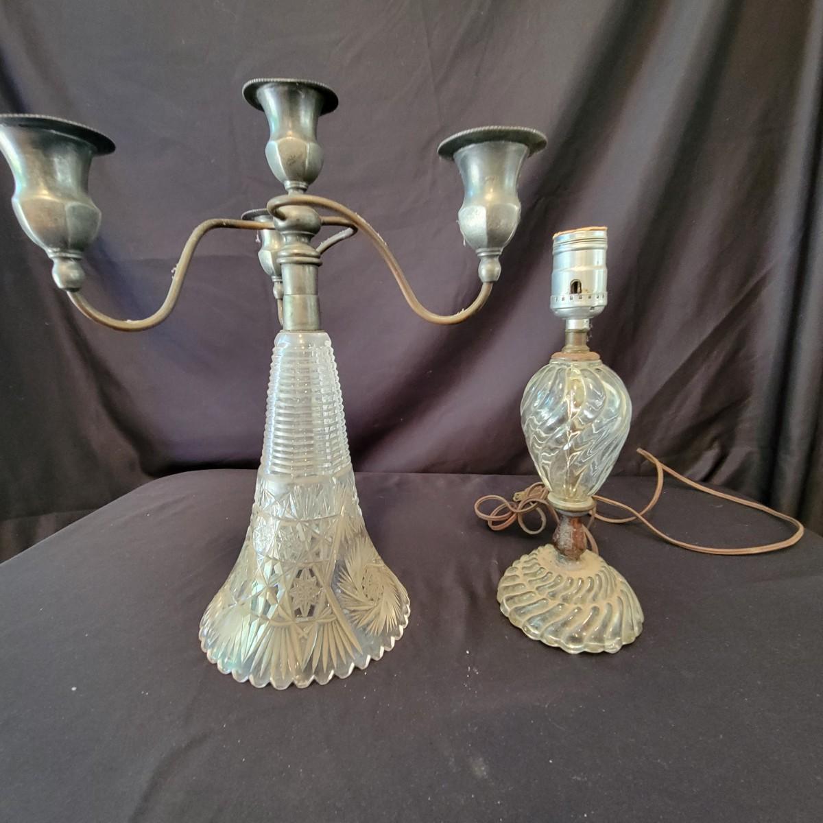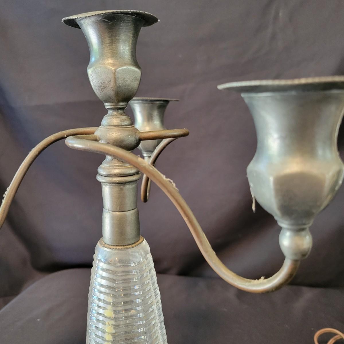 Vintage cut glass candle holder with what appears to be pewter candle holders and metal tubing. The candle holders do have some slight warps to them, but the glass has no chips or cracks. Included is a molded glass lamp base with no notable damage. Lamp did not work when tested. Candle holder measures approximately 11" x 14" Shipping available