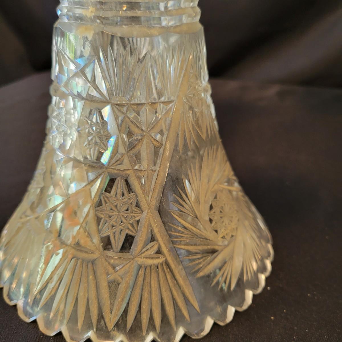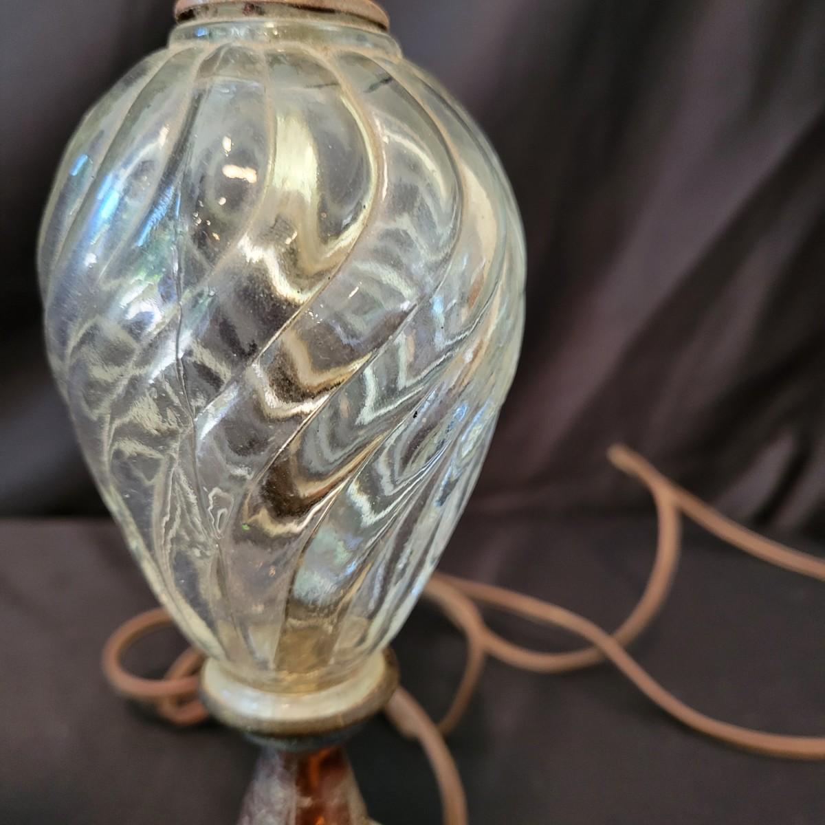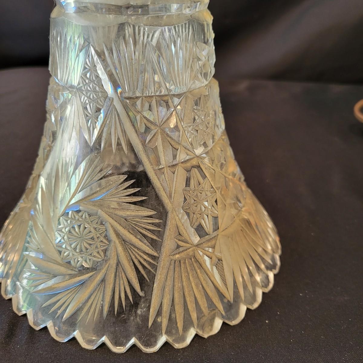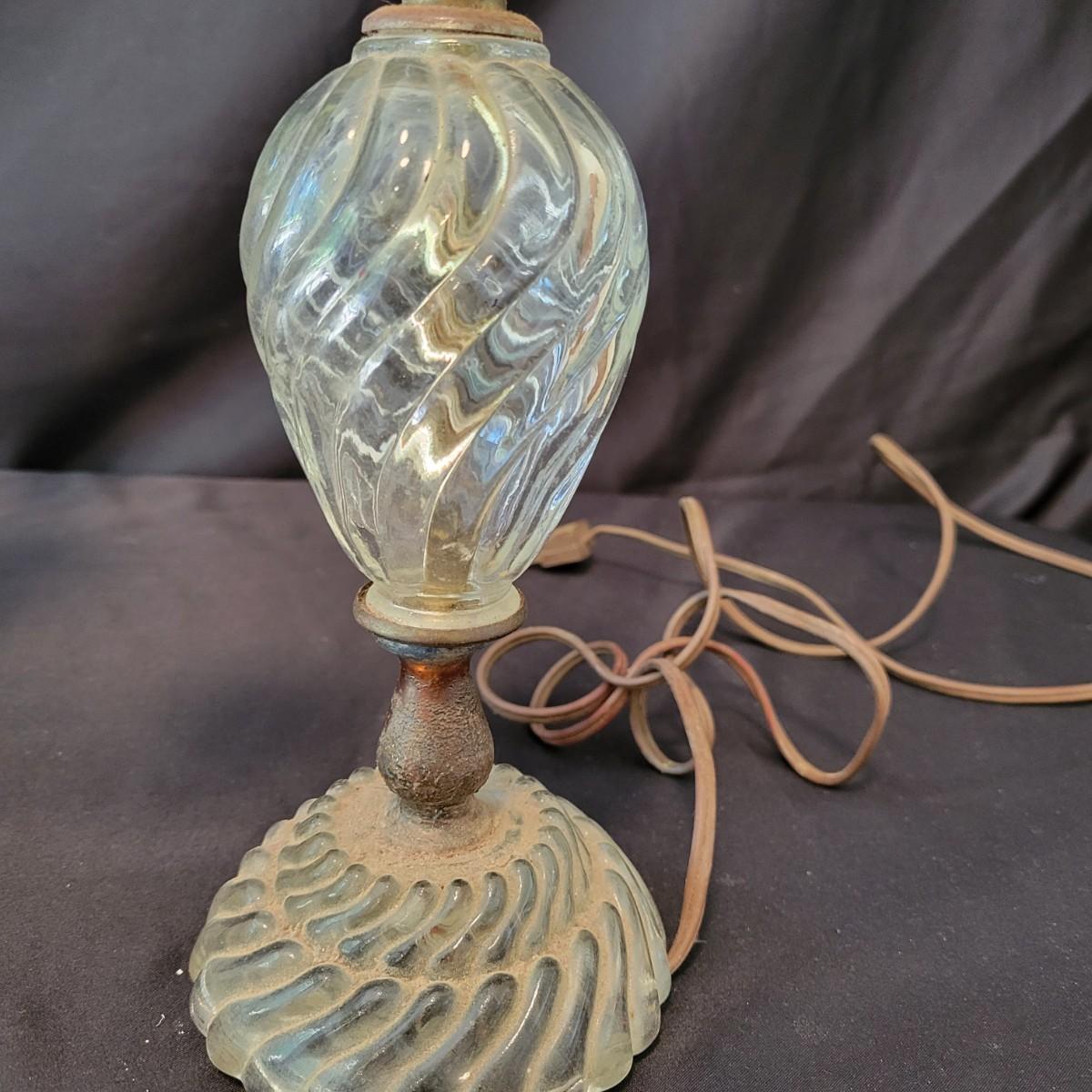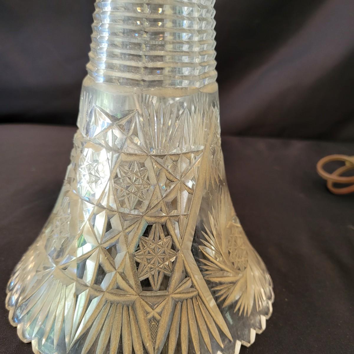 Vintage cut glass candle holder with what appears to be pewter candle holders and metal tubing. The candle holders do have some slight warps to them, but the glass has no chips or cracks. Included is a molded glass lamp base with no notable damage. Lamp did not work when tested. Candle holder measures approximately 11" x 14" Shipping available