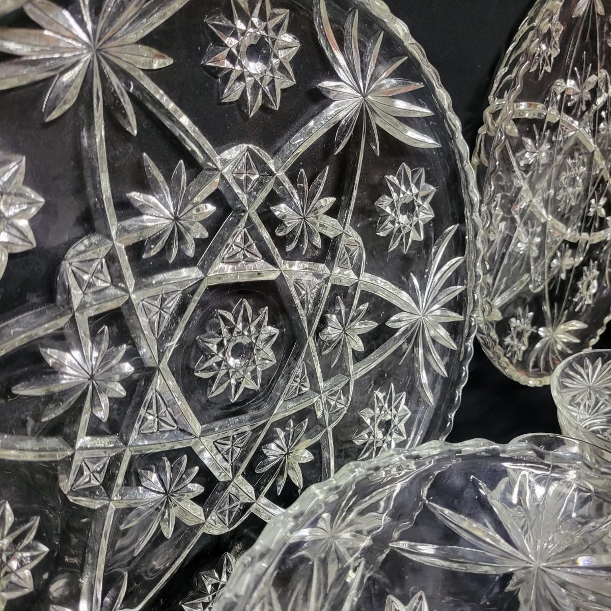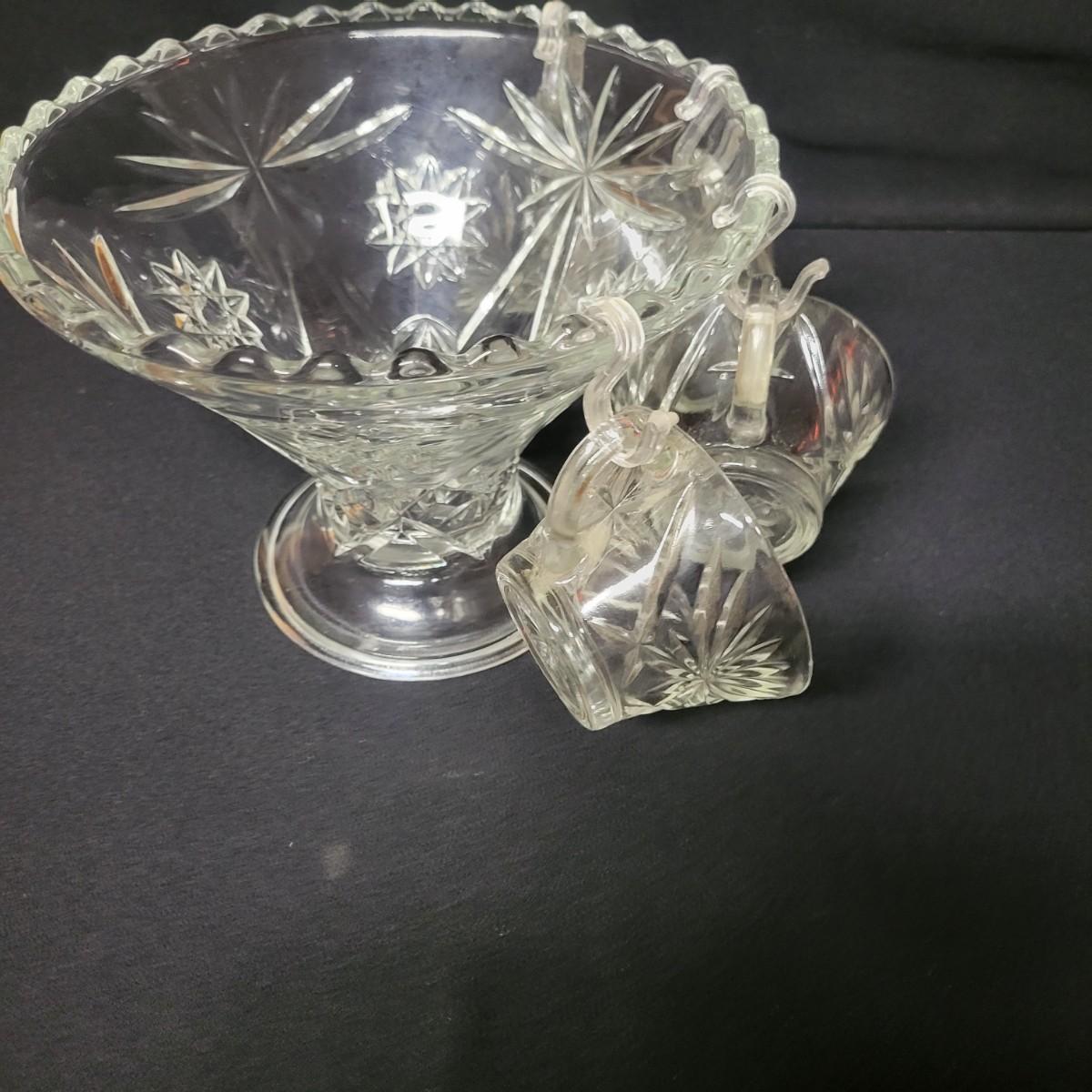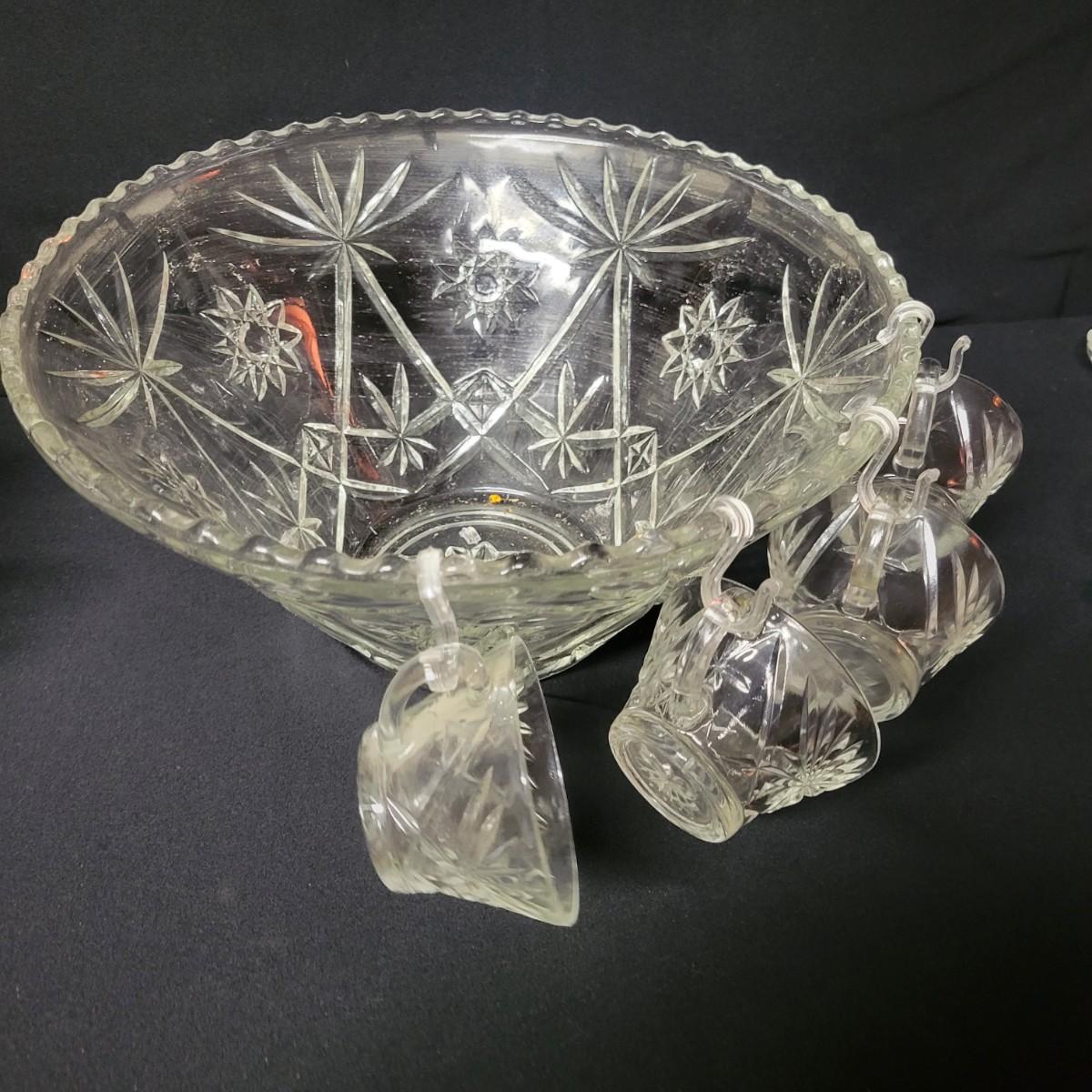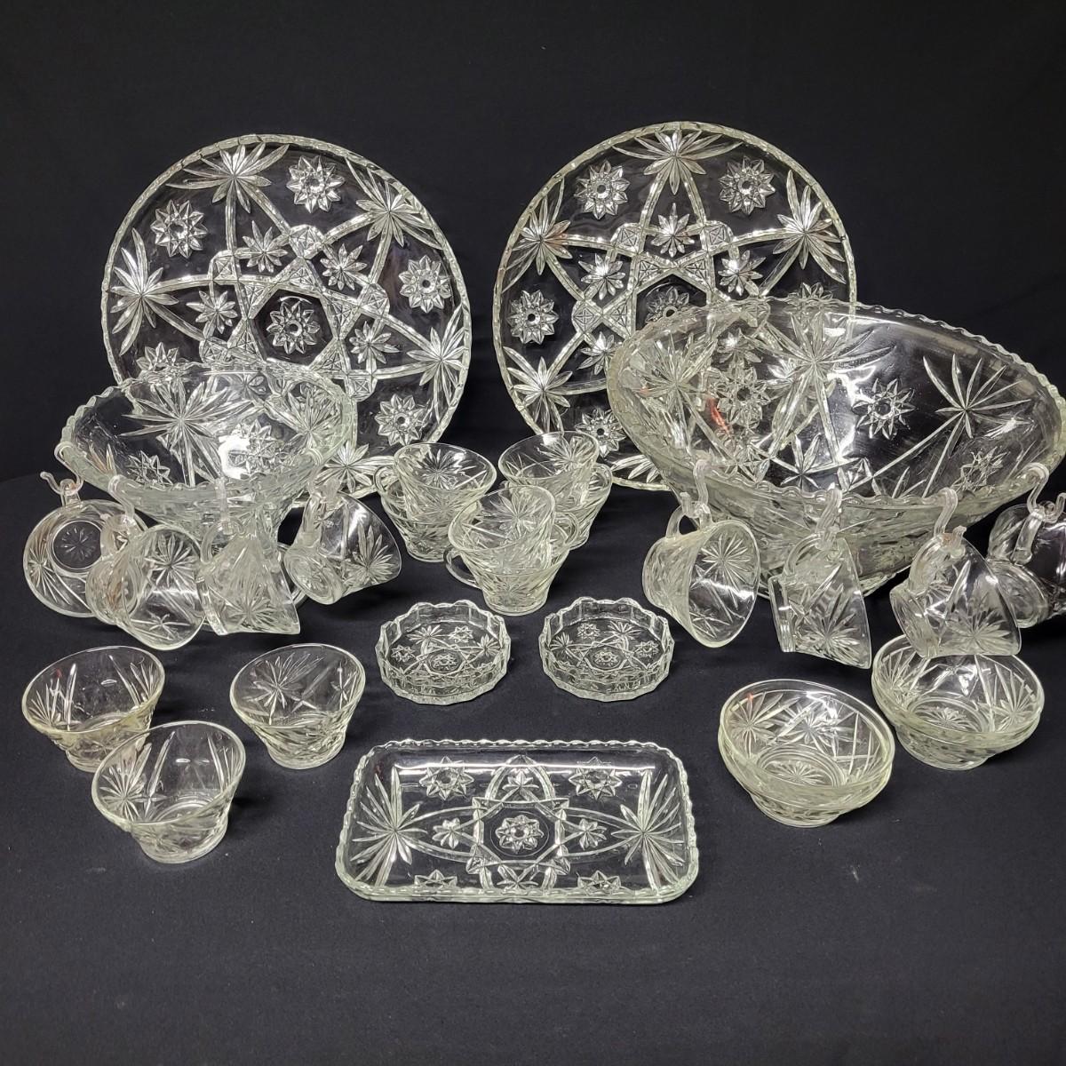 A lot of 28 pieces of cut class in excellent condition. Assortment includes 2 large serving dishes, 14 punch cups, 2 punch bowls, 7 small bowls and 2 ashtrays largest bowl measures approximately 14" x 7.5" Local pickup only