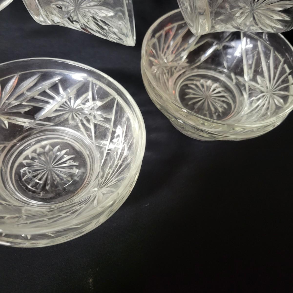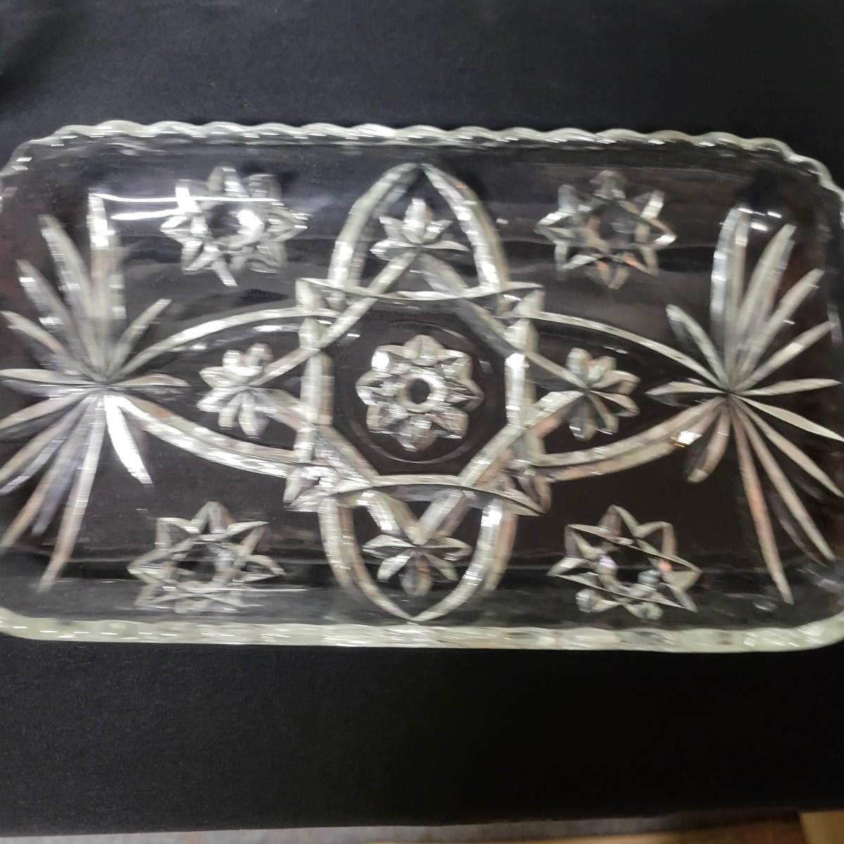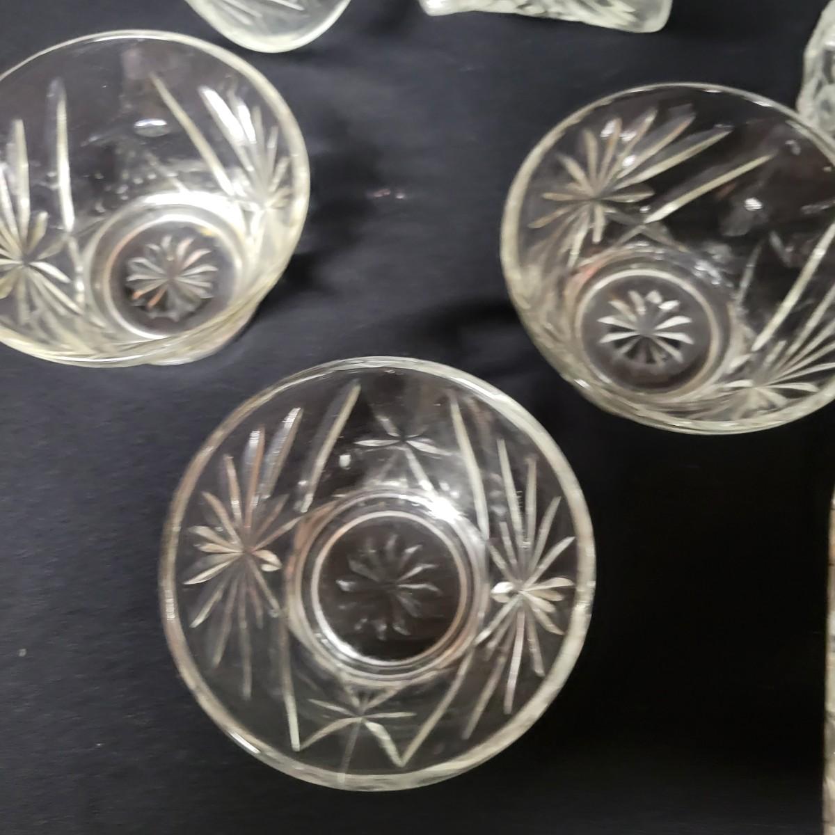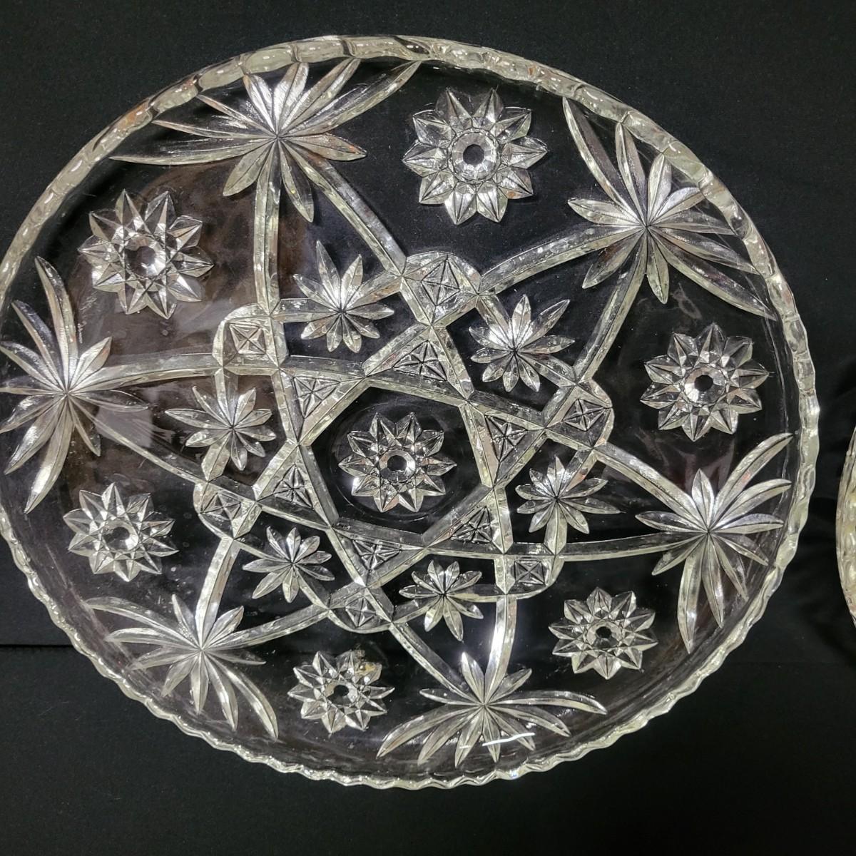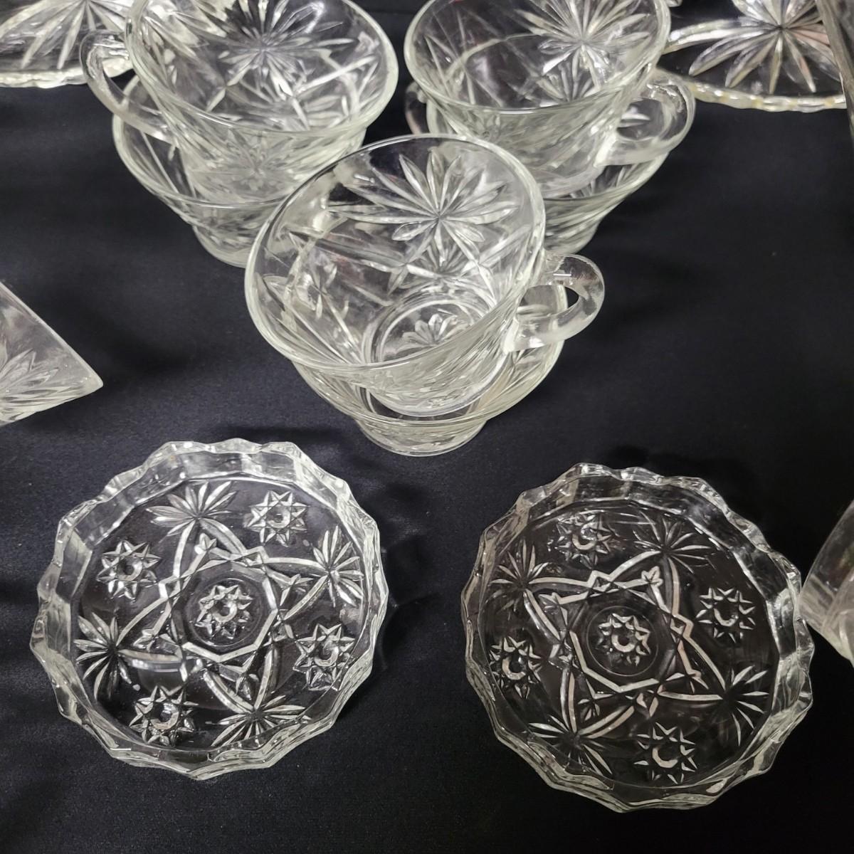 A lot of 28 pieces of cut class in excellent condition. Assortment includes 2 large serving dishes, 14 punch cups, 2 punch bowls, 7 small bowls and 2 ashtrays largest bowl measures approximately 14" x 7.5" Local pickup only