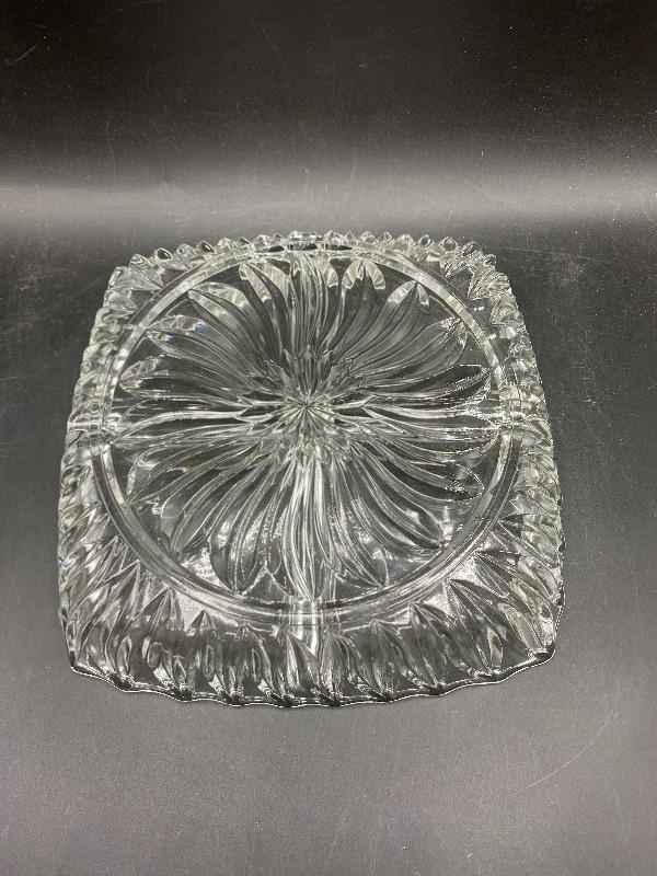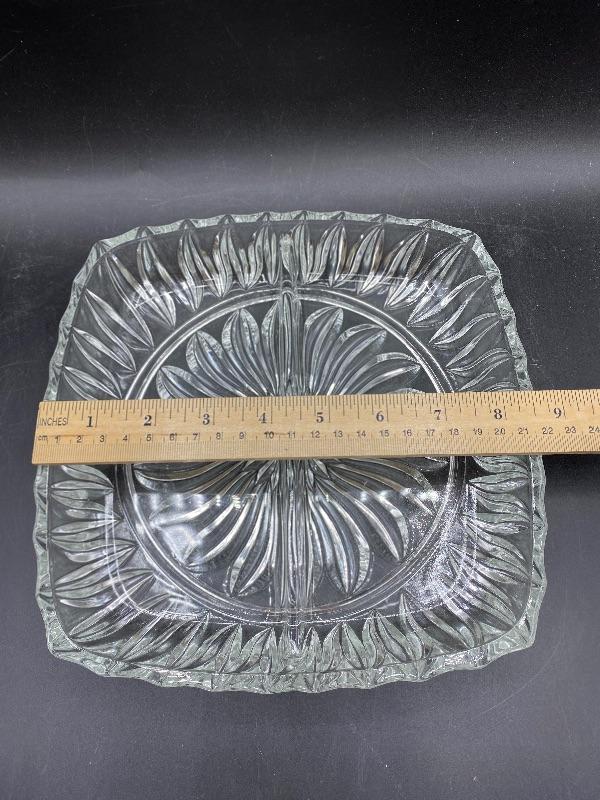 Simple yet elegant square divided dish. Great for candy, nuts, condiments. Divided into 4 sections. Great for any occasion. Almost 9" wide.