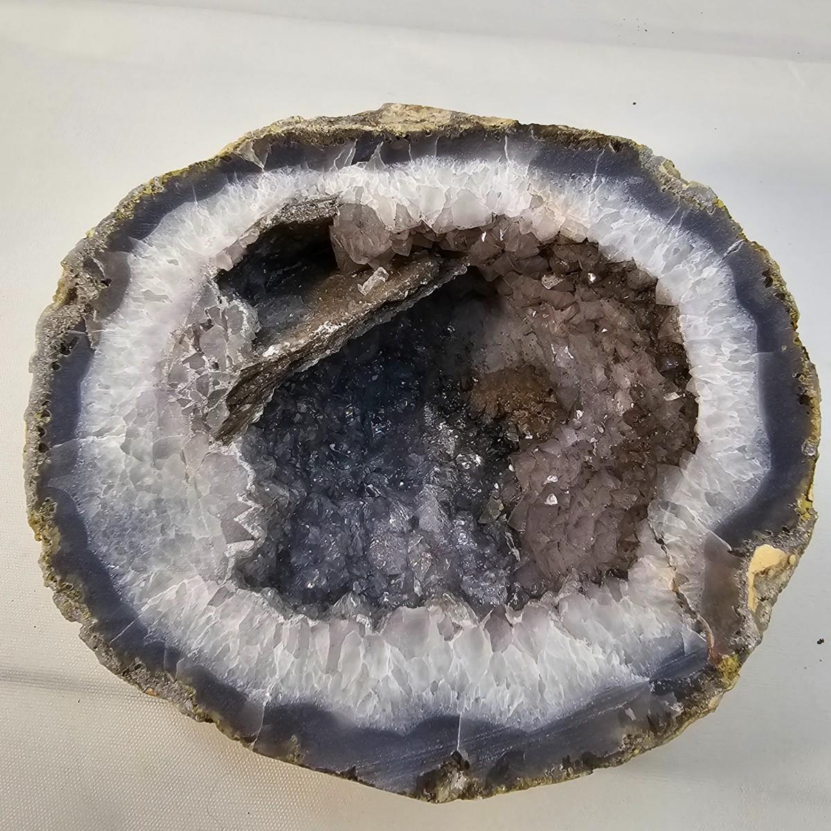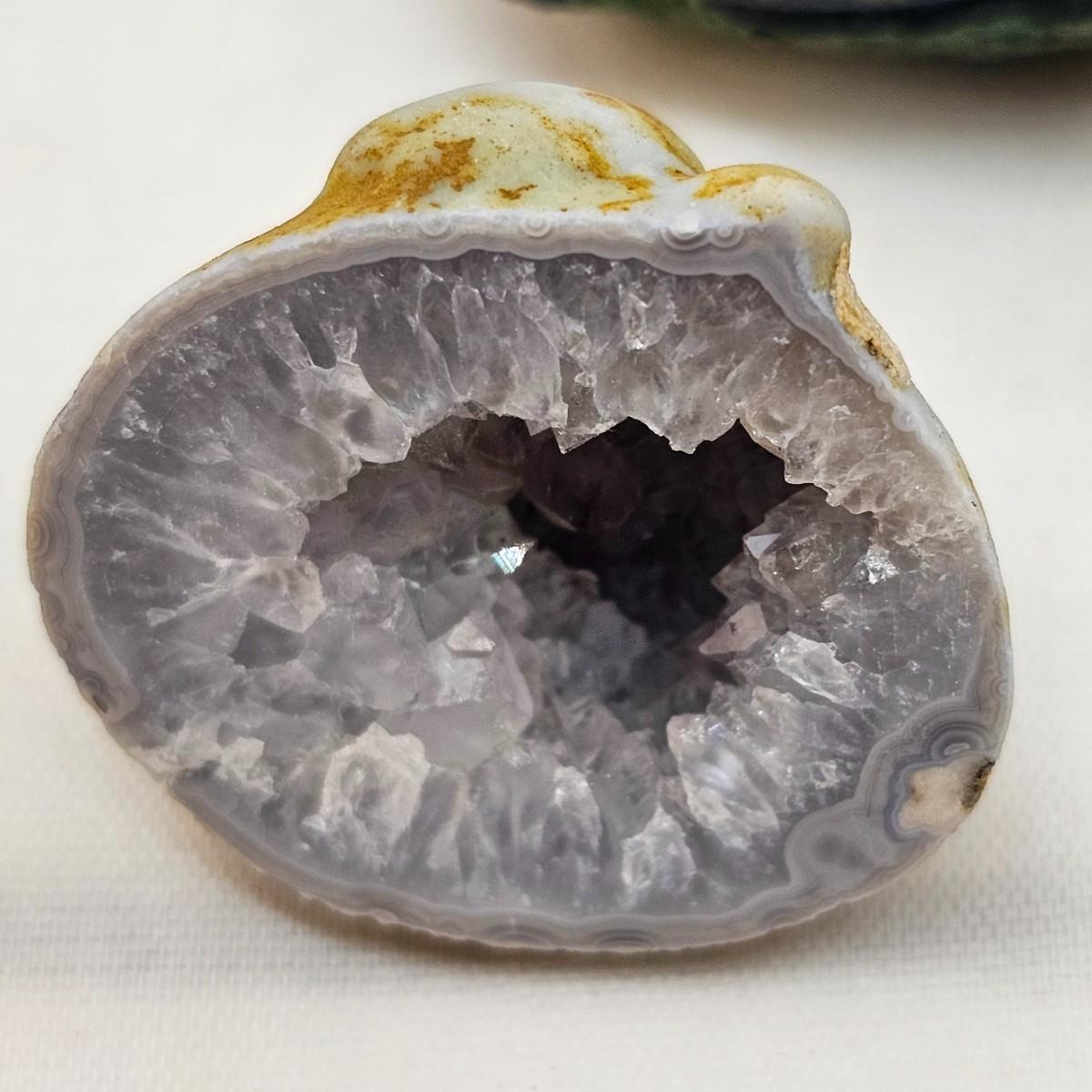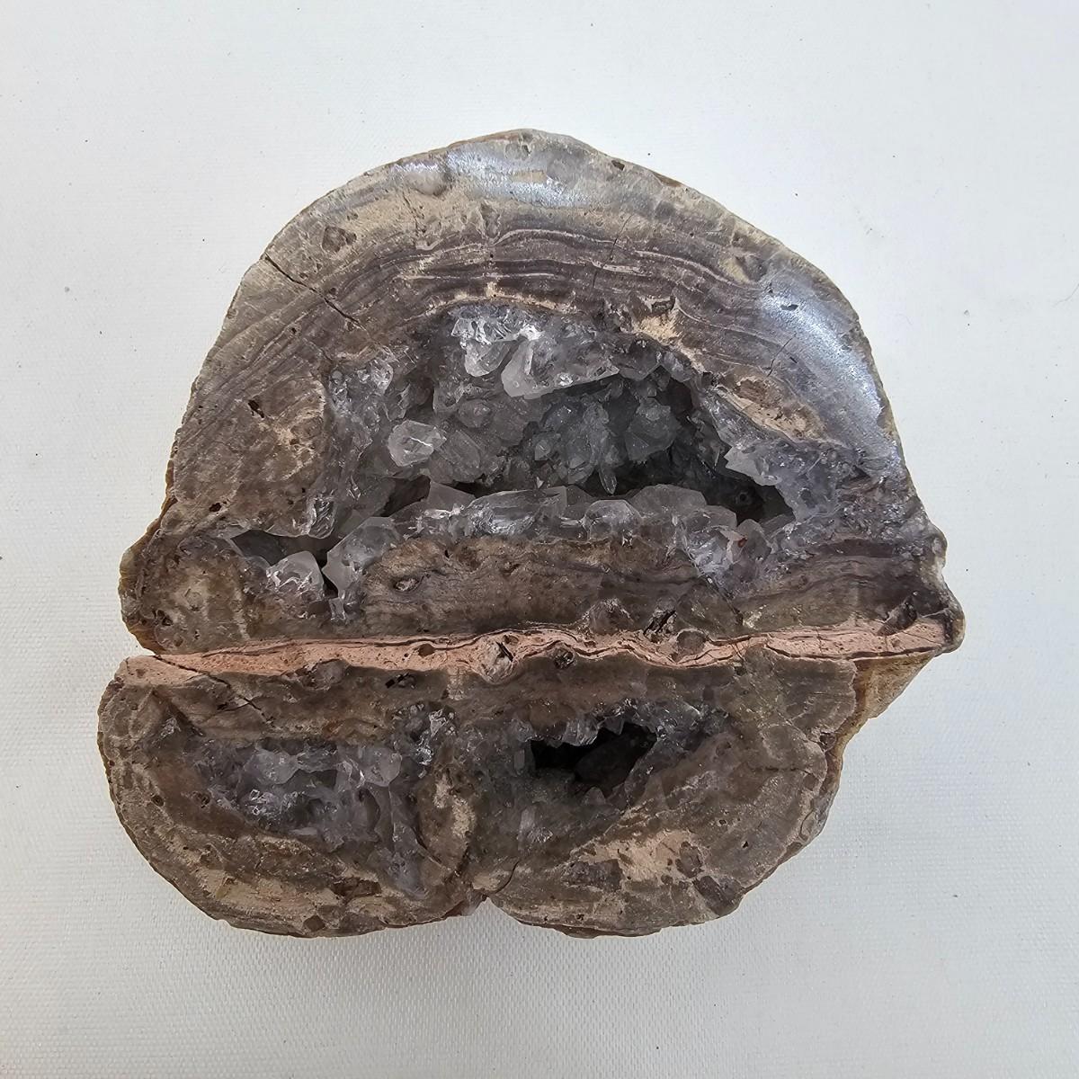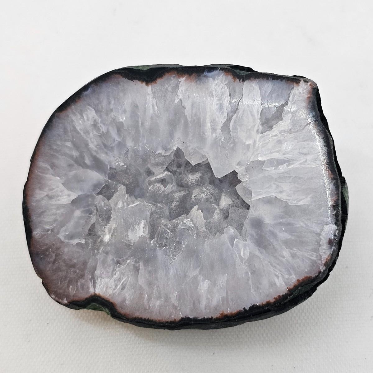 Fifteen beautiful examples of agate nodules that have been sliced open and polished to show off their inner beauty. To the untrained eye the outside of these appear to be nothing but rough forms, but inside a treasure awaits. No two ever alike, different arrays and crystal structures. Largest piece measures 5" x 5.5" x 3"H, smallest is 1" x 1.25" x 1"H. Plastic drawer included with lot. See photos for details.