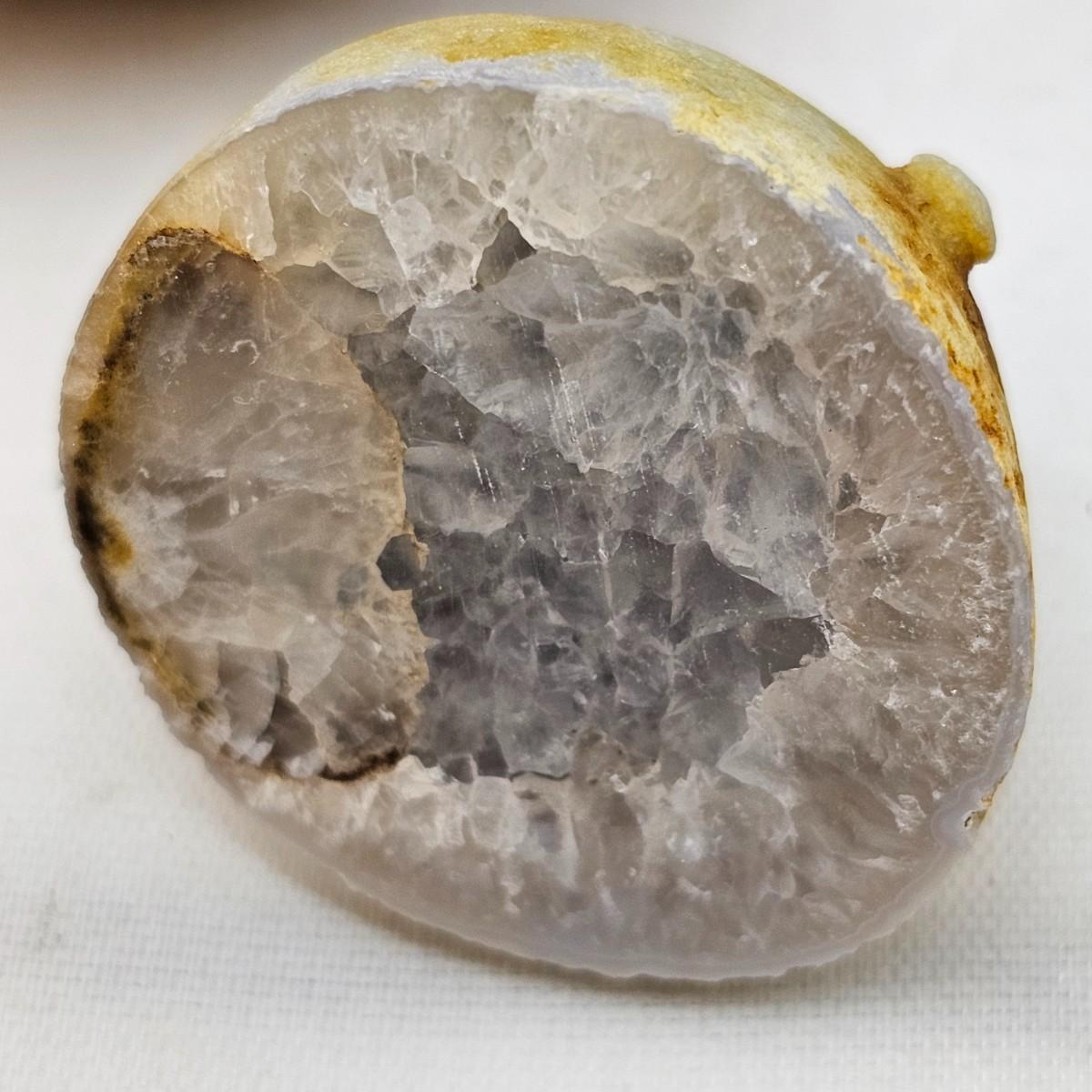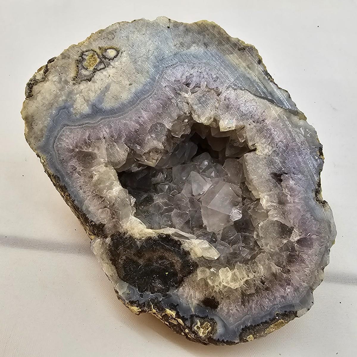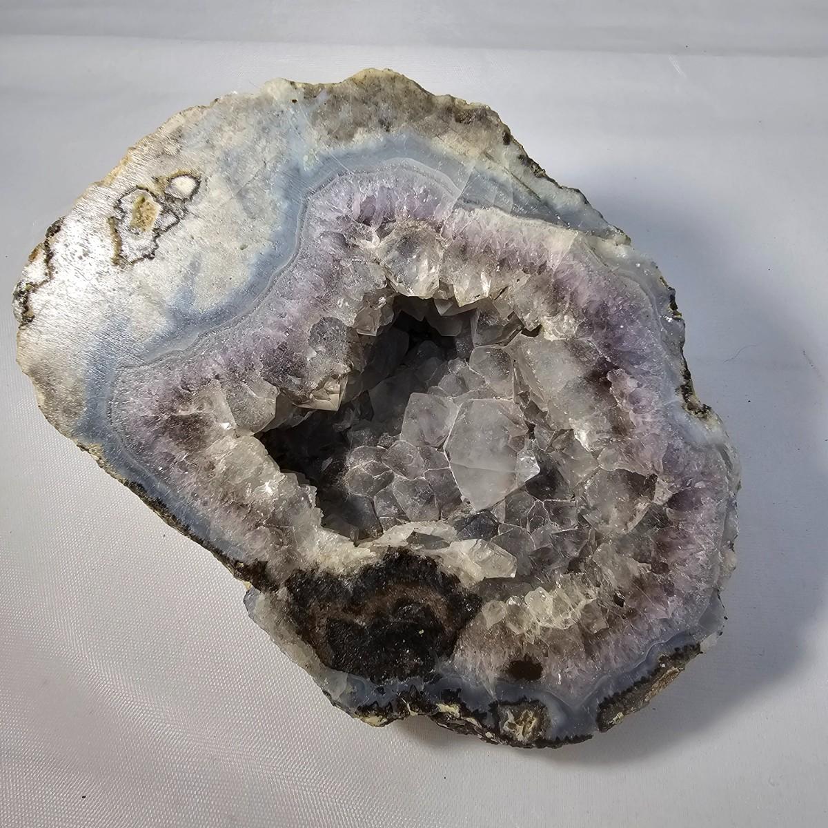 Fifteen beautiful examples of agate nodules that have been sliced open and polished to show off their inner beauty. To the untrained eye the outside of these appear to be nothing but rough forms, but inside a treasure awaits. No two ever alike, different arrays and crystal structures. Largest piece measures 5" x 5.5" x 3"H, smallest is 1" x 1.25" x 1"H. Plastic drawer included with lot. See photos for details.
