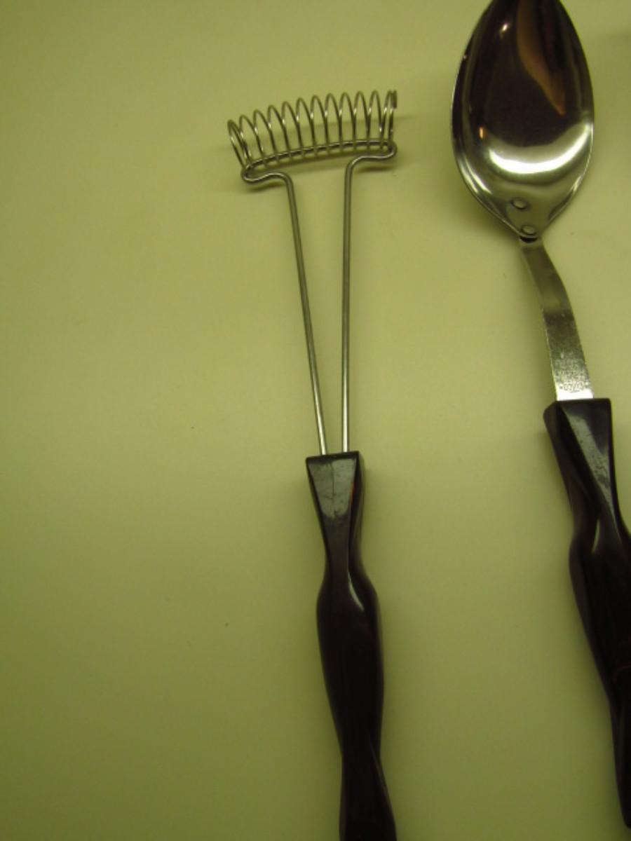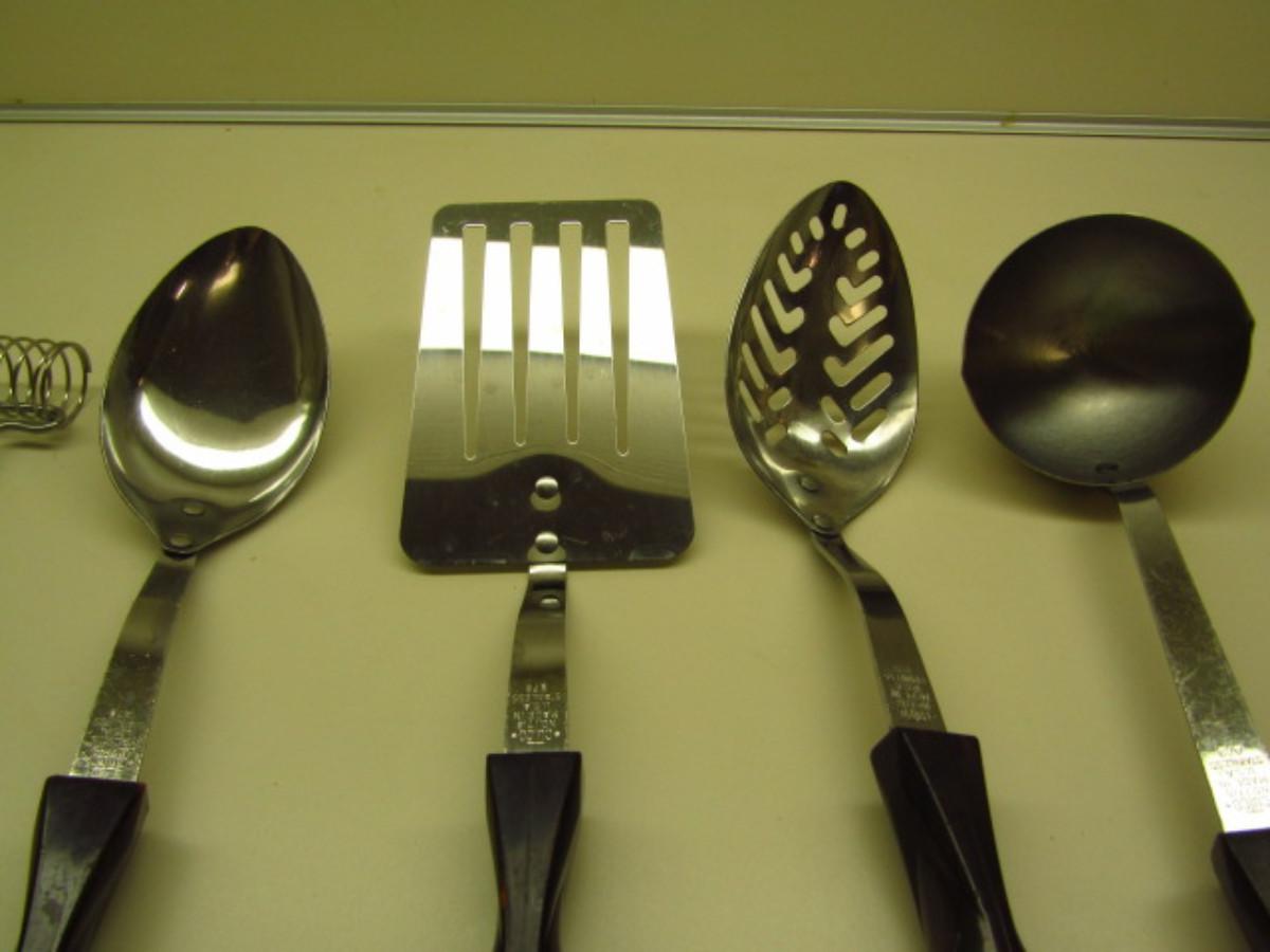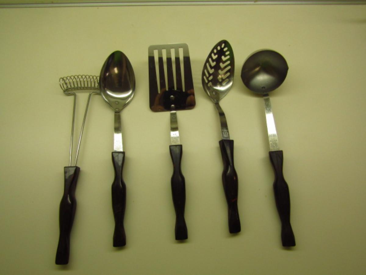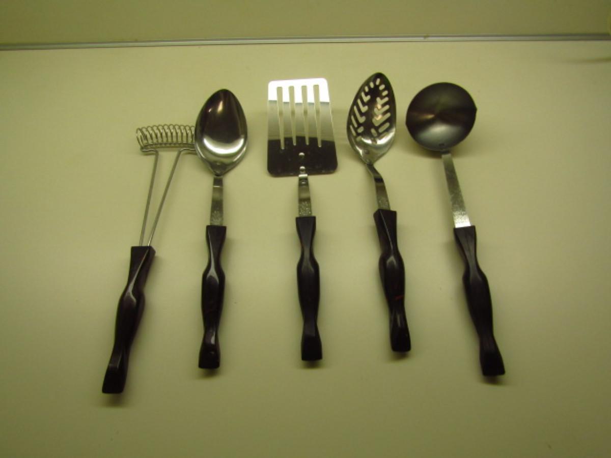 Cutco Kitchen Utensils- Set of 5. Solid spoon, slotted spoon, ladle, spatula, and whisk.
