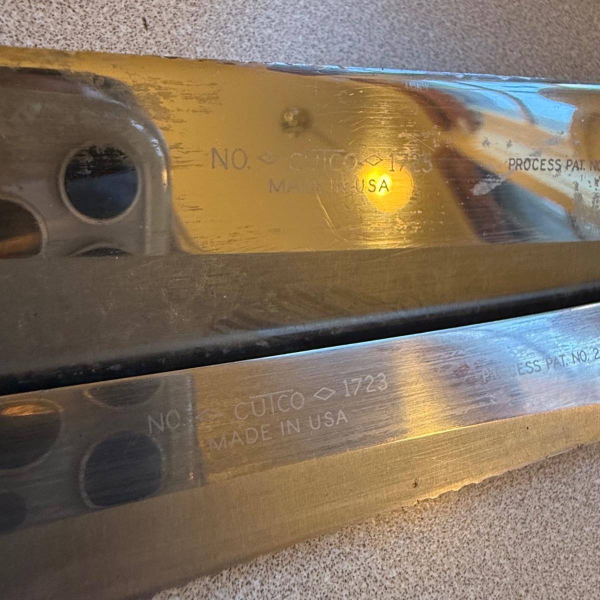 The 10” Cutco trimming knife has wear on the end of the handle. See pictures for details. All need to be cleaned. Shipping available.