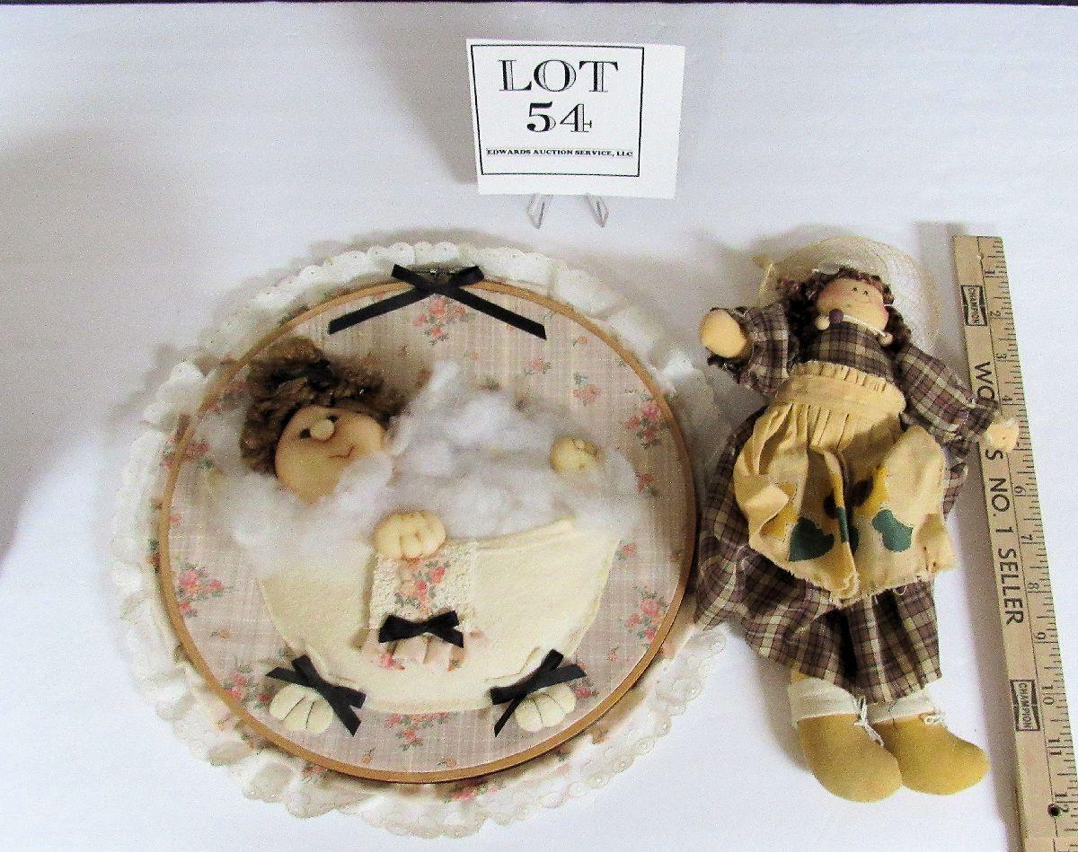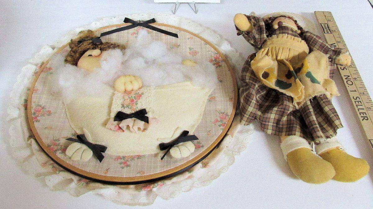 The wall hanging is just adorable and in good shape. Made of cotton, nylon, felt, lace, etc. Fabric doll in good shape. Shipping is available at shipping cost plus $5.00 handling fee on one box, $10.00 handling fee on two boxes, $15.00 handling fee on 3 boxes. Helps cover shipping materials and labor cost. You will receive exact item as pictured, no refunds, returns not accepted. Do not bid if you do not intend to pay for your lots or the shipping/handling fees.