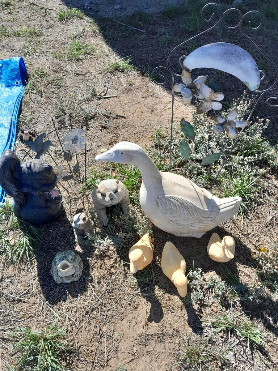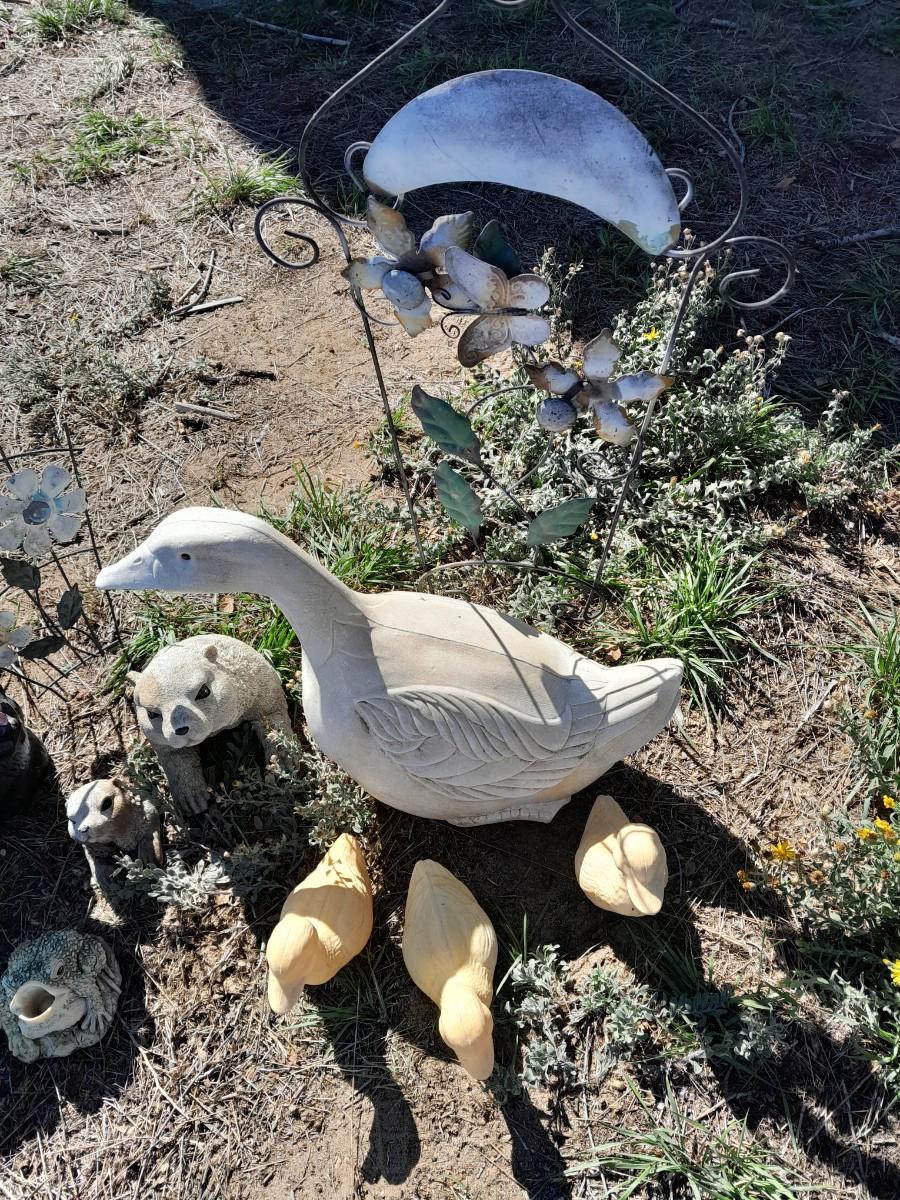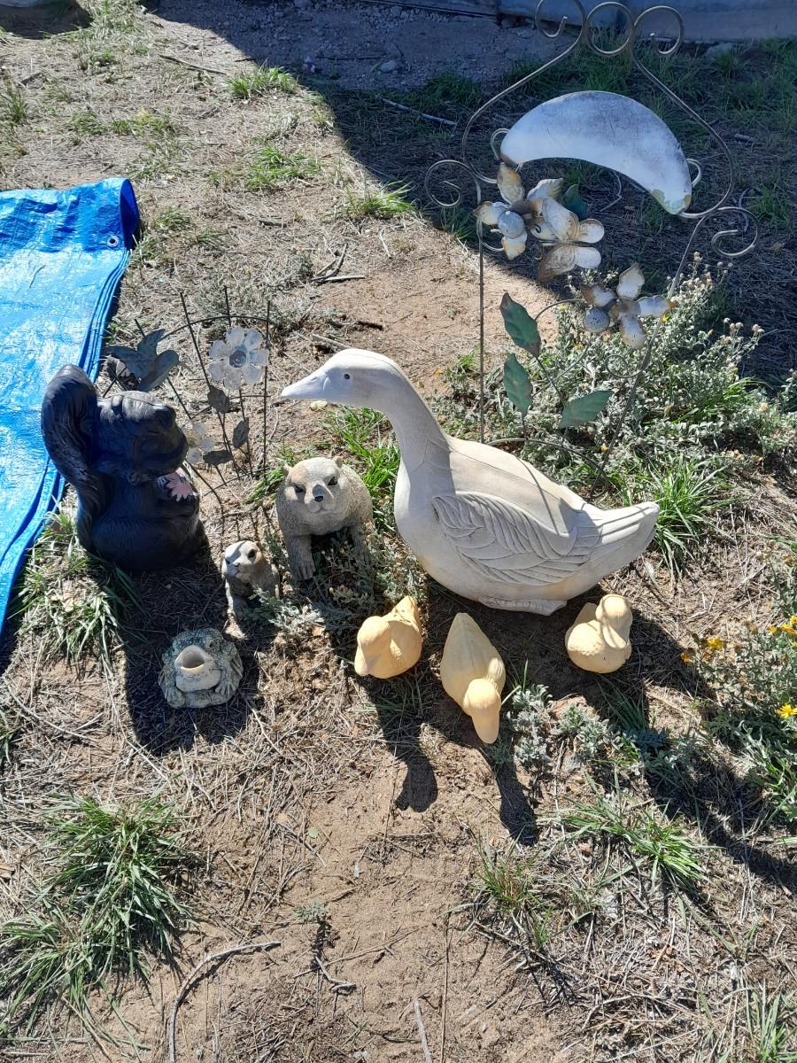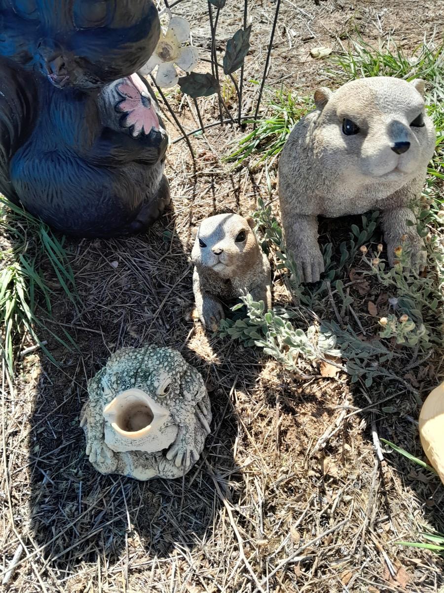 PLASTIC DUCK, WITH DUCKLINGS, TWO MARMOTS WHO ARE HALF OUT OF DIRT, SQUIRREL, AND A FROG, AS WELL AS TWO SMALL DECORATIVE TRELLIS PIECES.
