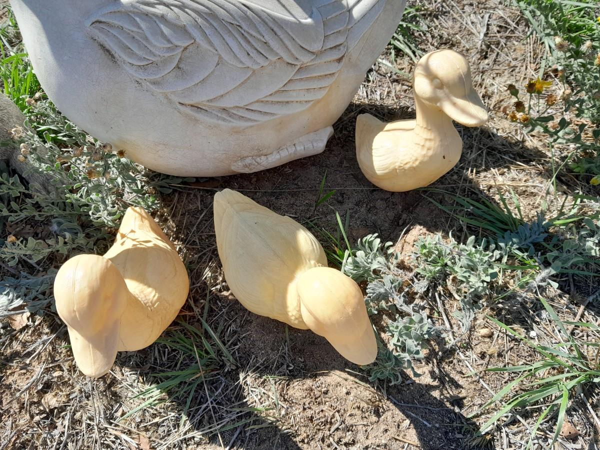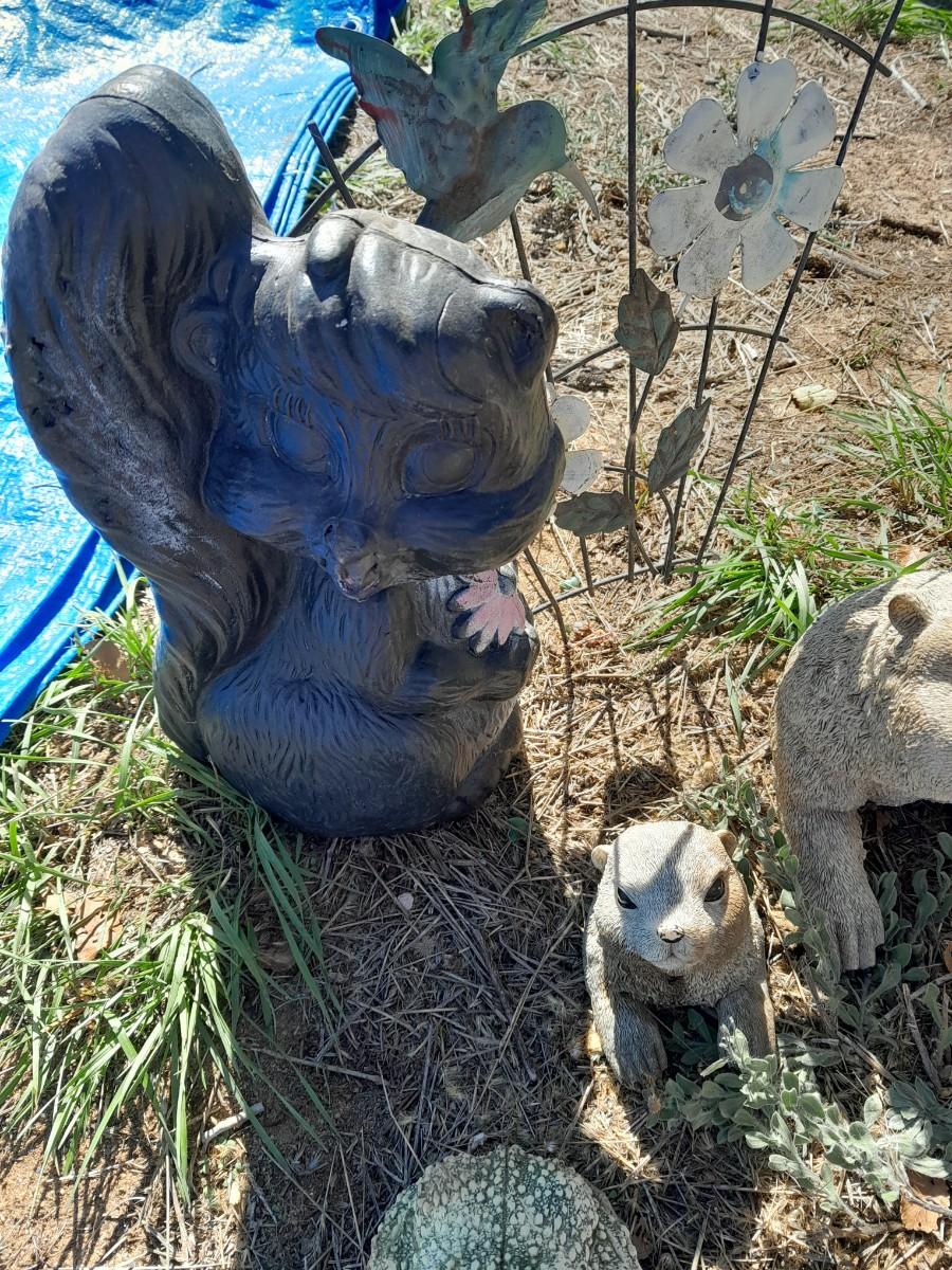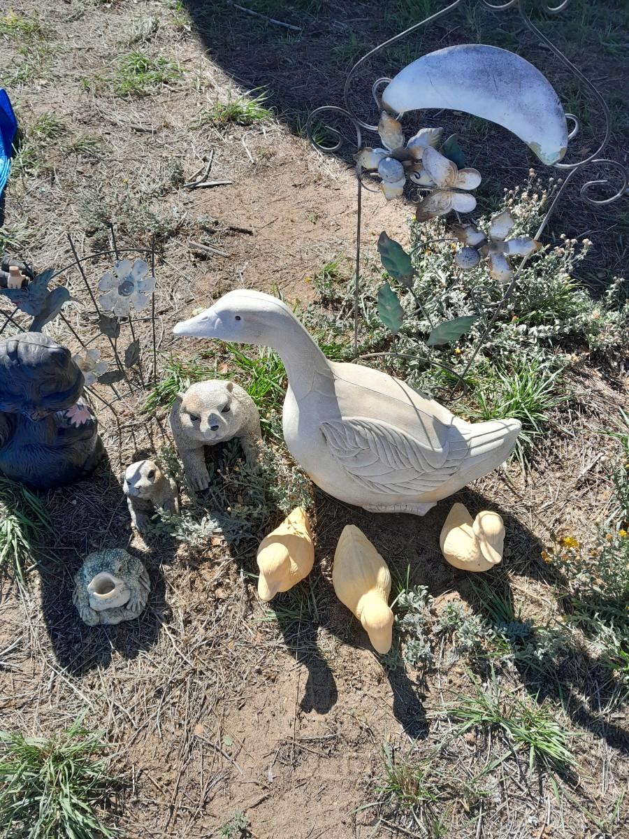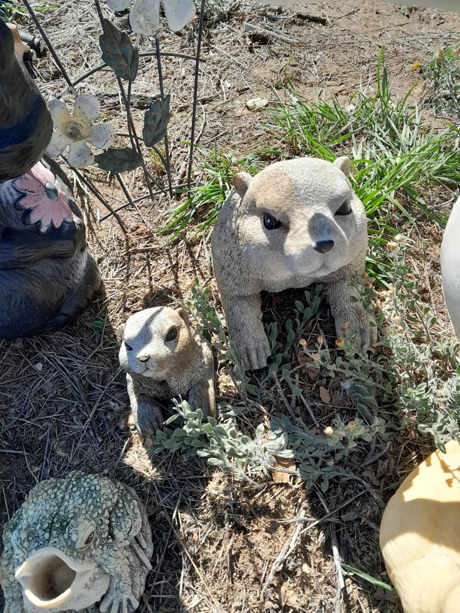 PLASTIC DUCK, WITH DUCKLINGS, TWO MARMOTS WHO ARE HALF OUT OF DIRT, SQUIRREL, AND A FROG, AS WELL AS TWO SMALL DECORATIVE TRELLIS PIECES.