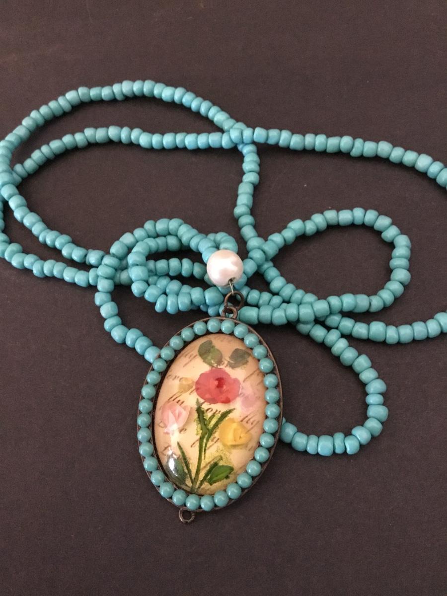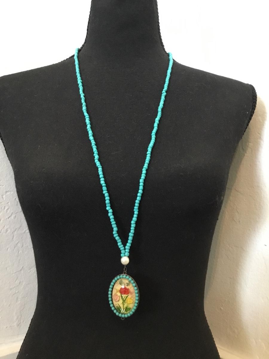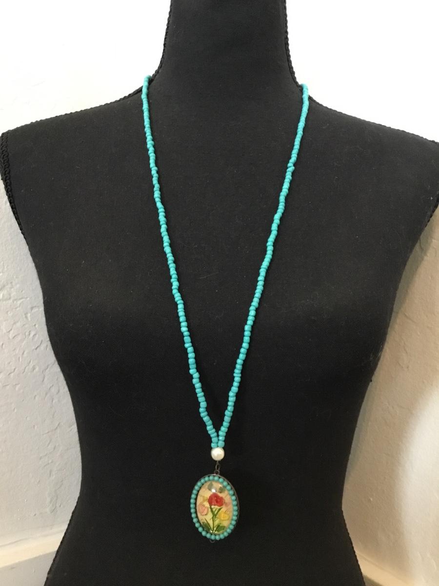 Cute faux turquoise, stone bead, flower, pendant, necklace