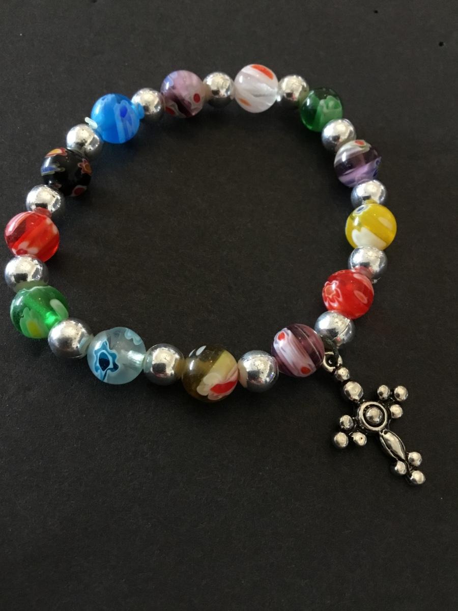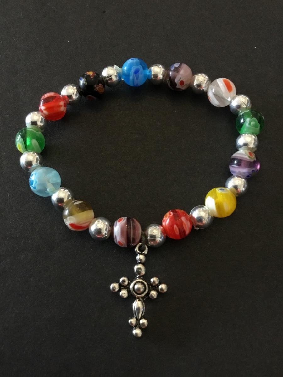 Cute glass bead, Silver-tone stretch bracelet with cross charm