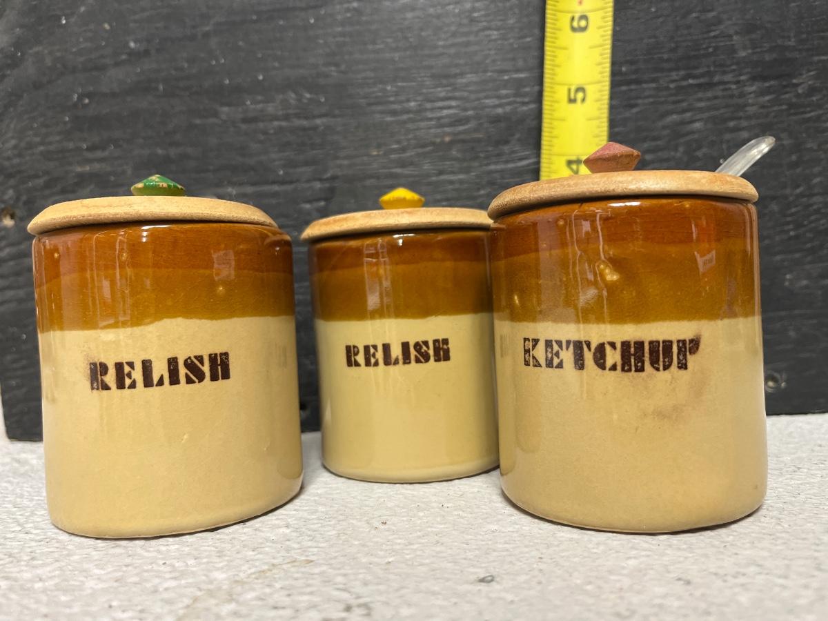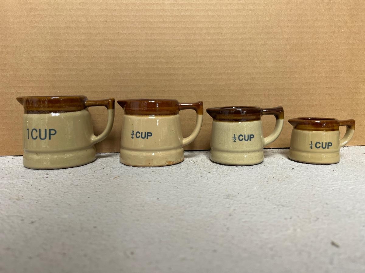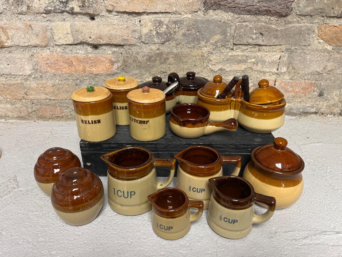 Set of 4 measuring pitchers, lug, lidded pot, trio of condiment pots, two mustard pot duos, and set of salt & pepper shakers