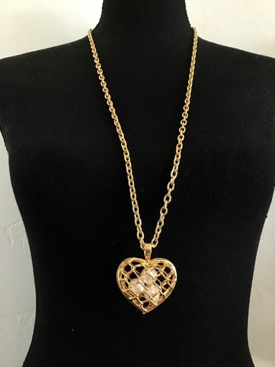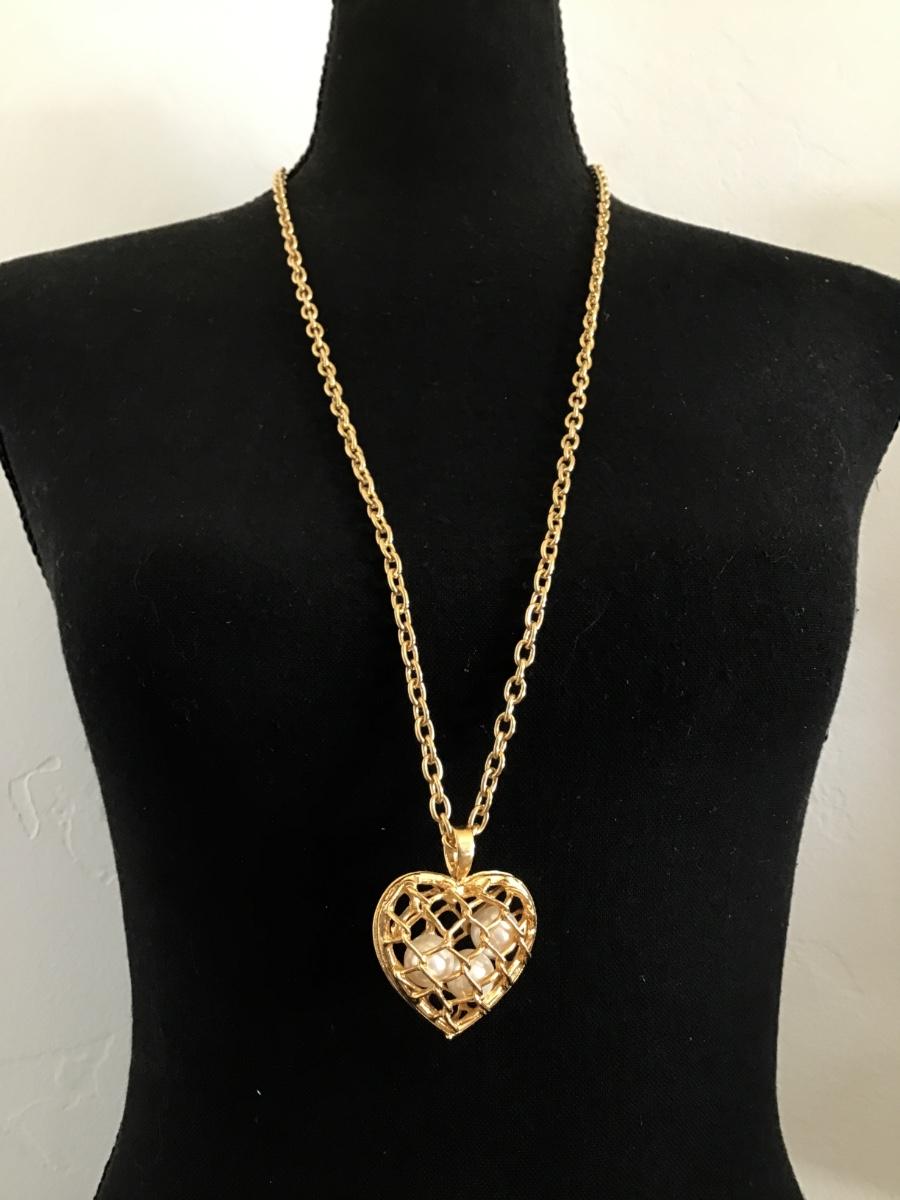 Cute Gold tone, long chain, puffy, caged, pearl heart pendant necklace