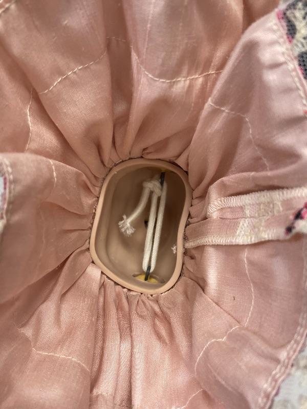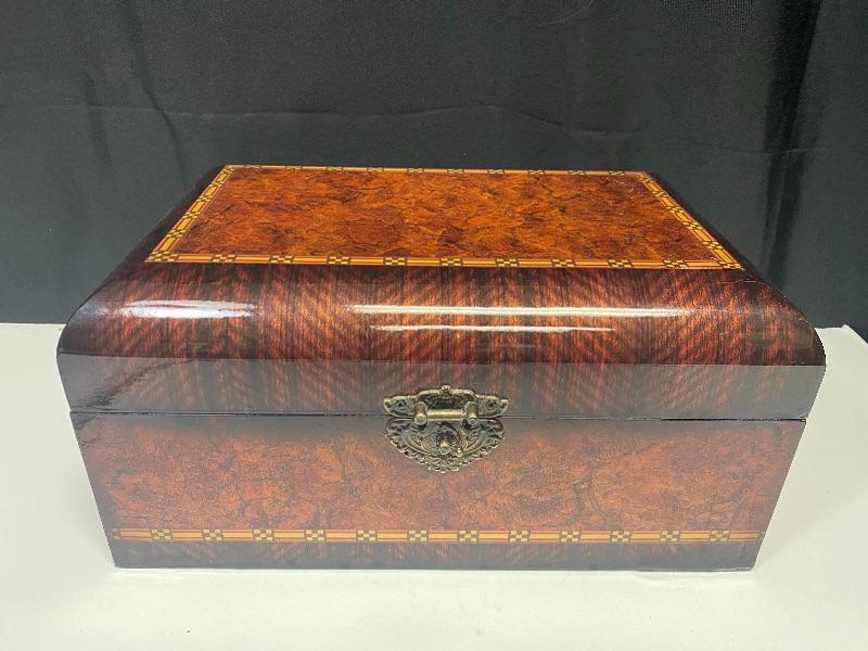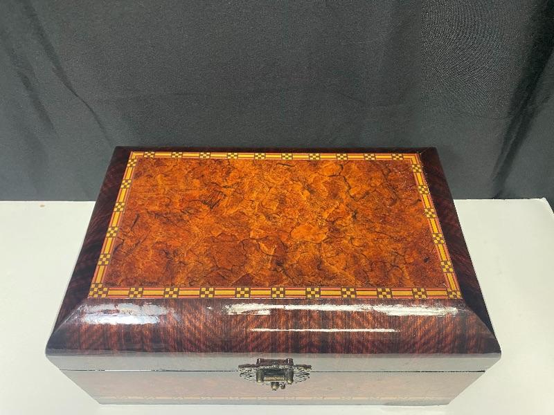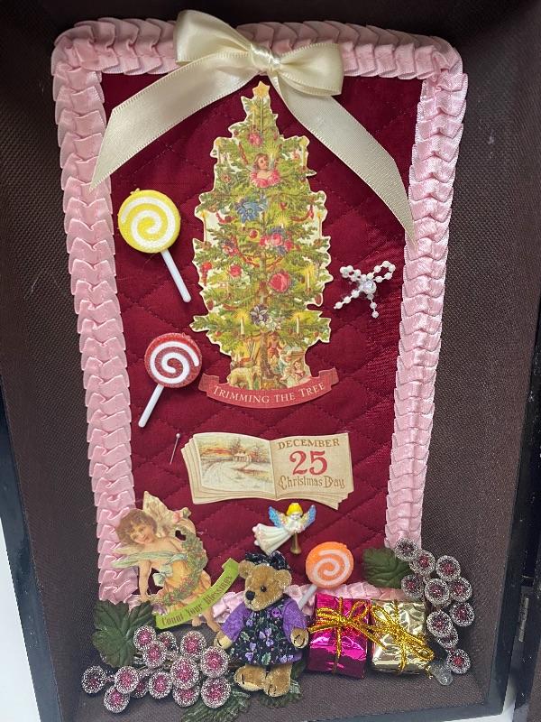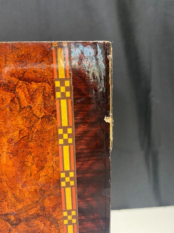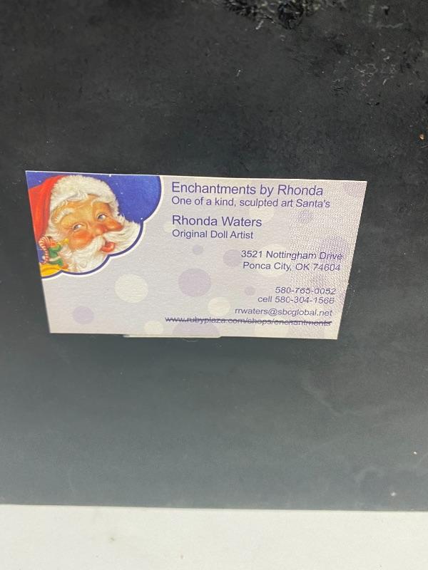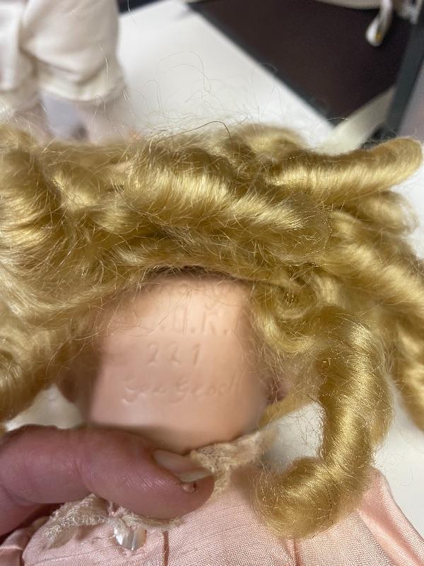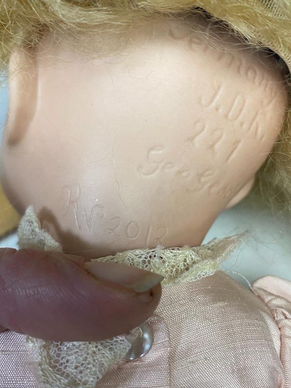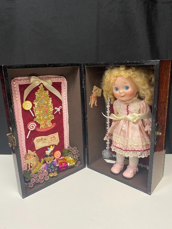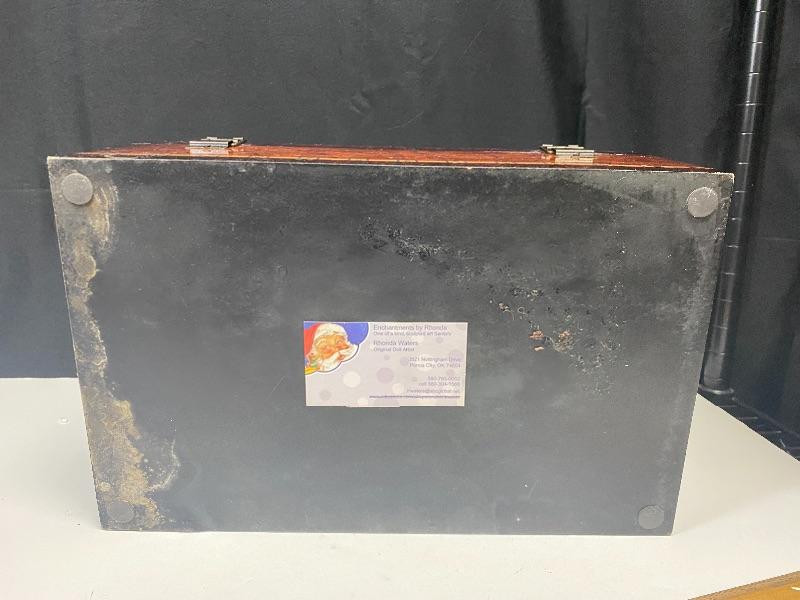 Cute googly eyed blonde JDK repro doll in decorated box. Done by Rhonda Waters in 2012. Dolls head is marked Made in Germany J.D.K. 221 Geo Gesch with RW2012 etched lightly. Interesting doll as the artist has cut her in have and made her into a hidden trinket box. Doll stands about 12". She comes in a decorated wood box. Artists info card on the bottom of box. The box has a little damage to the veneer edge but displays nicely.