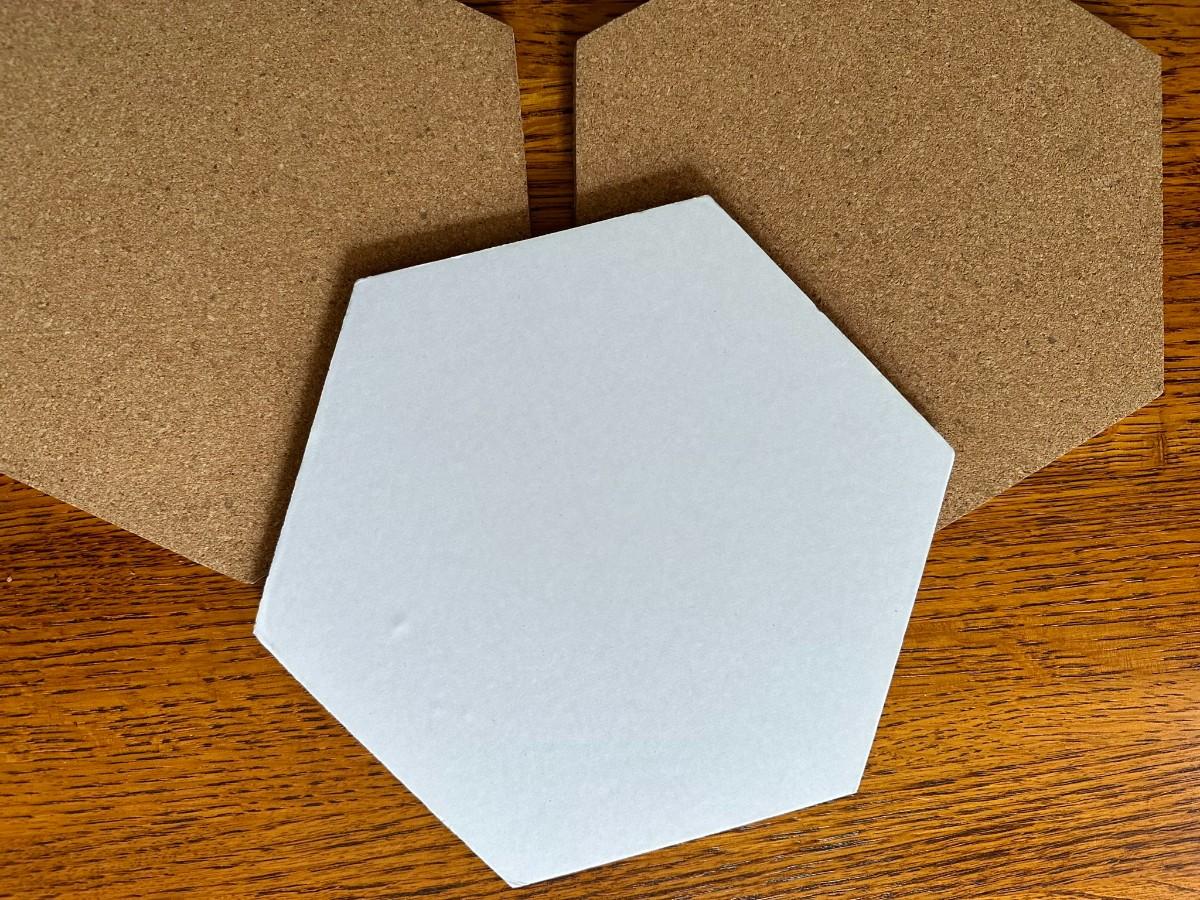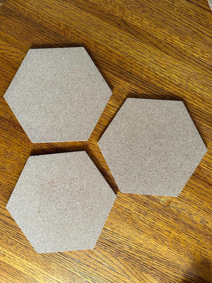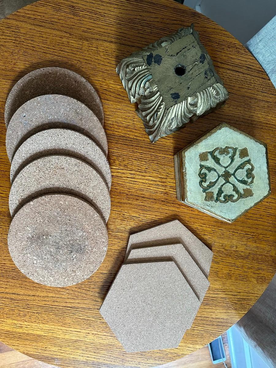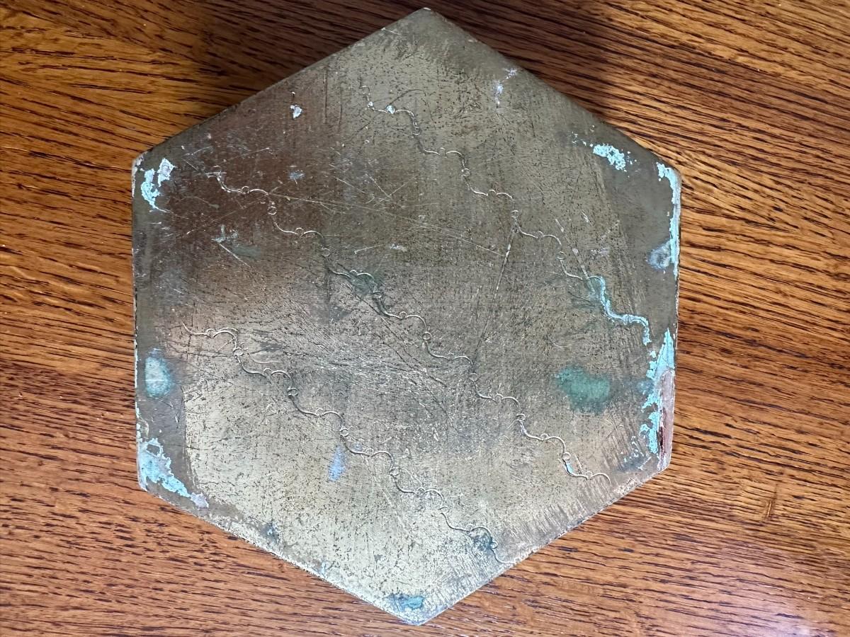 Gold Trimmed Hexagon Box is 7"w at widest point. Several Cork pieces for under plants measure approx. 7"w. Gold Décor/Taper Holder is 6.6" sq