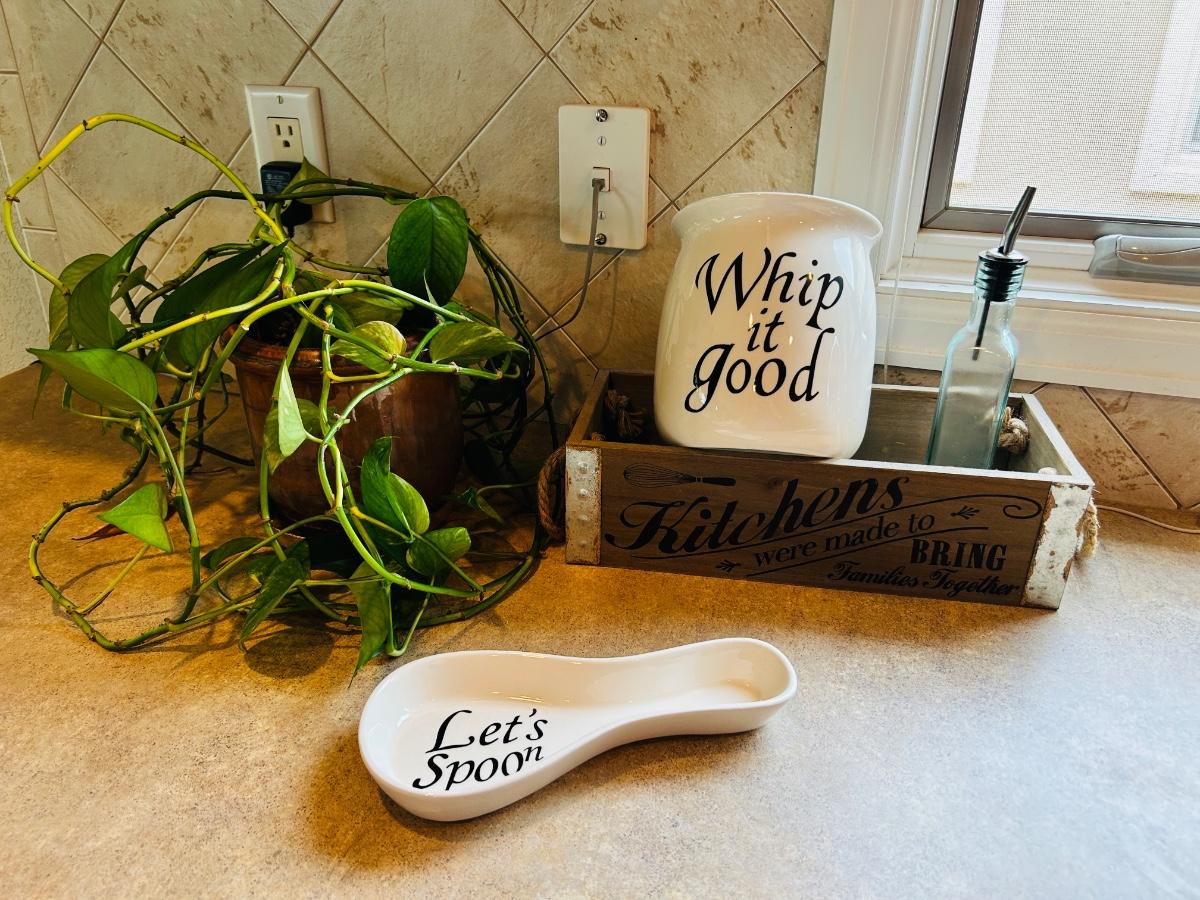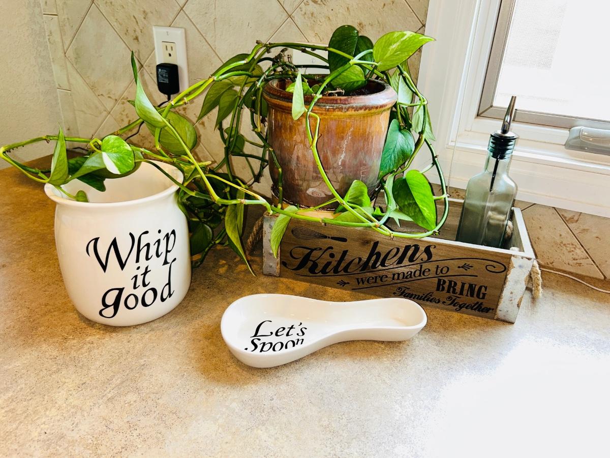 LIVE PLANT, SPOON REST, CANISTER AND WOODEN BOX
