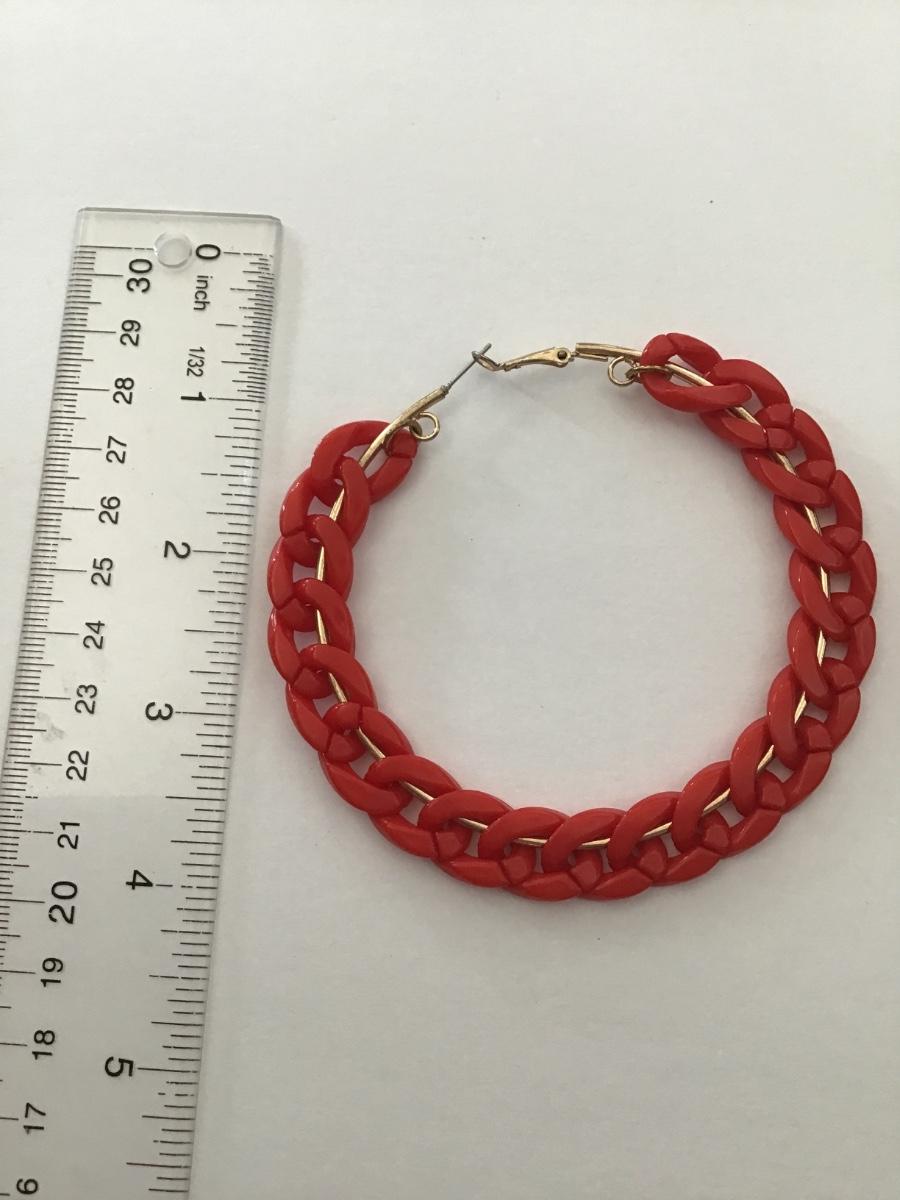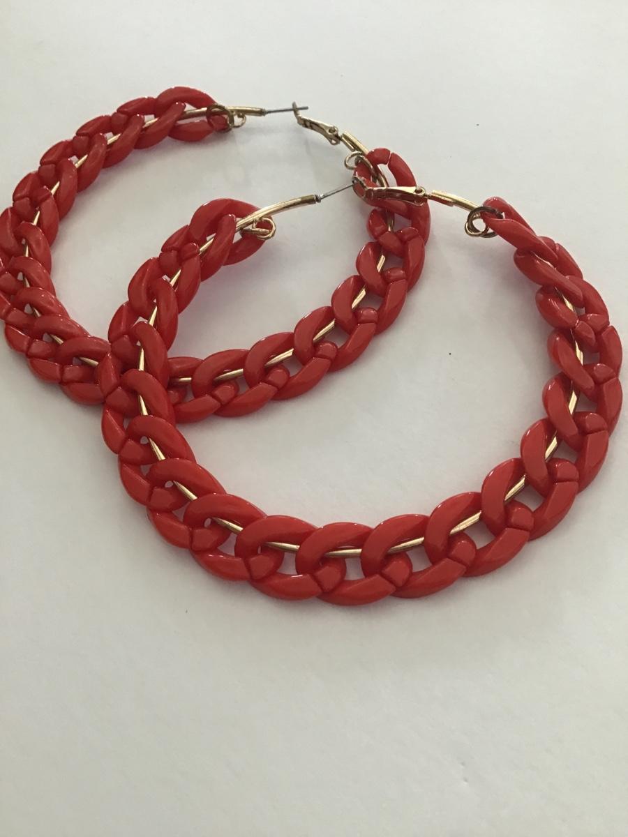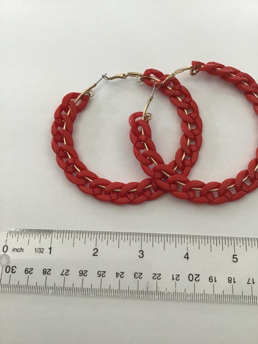 Cute, large, gold tone, cherry red acrylic, chain-link hoop statement earrings