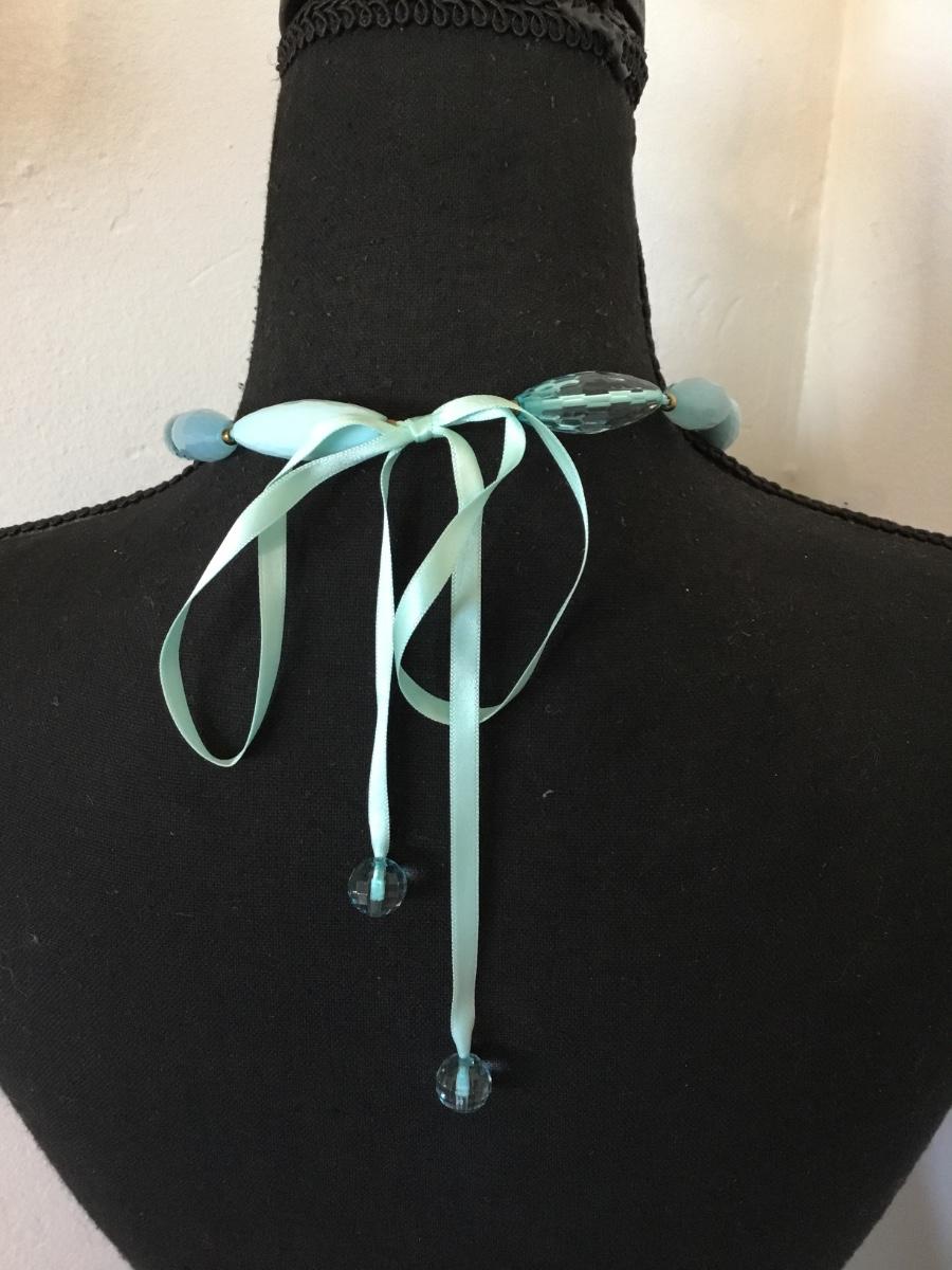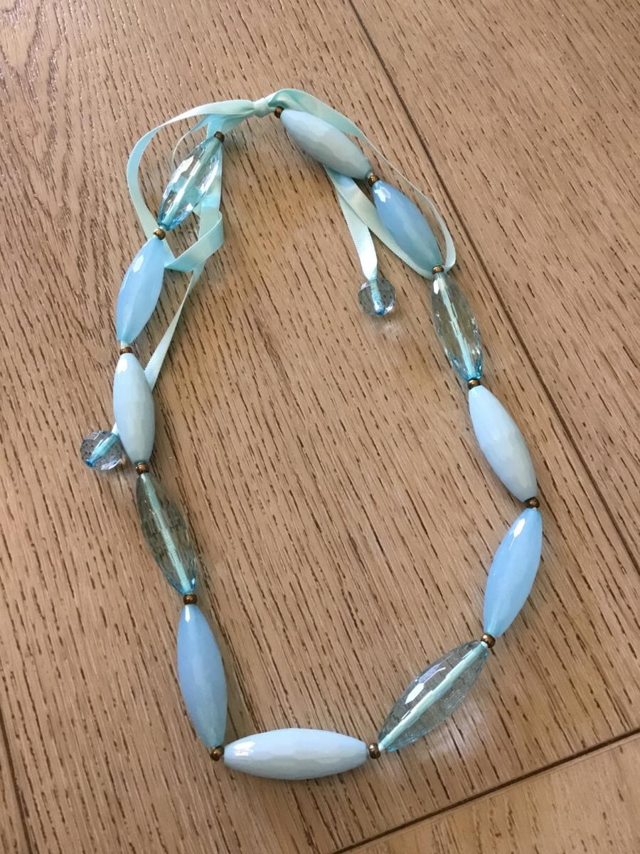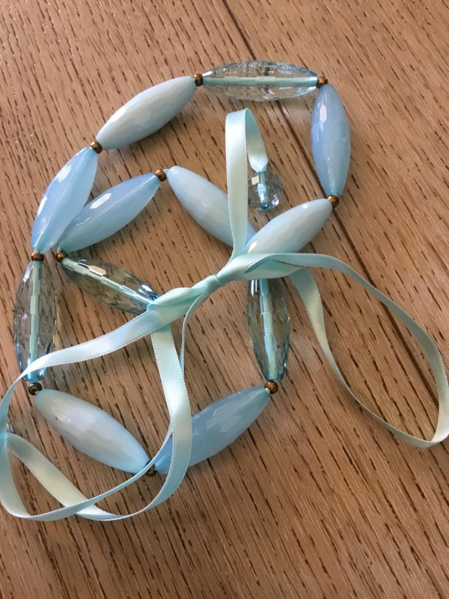 Cute light baby blue long tube, faceted bead, necklace, silver silver ribbon tie