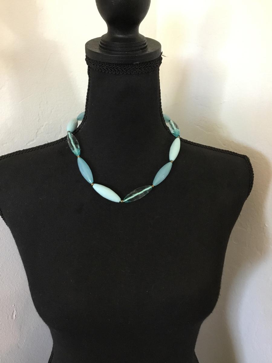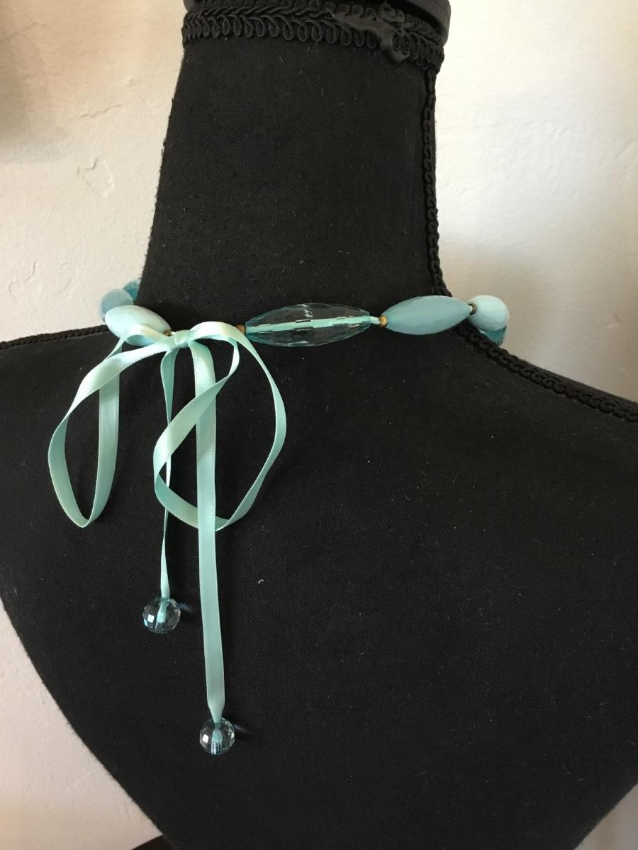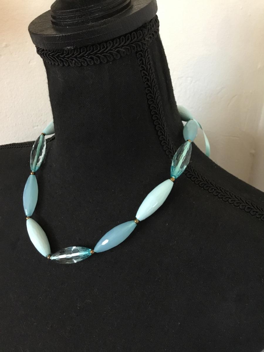 Cute light baby blue long tube, faceted bead, necklace, silver silver ribbon tie