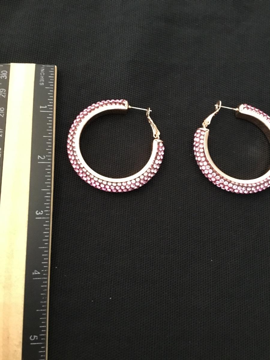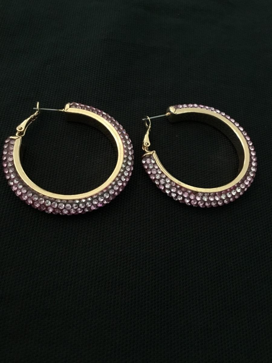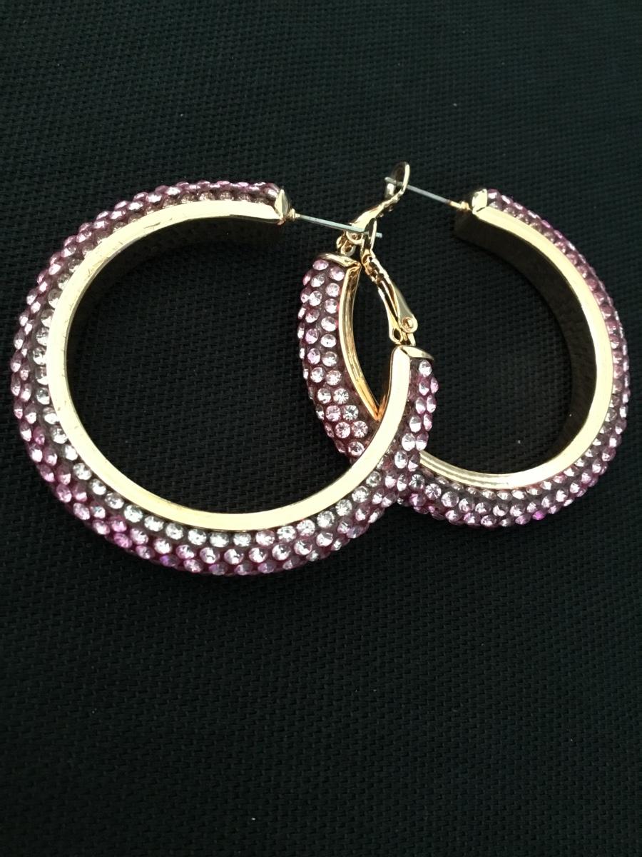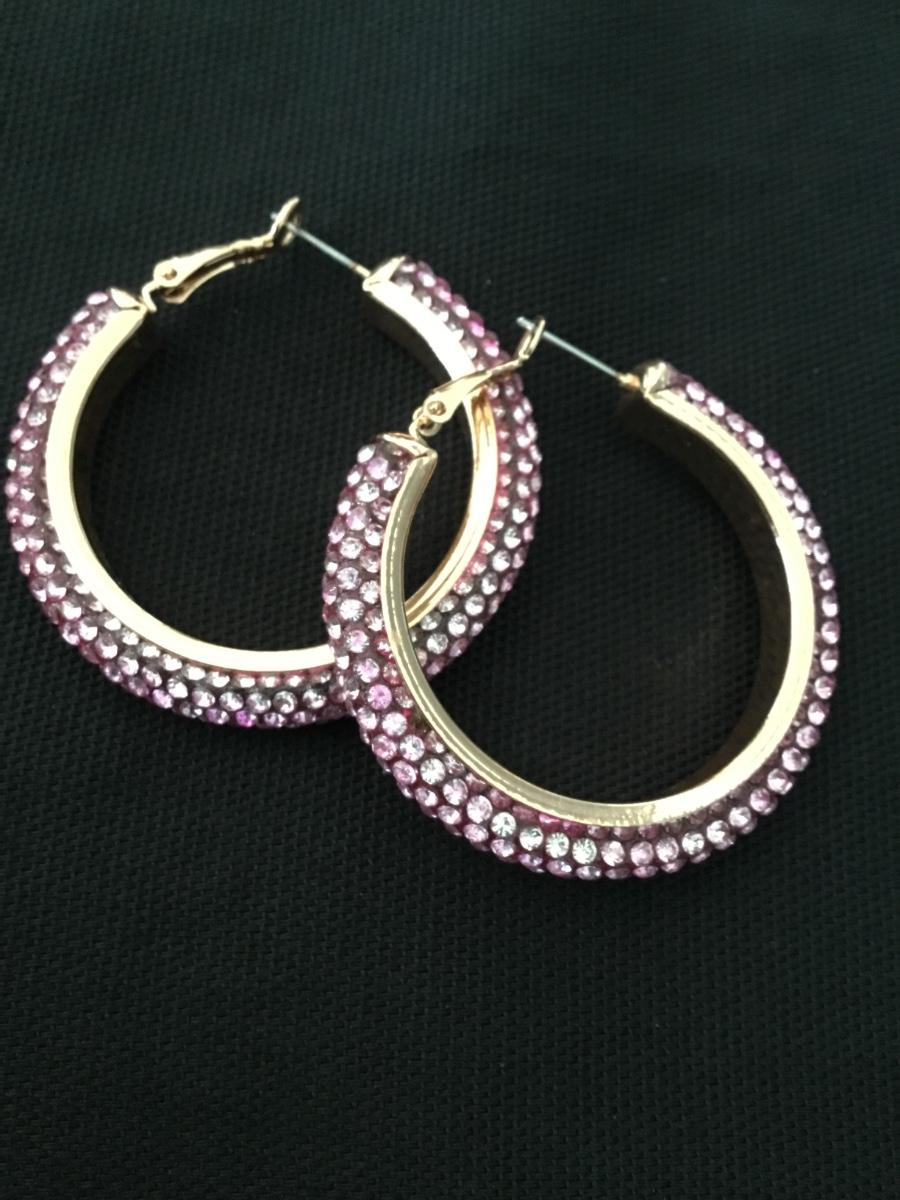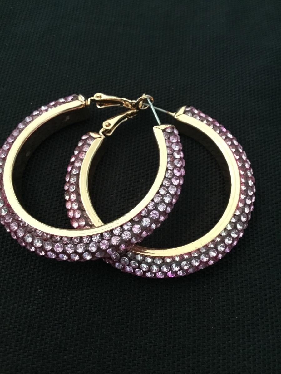 Cute. Light, pink rhinestone, gold, toned, encrusted, rhinestone hoop, earrings
