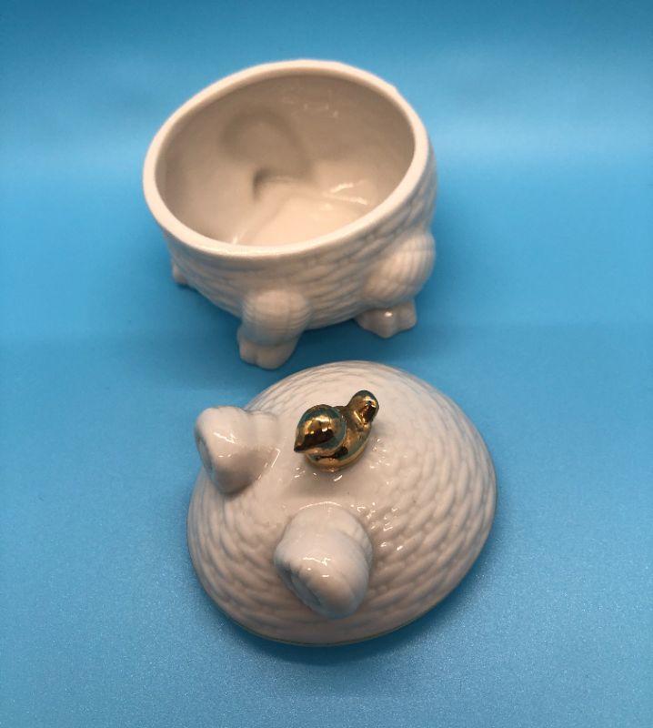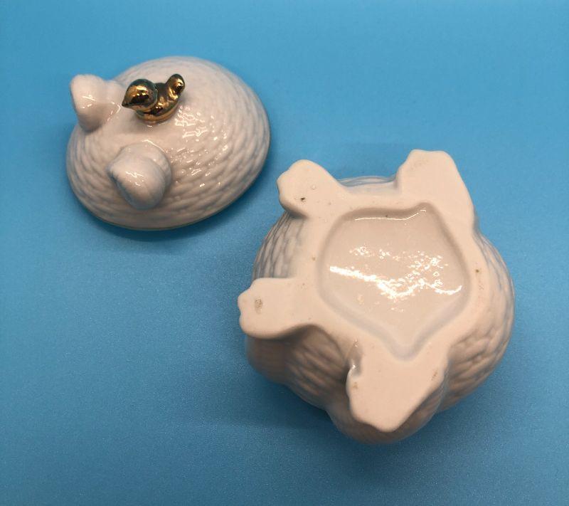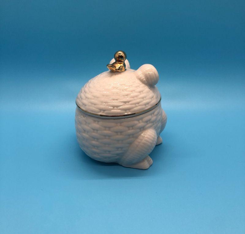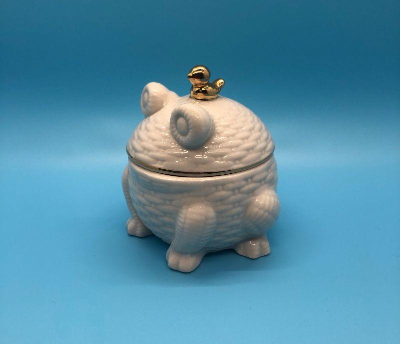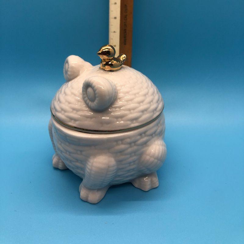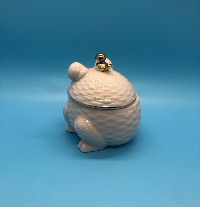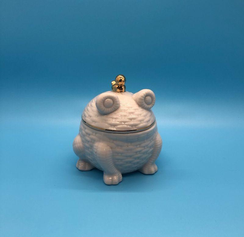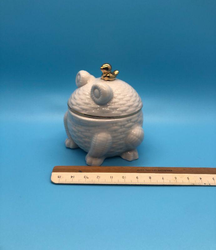 Cute little frog trinket box - white frog with gold bird on head - no marks - made by Enesco