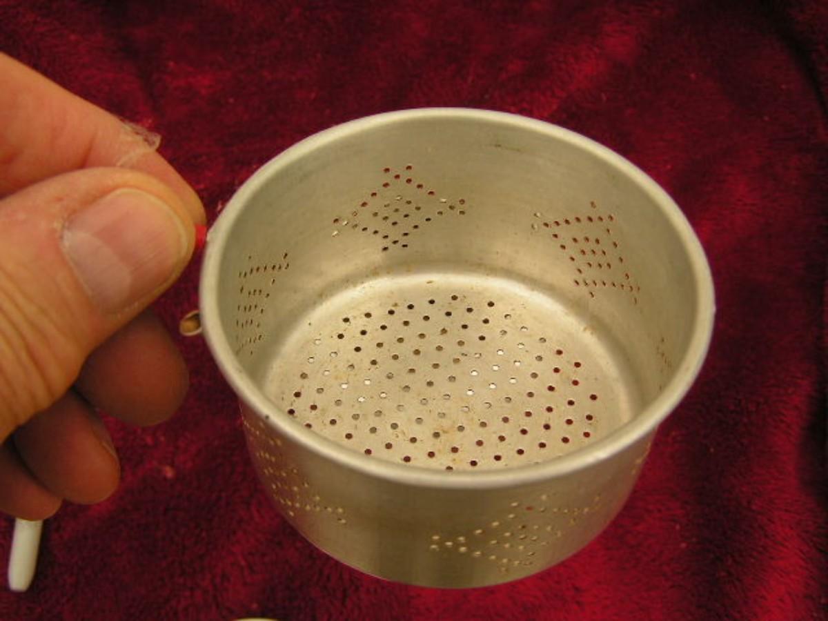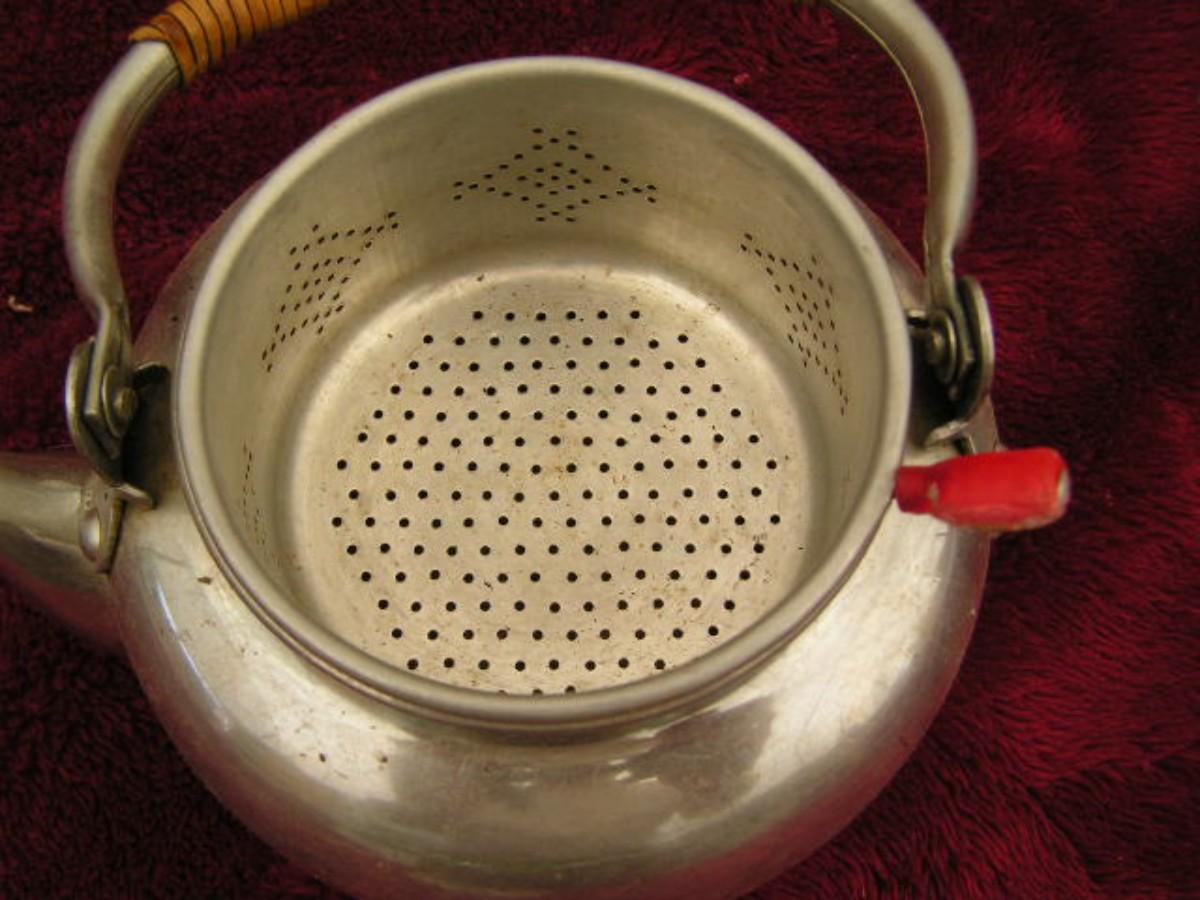 Cute little tea pot w/ a loose tea strainer inside. Folding bail handle.