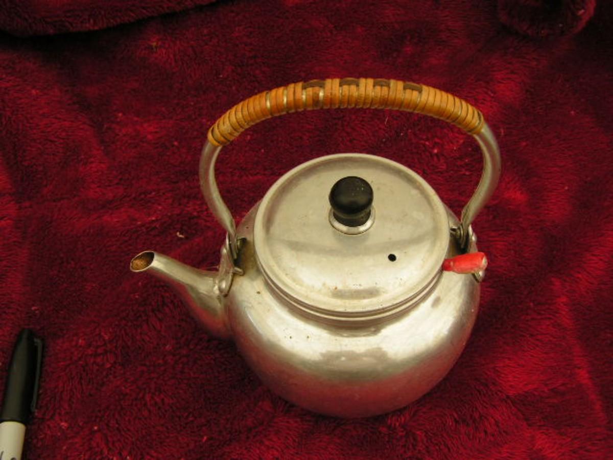 Cute little tea pot w/ a loose tea strainer inside. Folding wicker wrapped bail handle. Might make two cups.