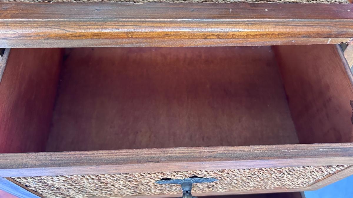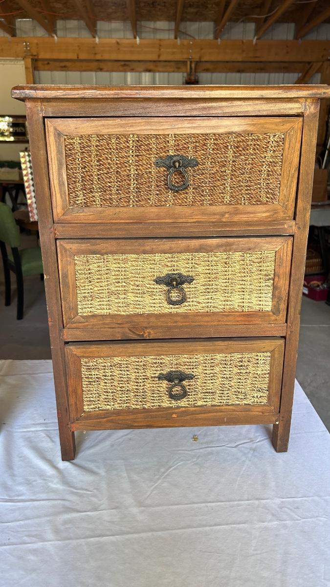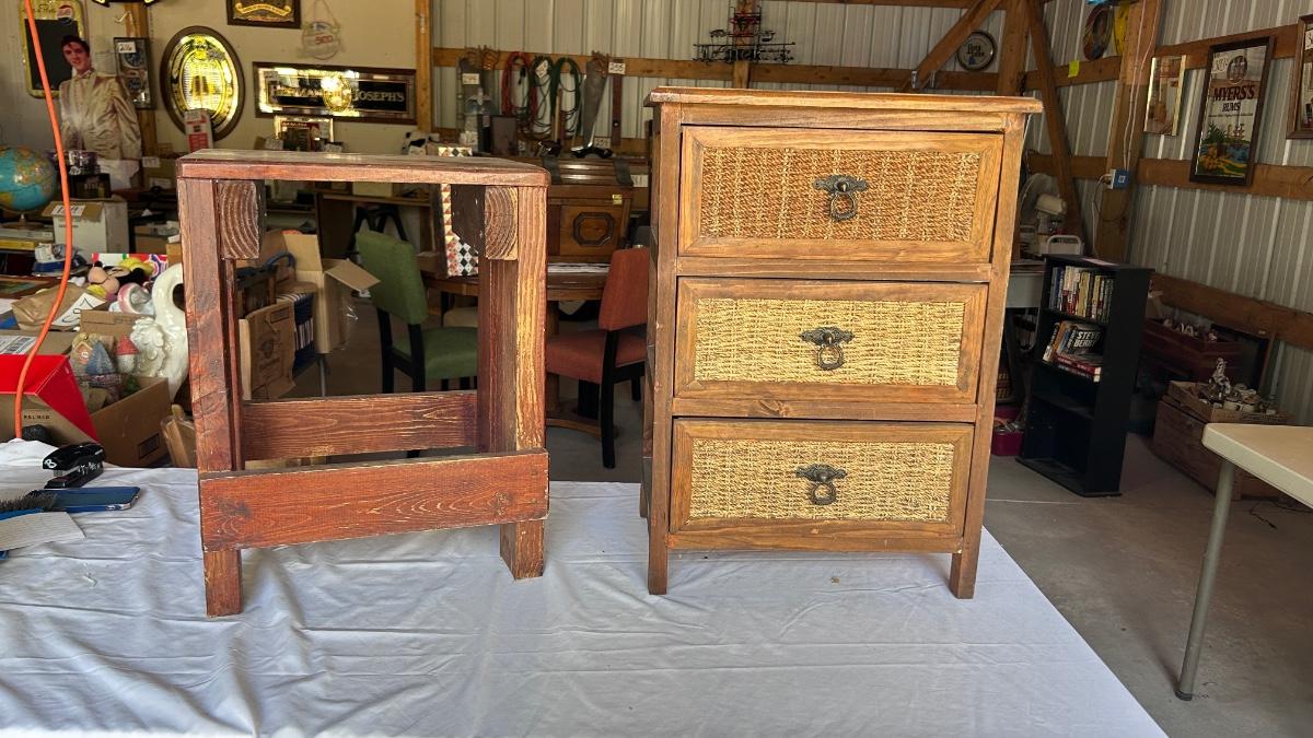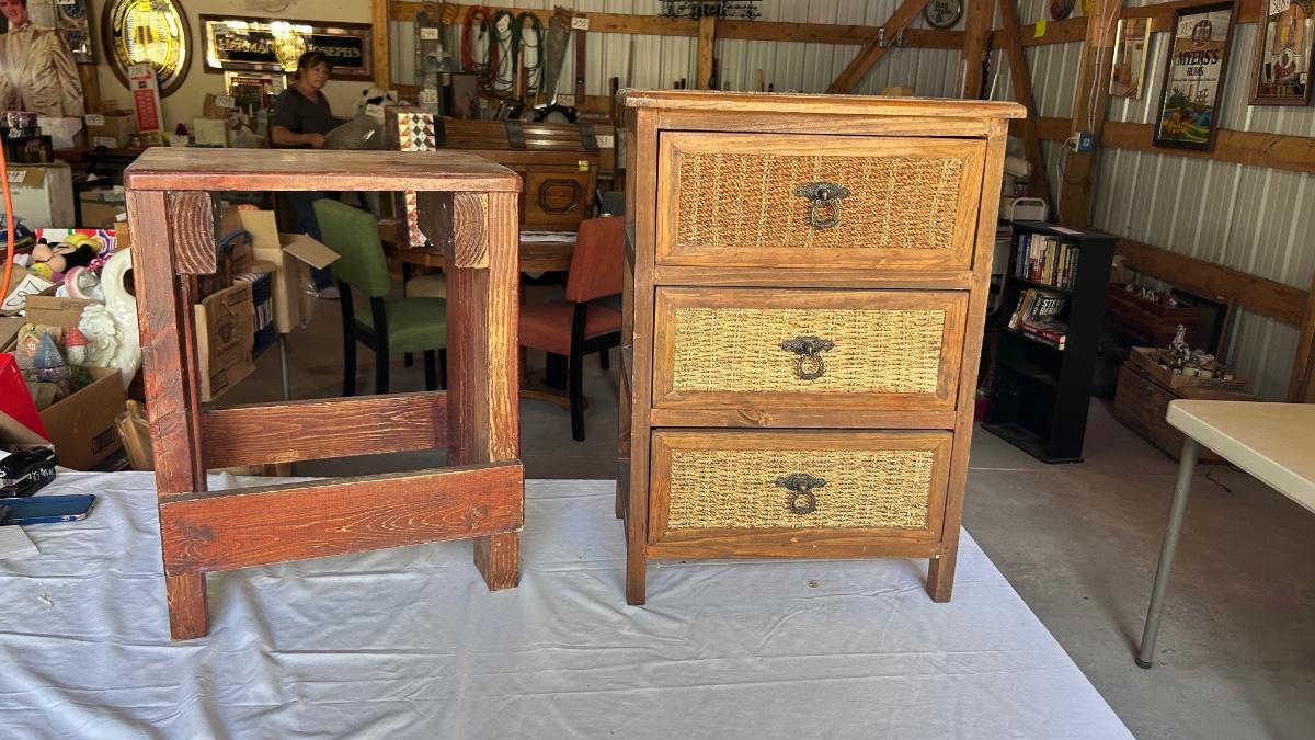 CUTE LITTLE WICKER DRAWER FRONT CHEST AND HOMEMADE WOODEN PLANT-STAND/SIDE TABLE