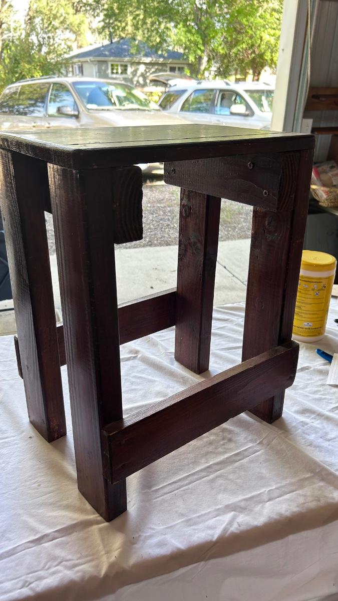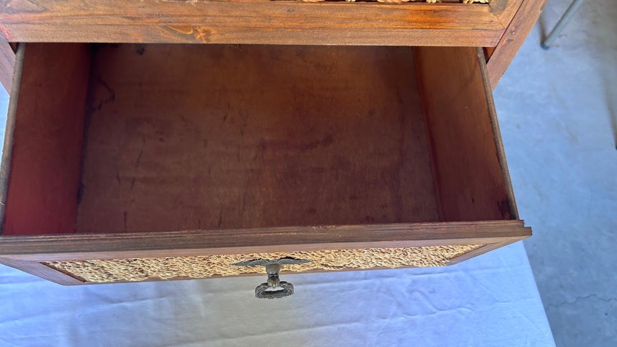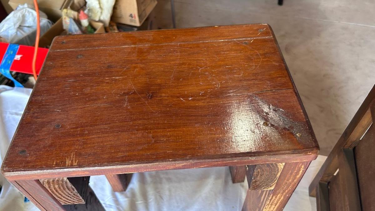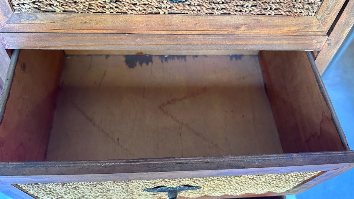 CUTE LITTLE WICKER DRAWER FRONT CHEST AND HOMEMADE WOODEN PLANT-STAND/SIDE TABLE