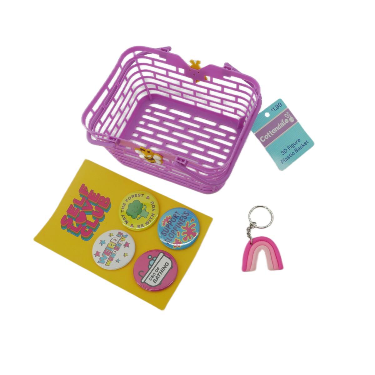 Cute miscellaneous item lot, small basket with bee, four pins, and pink rainbow keychain