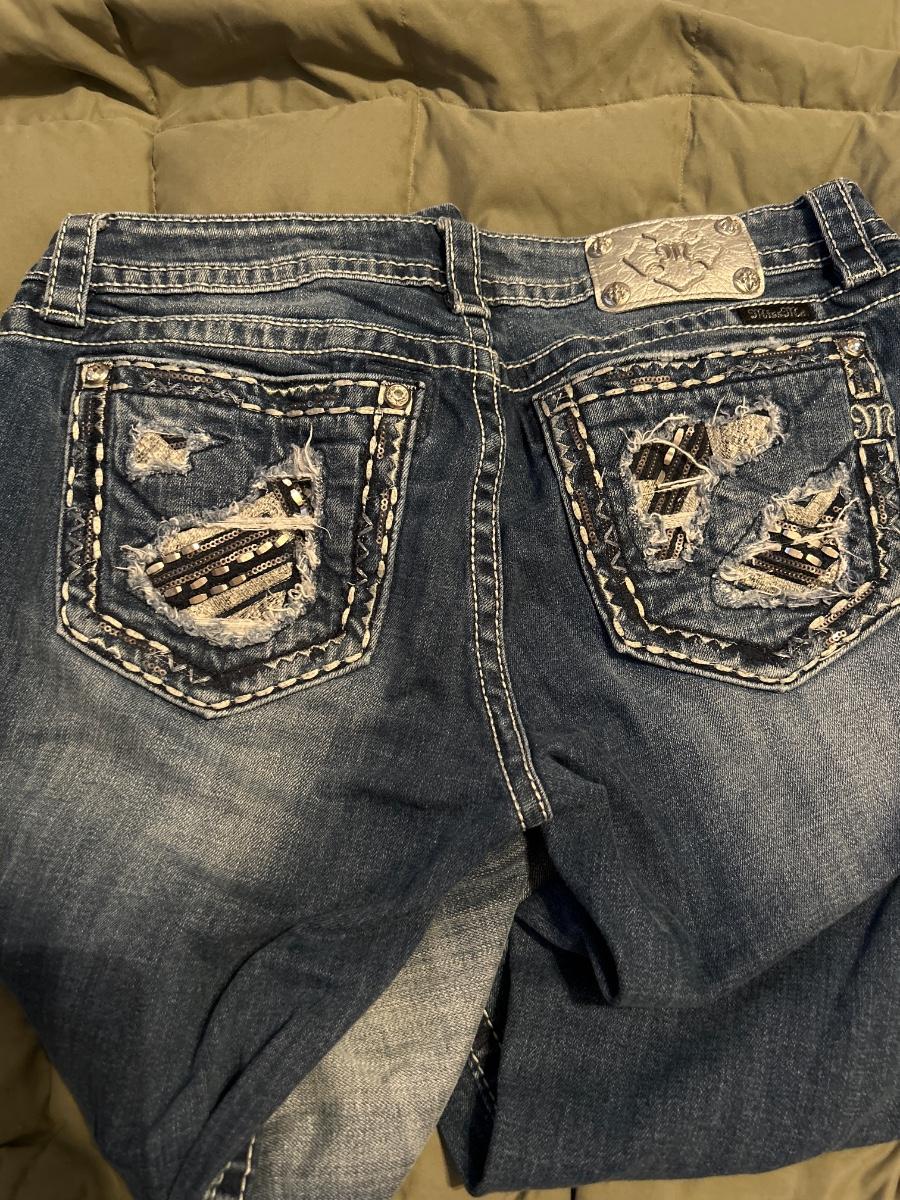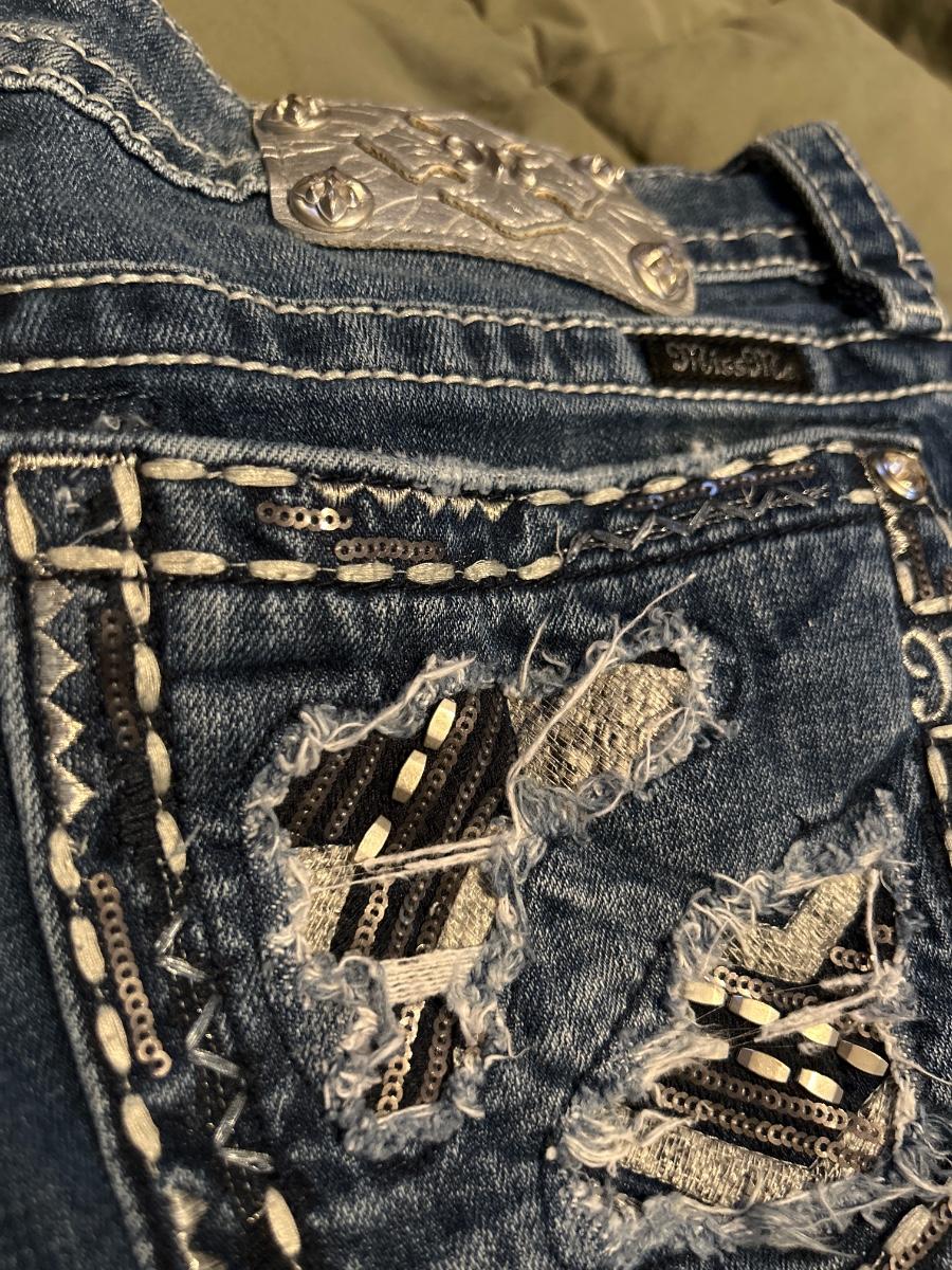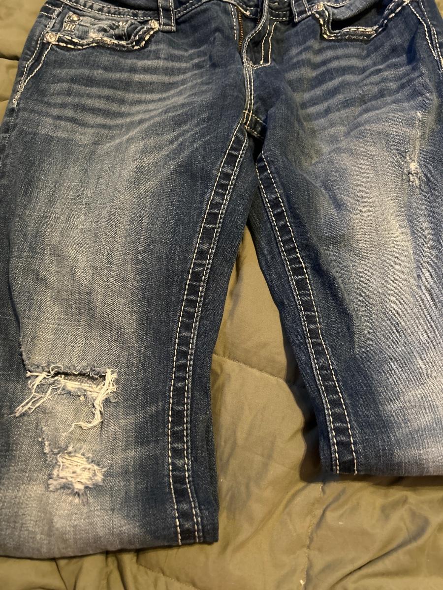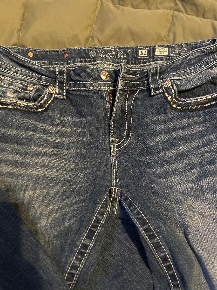 These are in great shape. The only issue they have is one of the rhinestones on the butt pocket is missing. Size 31, length 30” They were professionally hemmed.