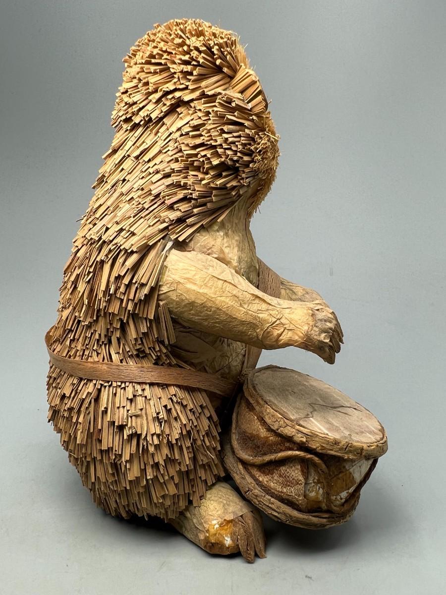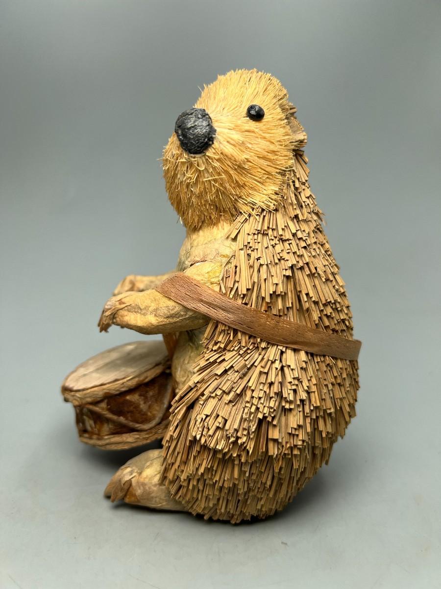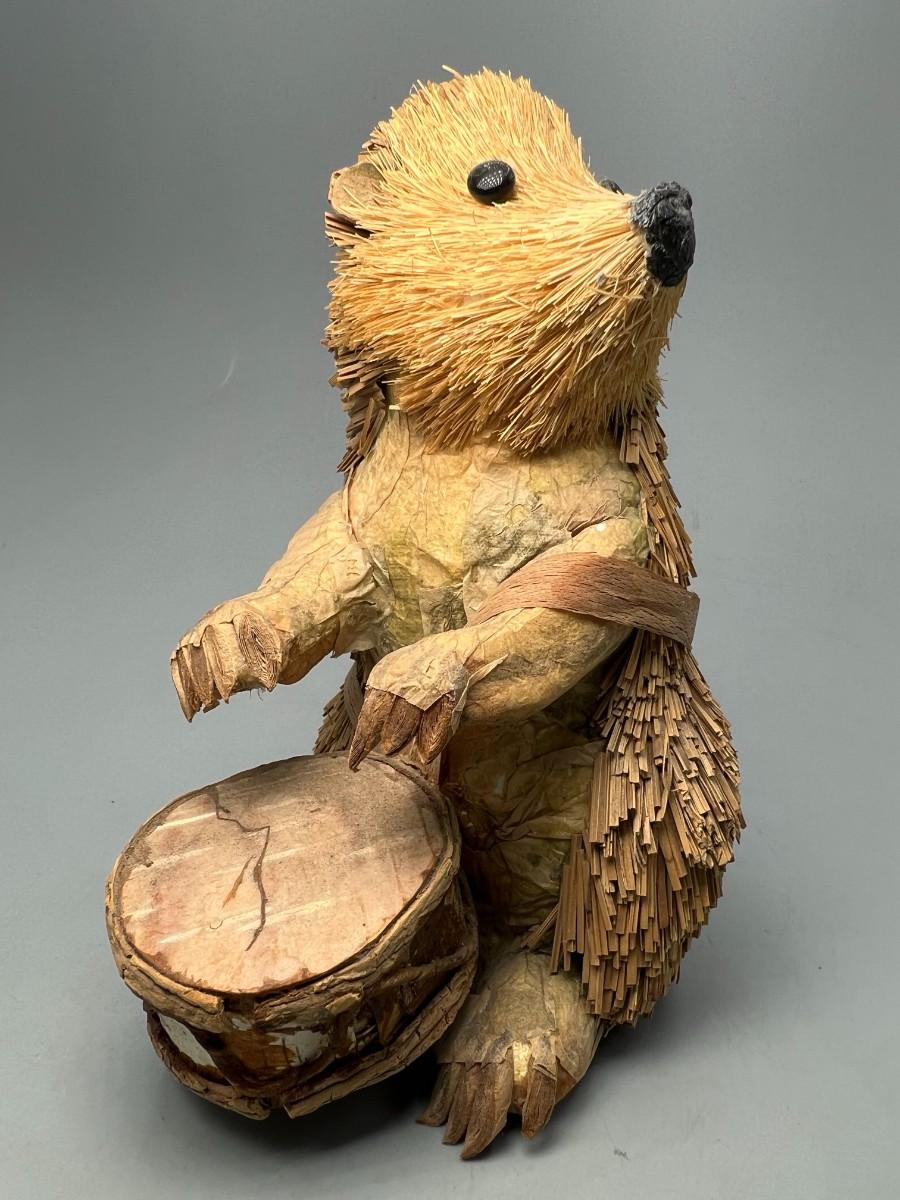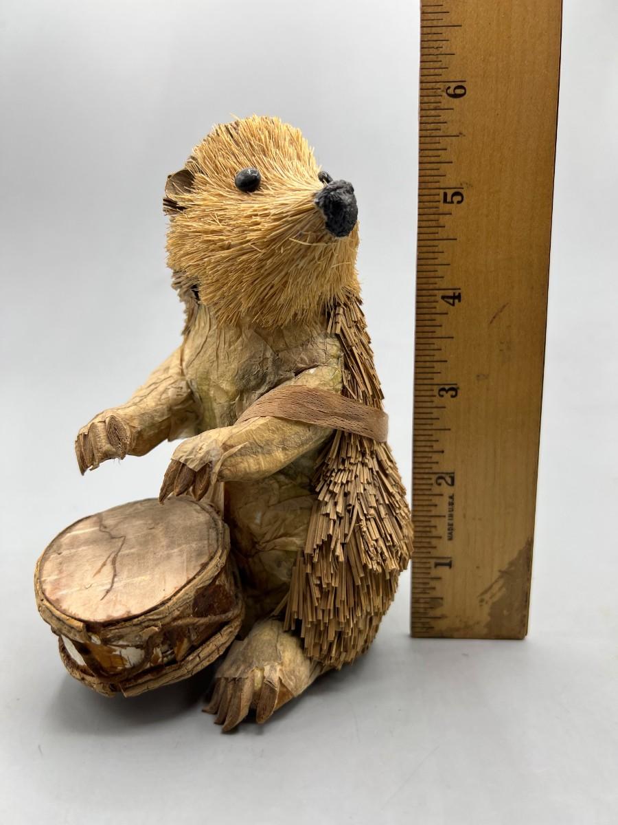 Cute Natural Fiber Hedgehog Playing Drum Figurine. In good condition. Small under 6" size.