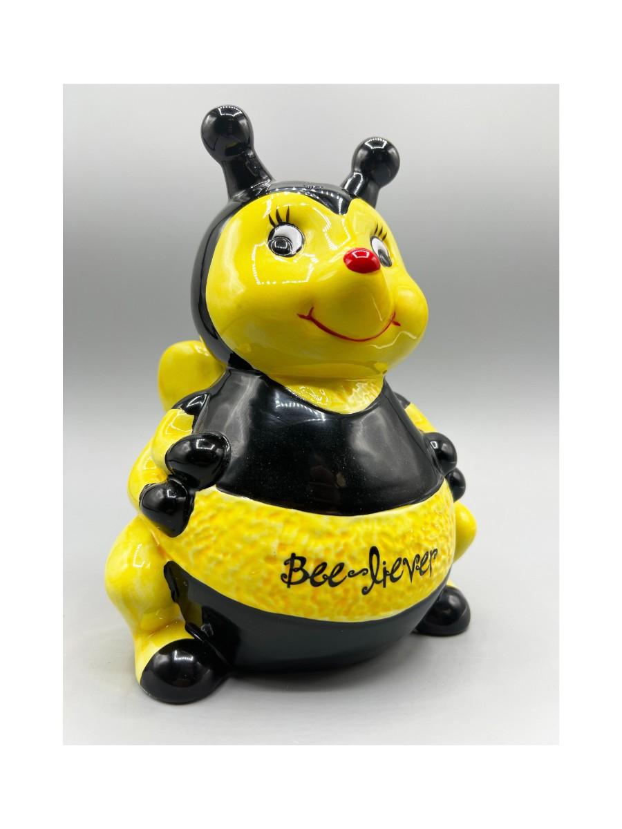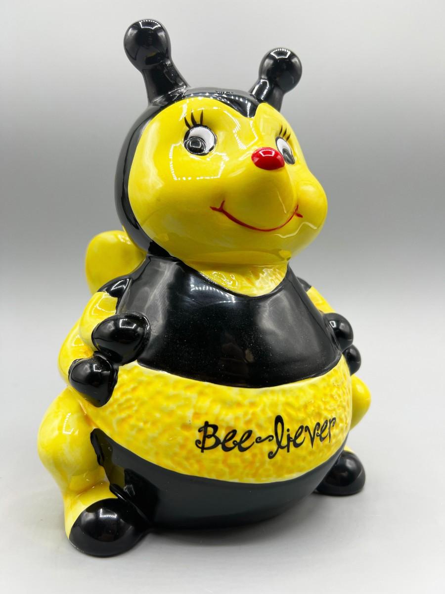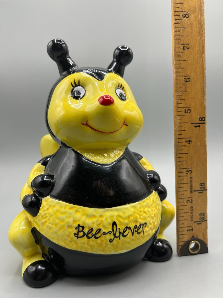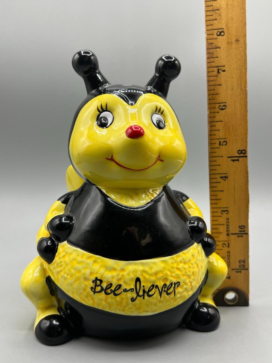 Novelty bumble bee coin bank. Ceramic bank with a smiling bee, has Bee-liever written across its belly. In good condition. About 7" size.