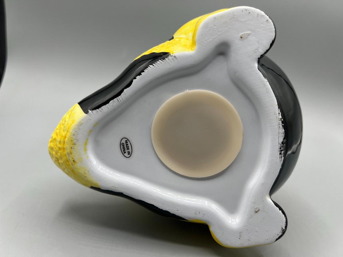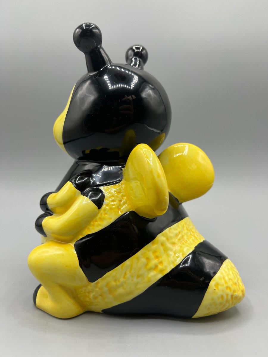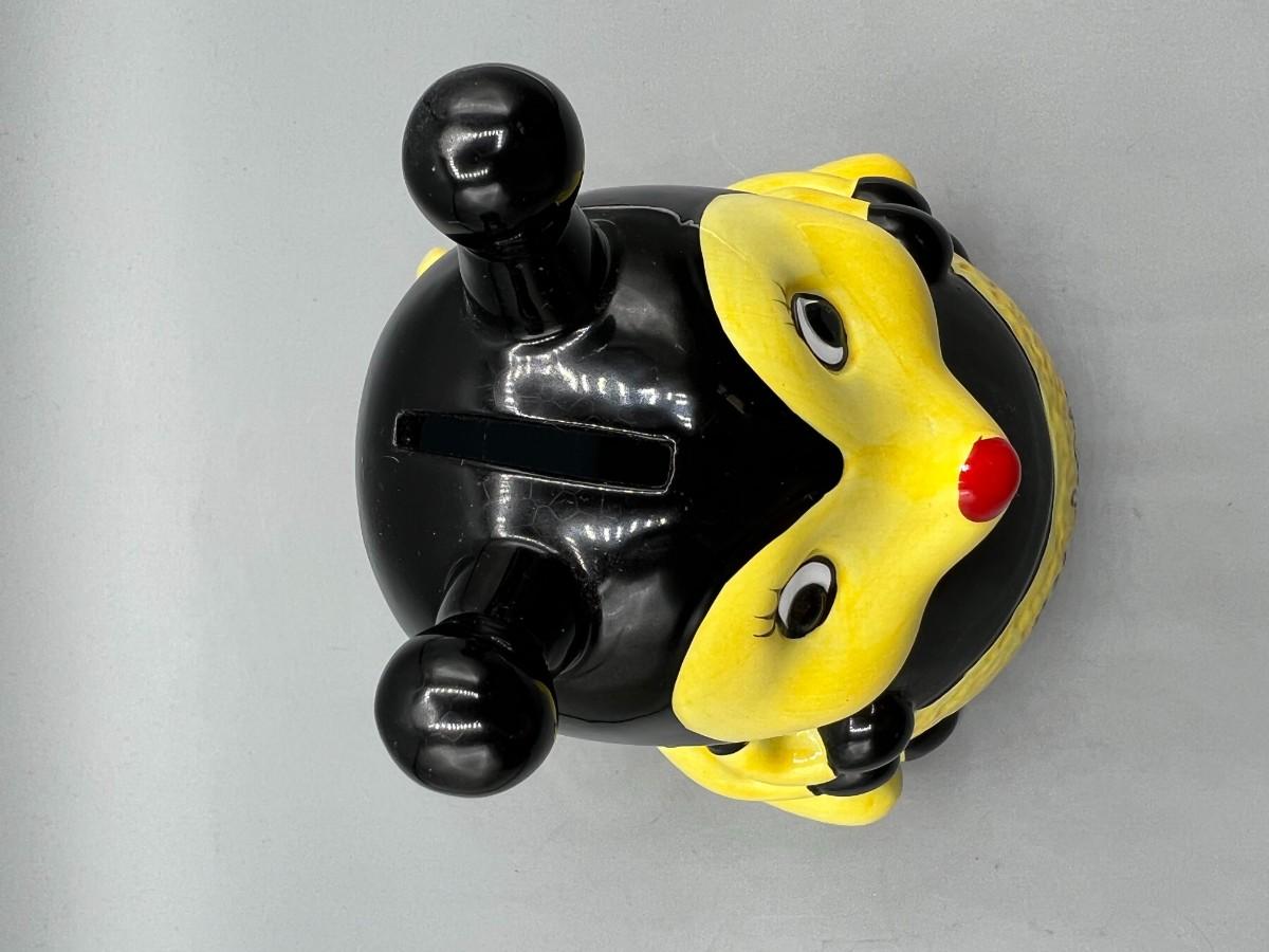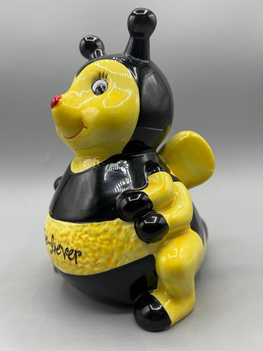 Novelty bumble bee coin bank. Ceramic bank with a smiling bee, has Bee-liever written across its belly. In good condition. About 7" size.