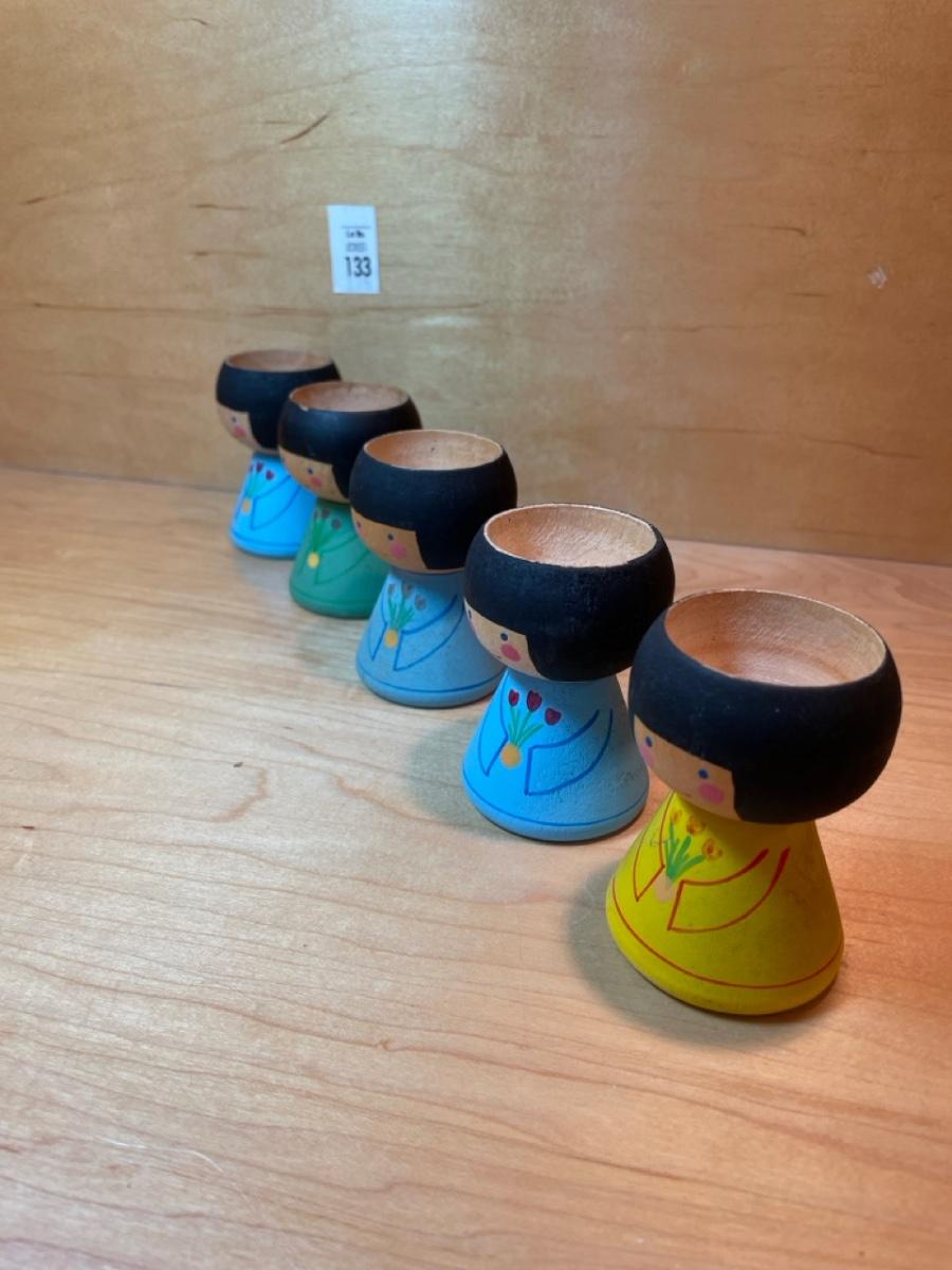 Hand painted wood. 5 in all. 3 blue, 1 green and 1 yellow.