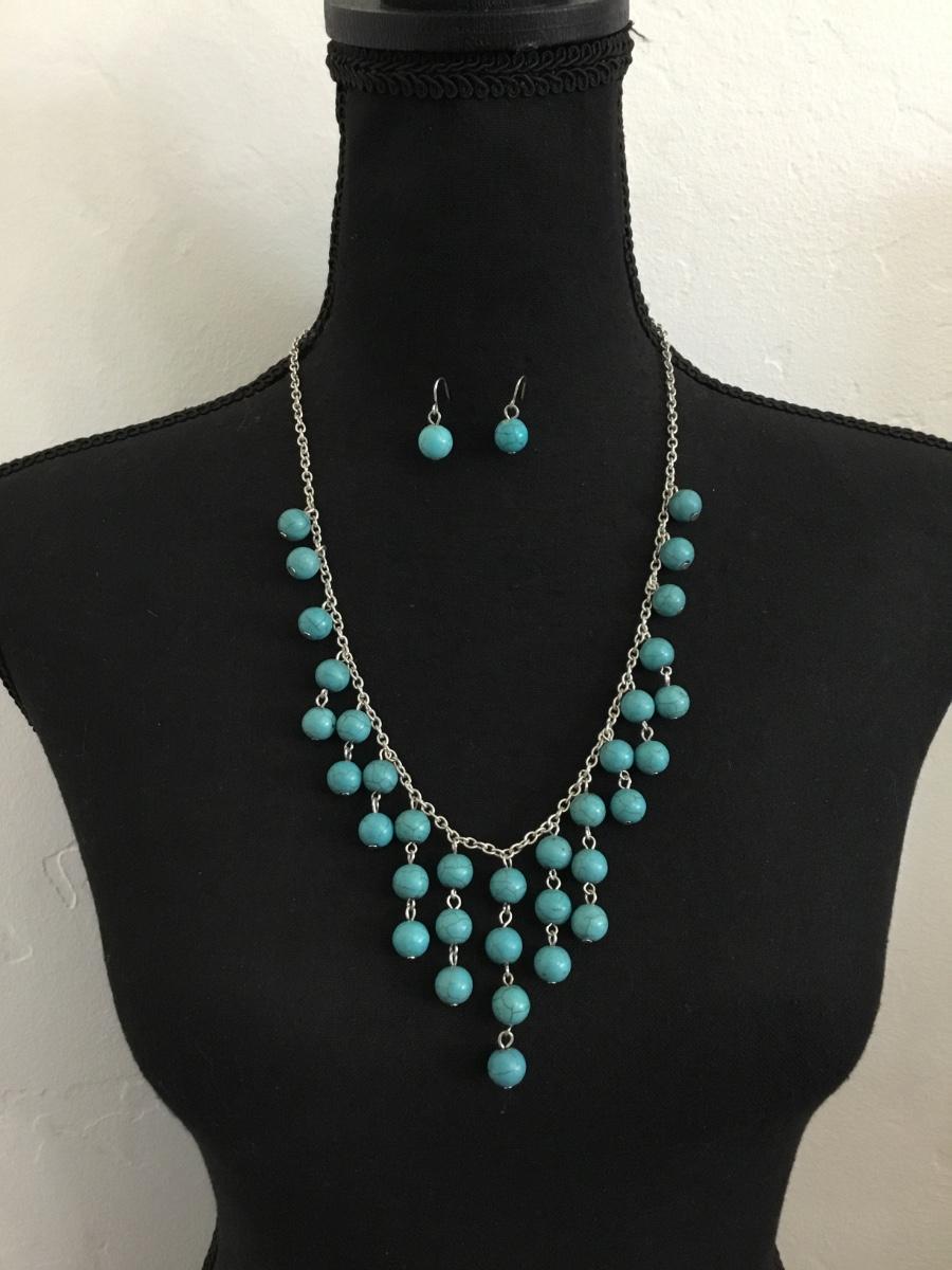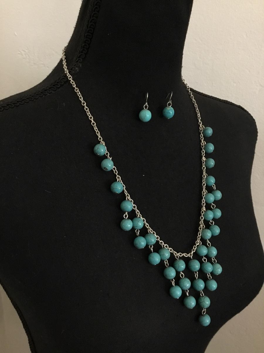 Cute Silver tone faux, turquoise, stone bead, statement, necklace, matching earrings