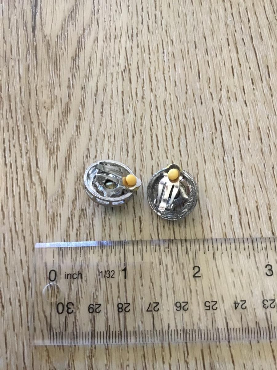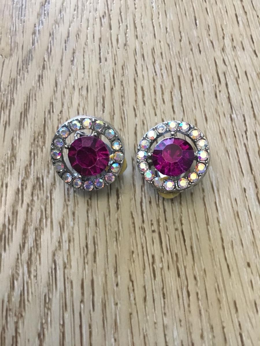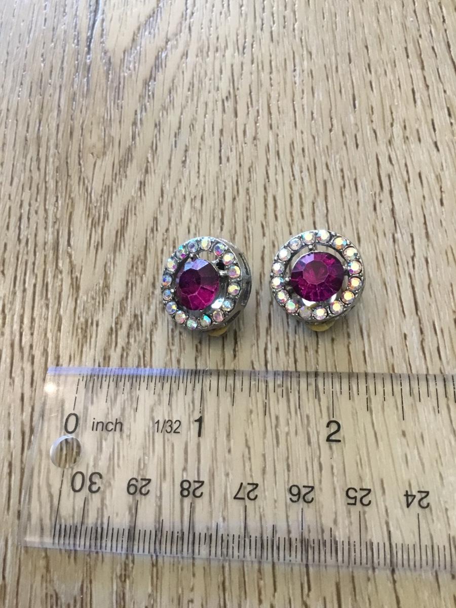 Cute Silver tone , purple, iridescent, rhinestone circular clip on earrings